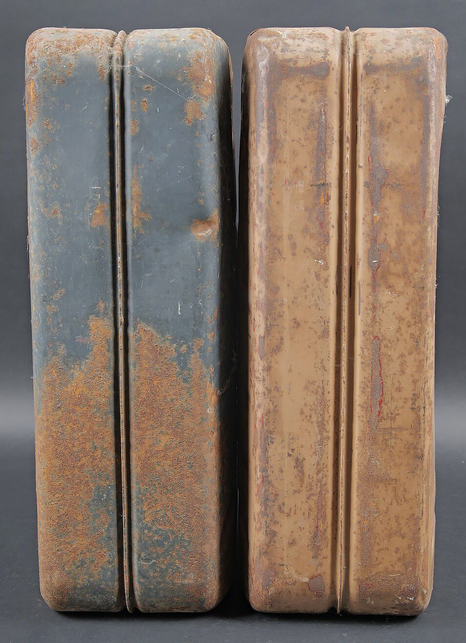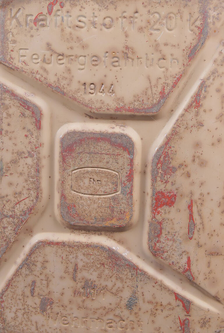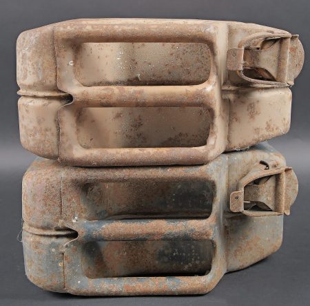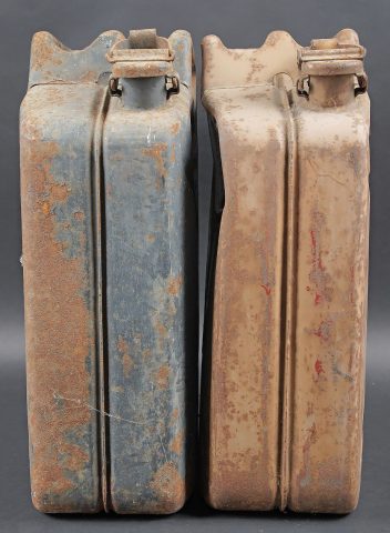 Jerrycans WH. Deux jerrycan à essence en métal. Comprenant un jerrycan, peinture à 40%. Déformation au dos. Le bouchon est complet. Marquages Kraftstoff 20L Feuergefährlich 1943, Wehrmacht, code fabricant illisible, marquage 20 peint, numéro 67. Un jerrycan, peinture jaune sable à 60%. Bouchon complet. Marquages Kraftstoff 20L Feuergefährlich 1944, Wehrmacht, code fabricant FHM, numéro 111. A noter une certaine usure et oxydation de la pièce. Etat II+. WH fuel jerrycans. Two metal cans. 40% paint, rear panel deformed, complete cap, marked Kraftstoff 20L Feuergefährlich 1943, Wehrmacht, maker code illegible, painted 20, number 67. 60% sand-yellow paint, complete cap, marked Kraftstoff 20L Feuergefährlich 1944, Wehrmacht, maker FHM, number 111. Showing wear and oxidation. Condition II+.