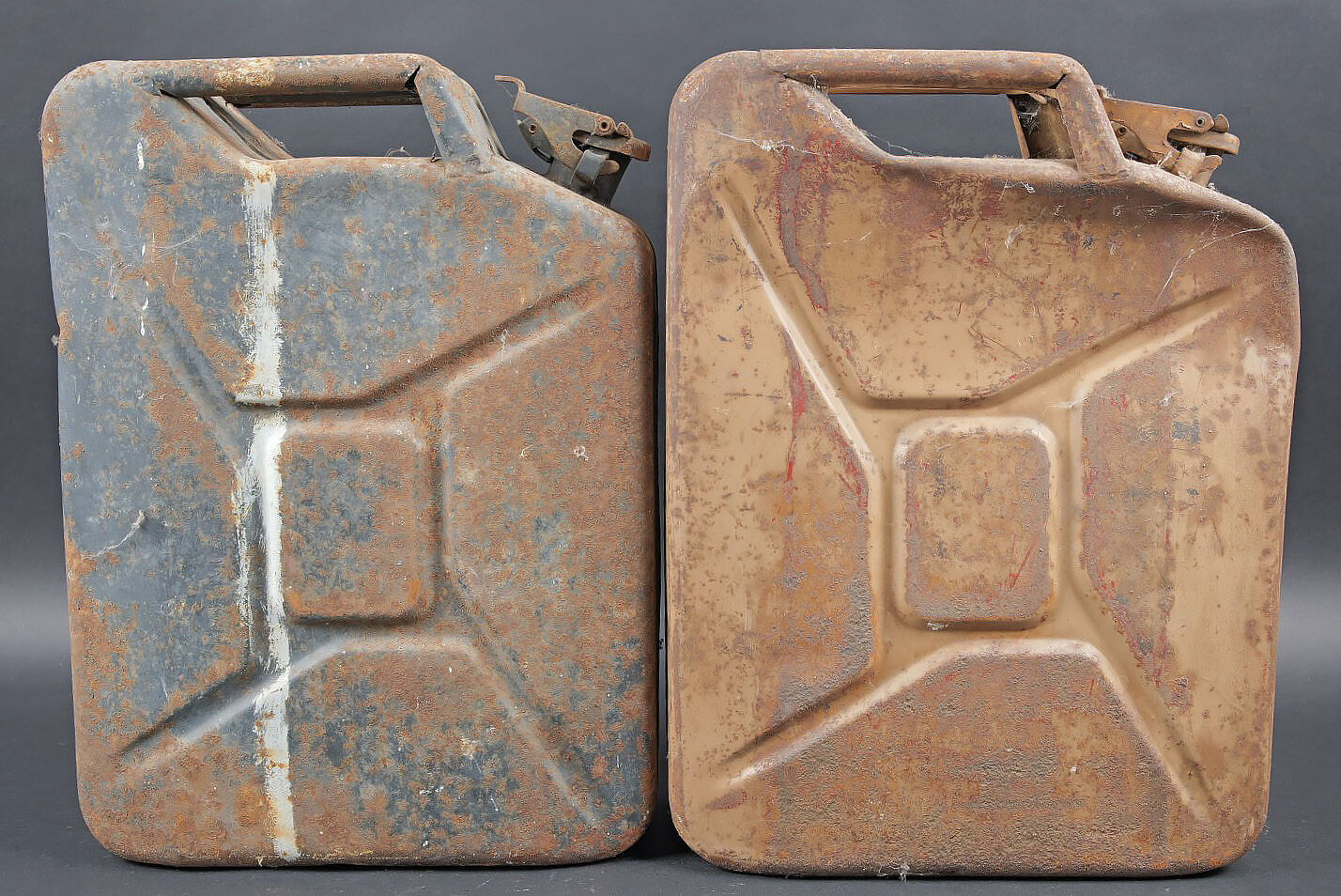 Jerrycans WH. Deux jerrycan à essence en métal. Comprenant un jerrycan, peinture à 40%. Déformation au dos. Le bouchon est complet. Marquages Kraftstoff 20L Feuergefährlich 1943, Wehrmacht,... en savoir plus