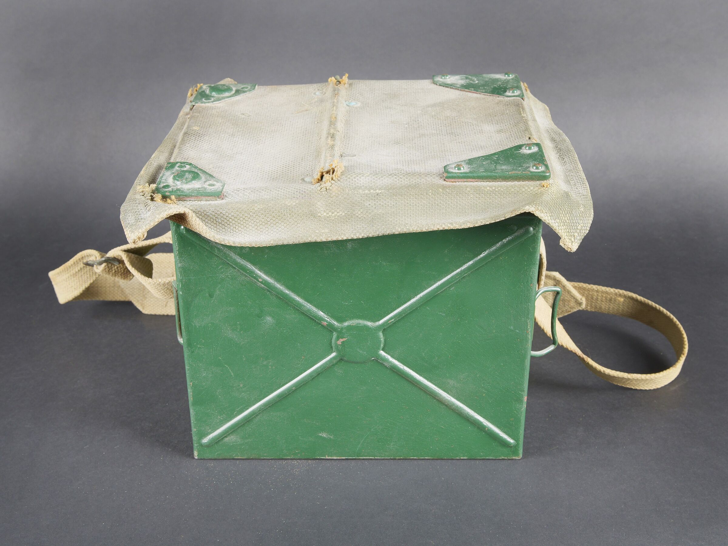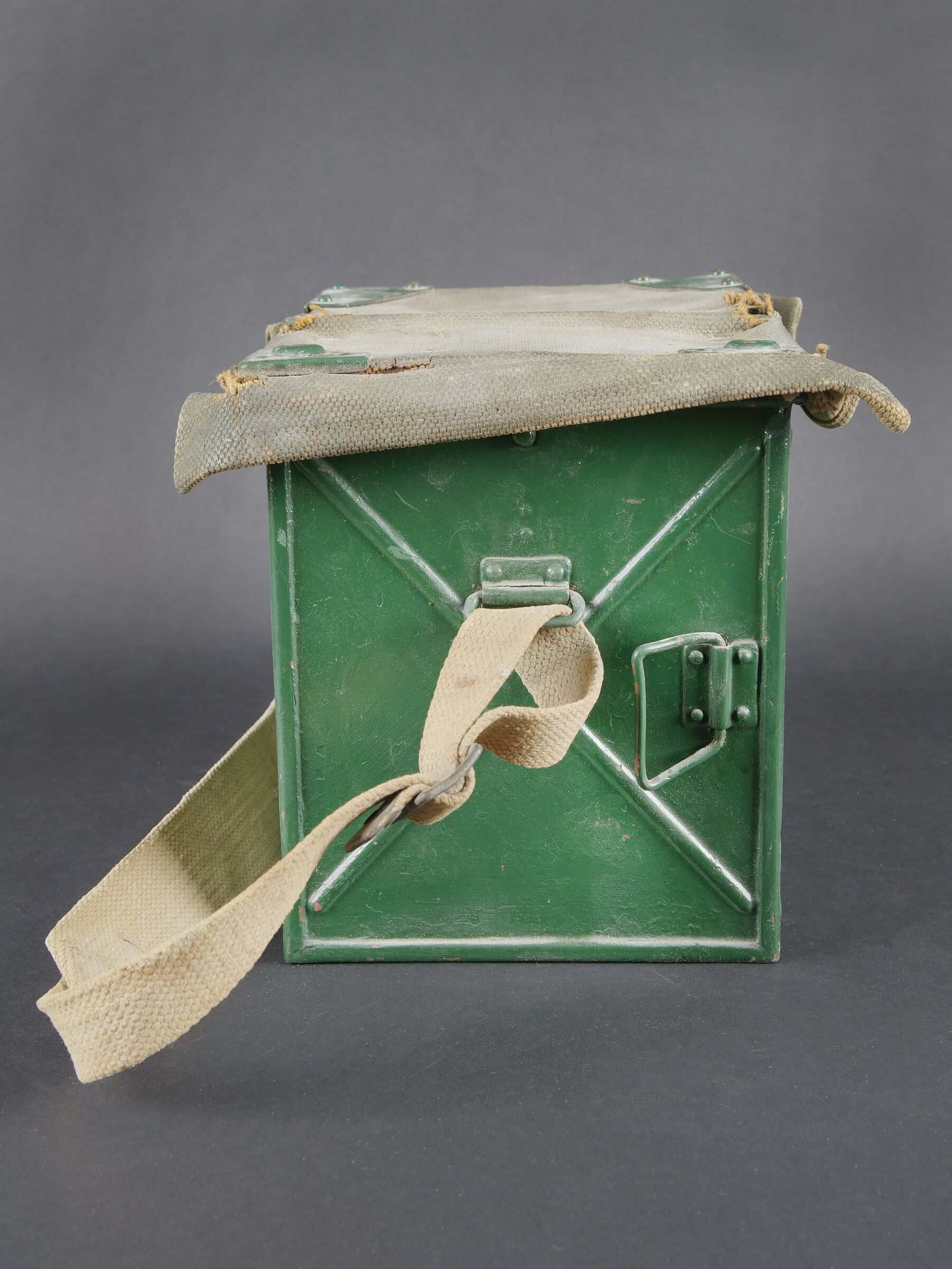 Détails de la vente >Lampe de signalisation britannique. Belle caisse en métal. Peinture vert foncé postérieur. Couvercle recouvert d’une toile web blancôtée. La sangle de transport est présente. Lampe de... en savoir plus
