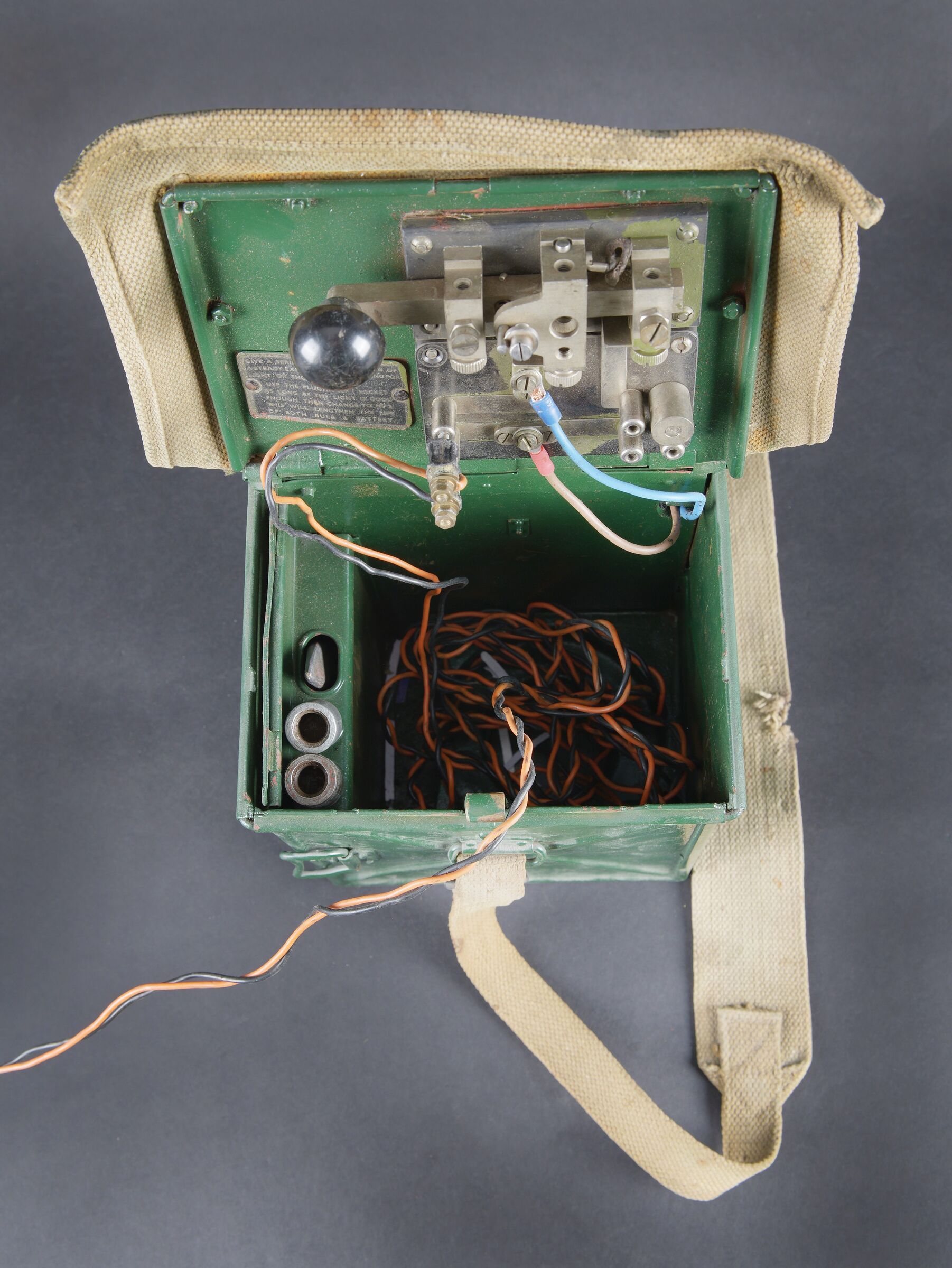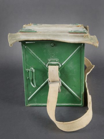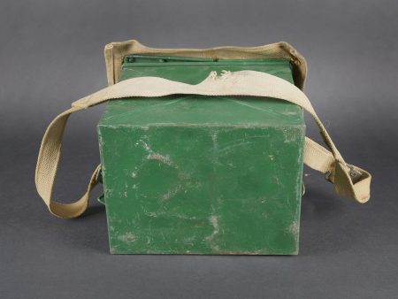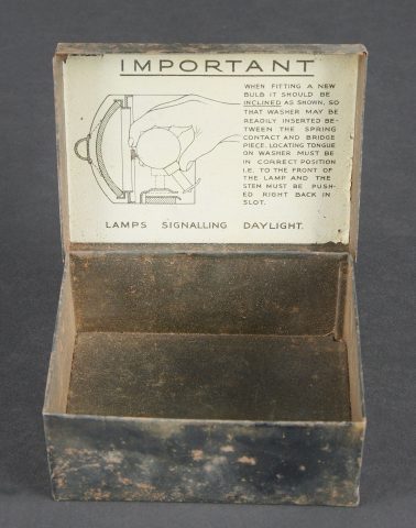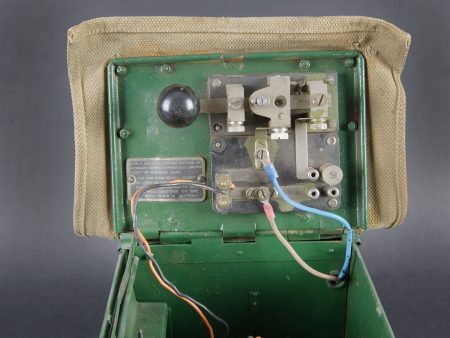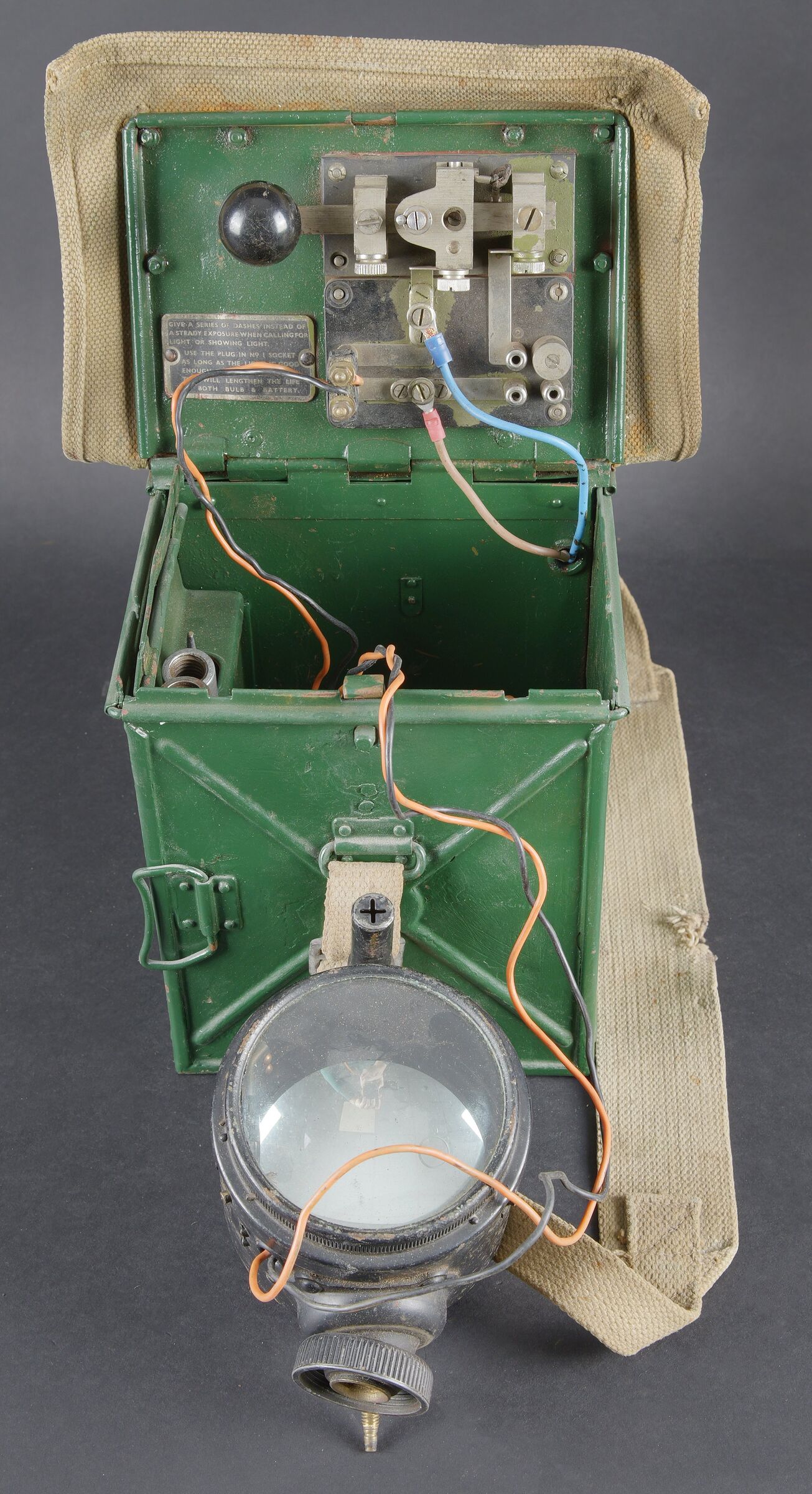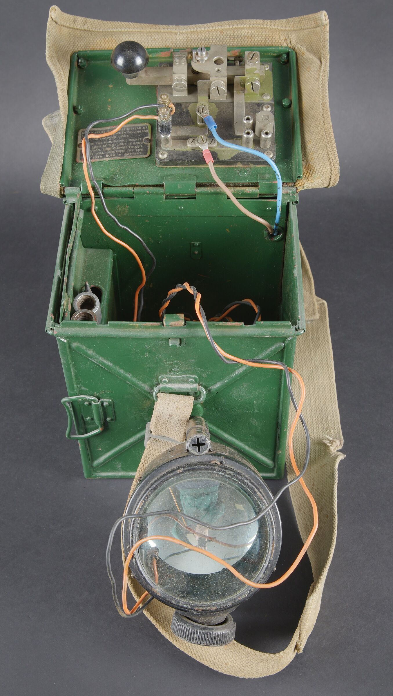 Lampe de signalisation britannique. Belle caisse en métal. Peinture vert foncé postérieur. Couvercle recouvert d’une toile web blancôtée. La sangle de transport est présente. Lampe de signalisation complète, avec son verre. Les câbles semblent postérieurs. Manipulateur morse présent. A noter une certaine usure et patine de la pièce. Etat II+. Lampe à signaux est un projecteur spécialement conçu pour transmettre des signaux lumineux codés selon l’alphabet Morse dénommé SCOTT. British signal lamp. Fine metal transit case with later dark green repaint. Lid covered in web canvas. The carrying strap is present. Complete signal lamp with its glass, the wiring appearing to be of later replacement. Morse key present. Noteworthy overall wear and an attractive period patina. Condition II+. This signal lamp is a projector specially designed for the transmission of coded light signals in accordance with the Morse alphabet, known as the SCOTT system.