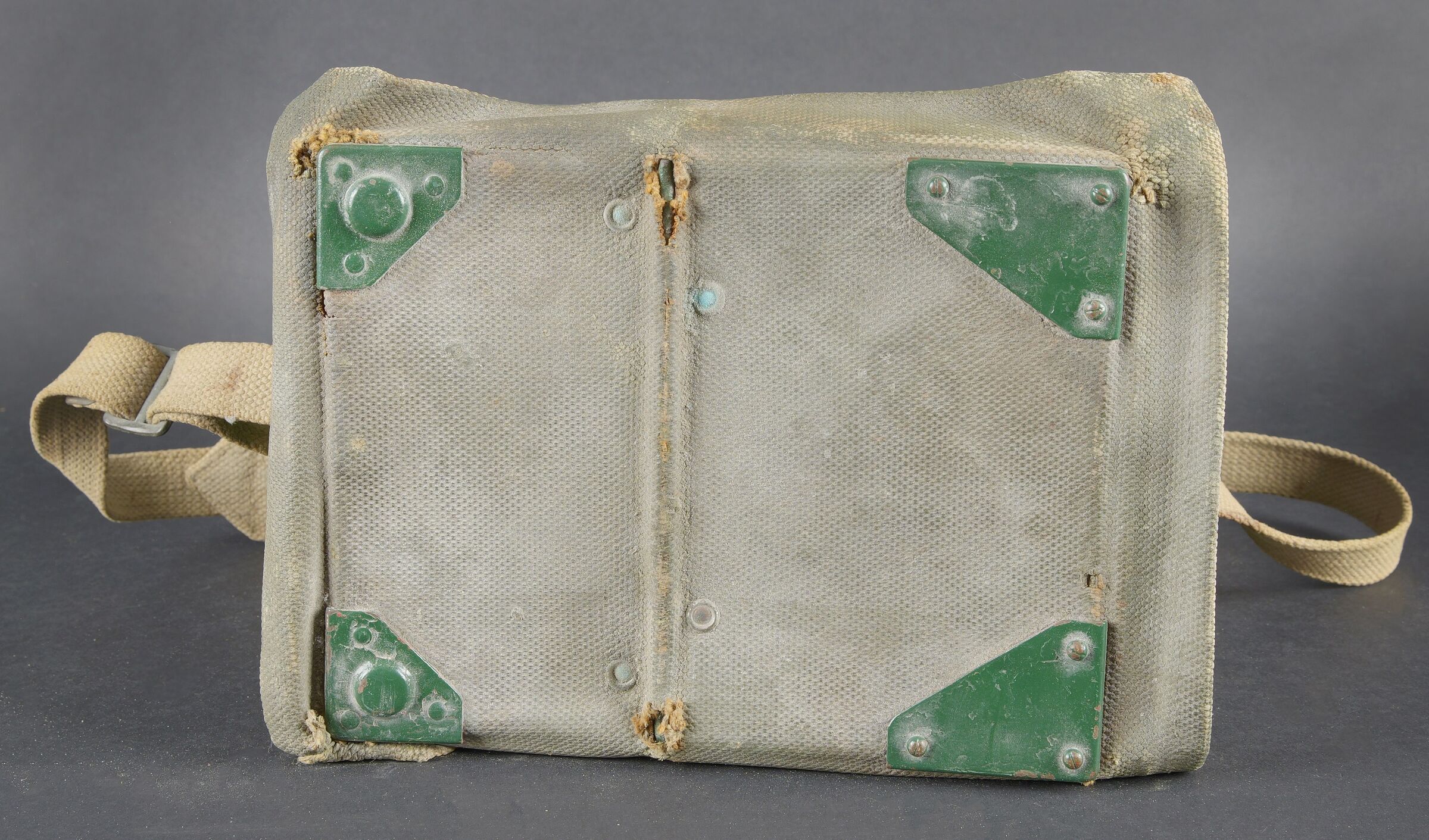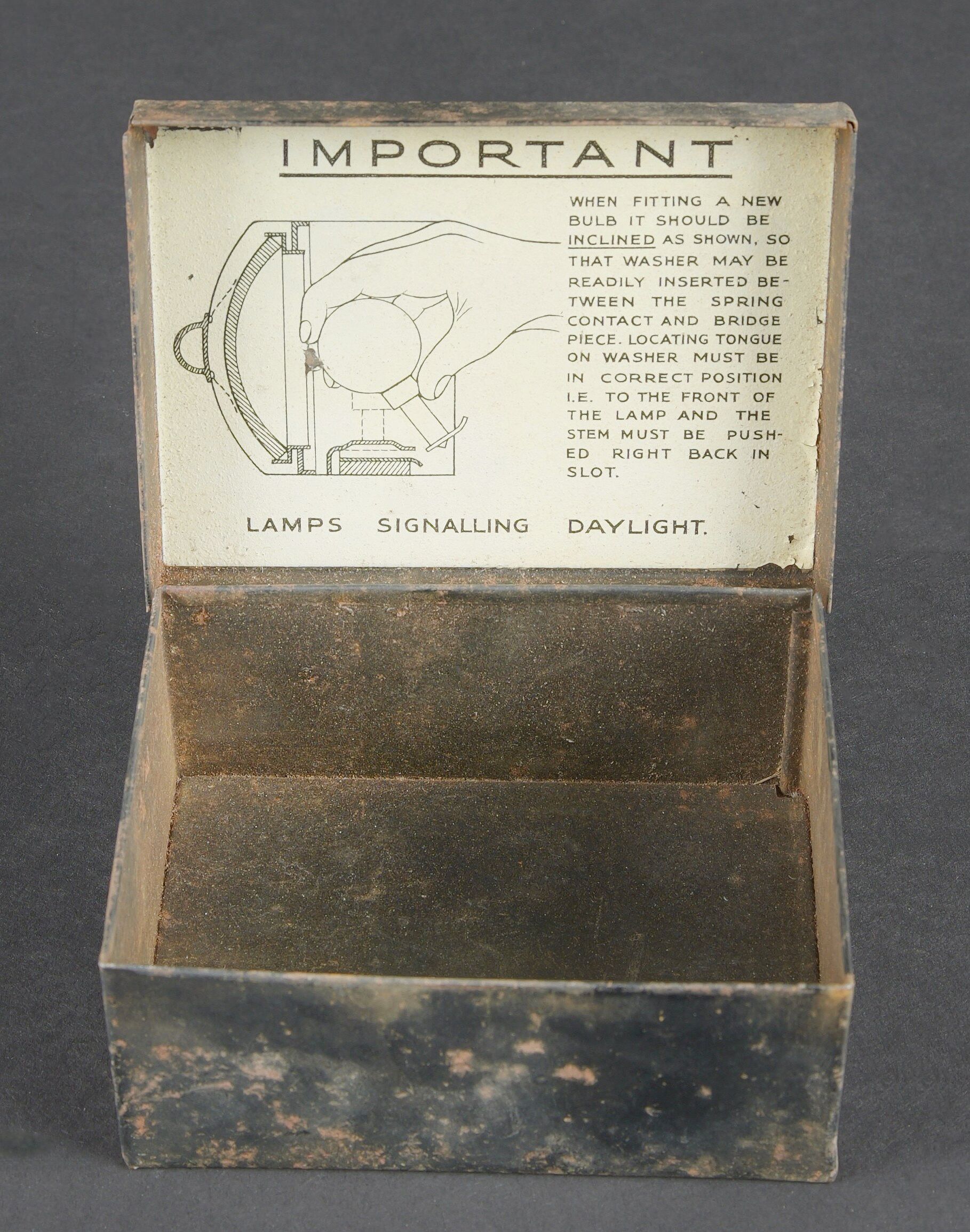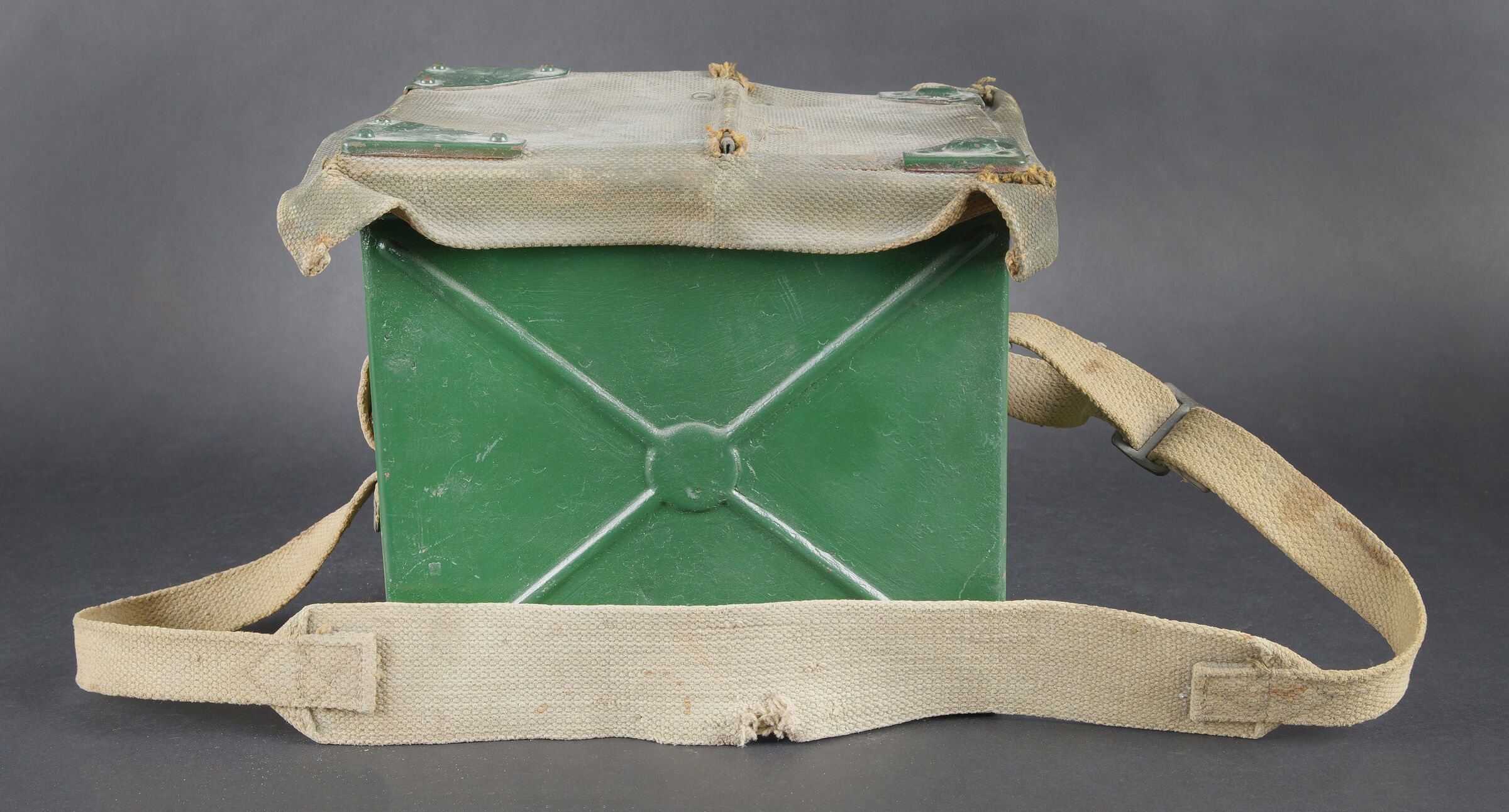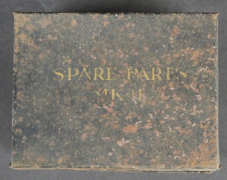Lampe de signalisation britannique. Belle caisse en métal. Peinture vert foncé postérieur. Couvercle recouvert d’une toile web blancôtée. La sangle de transport est présente. Lampe de signalisation complète, avec son verre. Les câbles semblent postérieurs. Manipulateur morse présent. A noter une certaine usure et patine de la pièce. Etat II+. Lampe à signaux est un projecteur spécialement conçu pour transmettre des signaux lumineux codés selon l’alphabet Morse dénommé SCOTT. British signal lamp. Fine metal transit case with later dark green repaint. Lid covered in web canvas. The carrying strap is present. Complete signal lamp with its glass, the wiring appearing to be of later replacement. Morse key present. Noteworthy overall wear and an attractive period patina. Condition II+. This signal lamp is a projector specially designed for the transmission of coded light signals in accordance with the Morse alphabet, known as the SCOTT system.