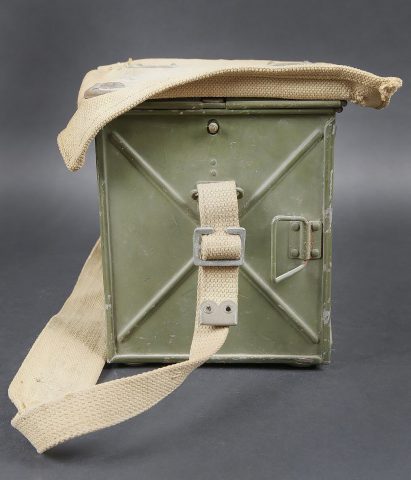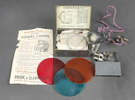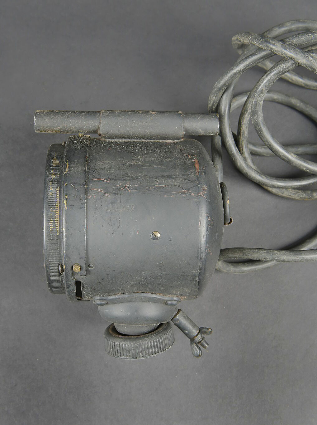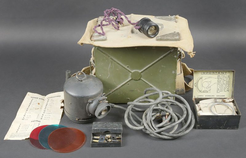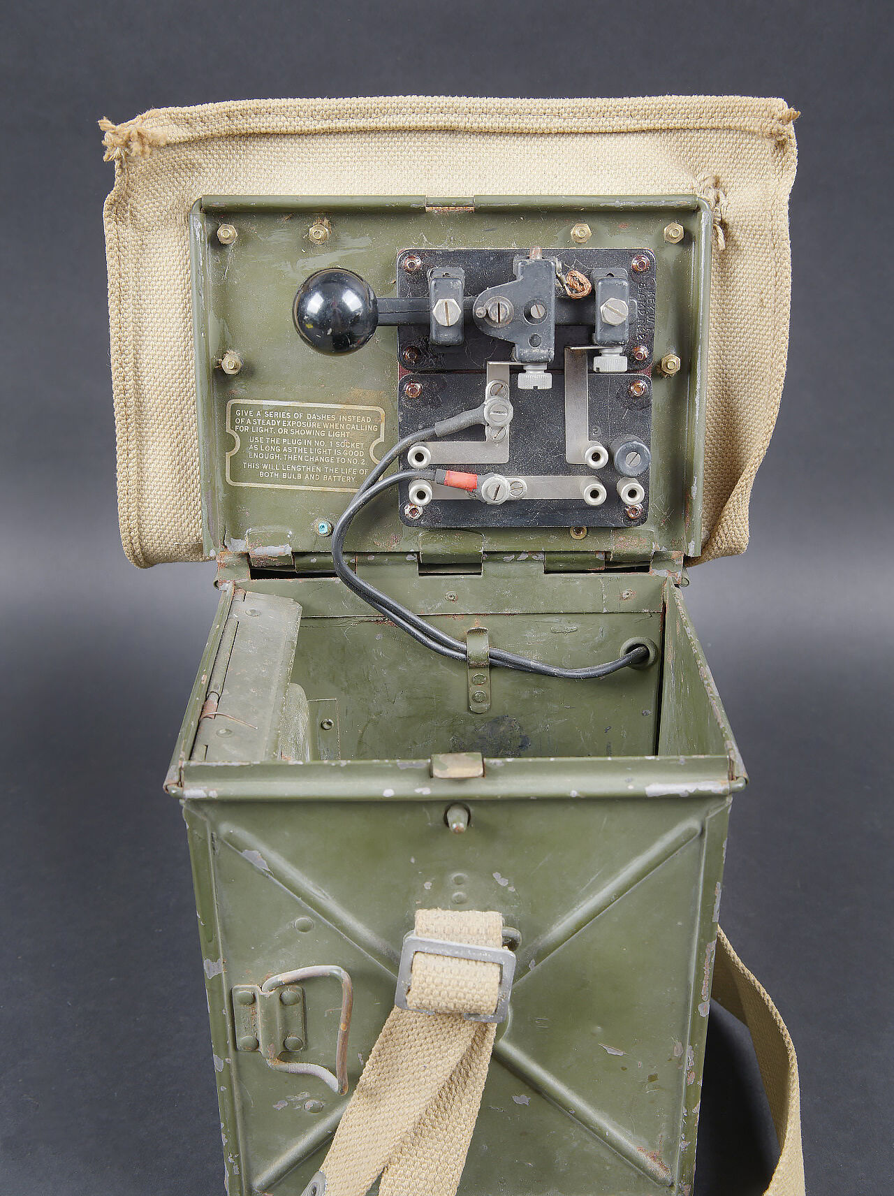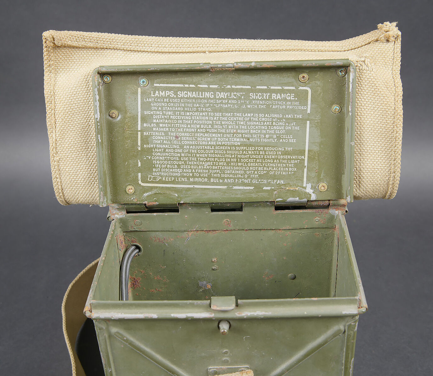 Lampe de signalisation britannique. Belle caisse en métal. Peinture kaki à 70%. Le couvercle est recouvert d’un épais tissu web. La sangle de transport est présente. Lampe complète, ainsi que de nombreux accessoires. A noter une certaine usure et patine de la pièce. Etat II+. Lampe à signaux est un projecteur spécialement conçu pour transmettre des signaux lumineux codés selon l’alphabet Morse dénommé SCOTT. British signal lamp. Fine metal transit case. Khaki paint retained to approximately 70%. The lid is covered with thick webbing fabric. The carrying strap is present. The lamp is complete and accompanied by numerous accessories. Noteworthy overall wear and an attractive period patina. Condition II+. This signal lamp is a projector specifically designed for the transmission of coded light signals in accordance with the Morse alphabet, known as the SCOTT system.