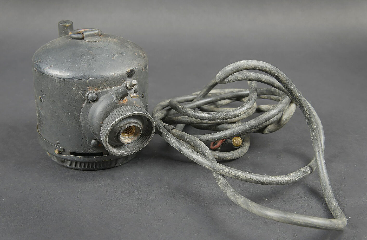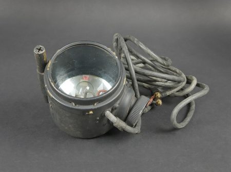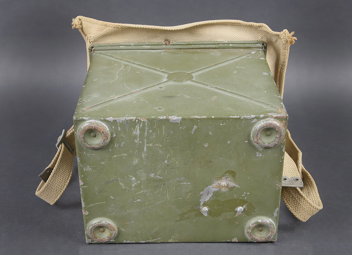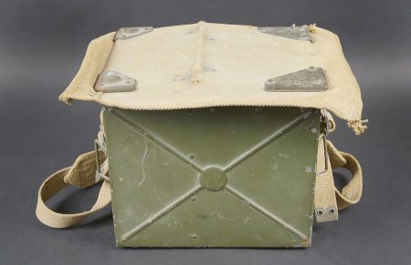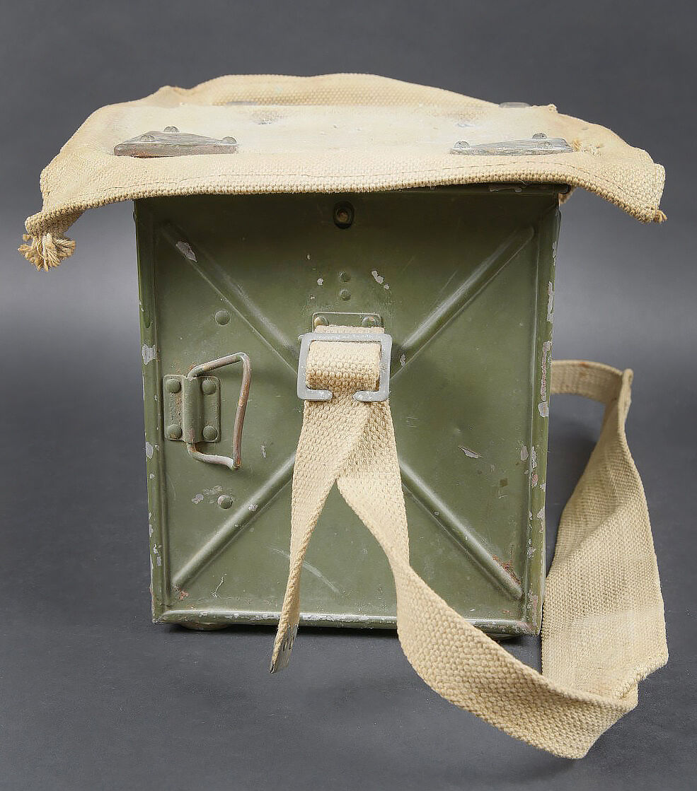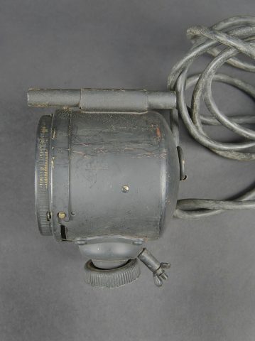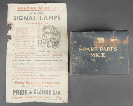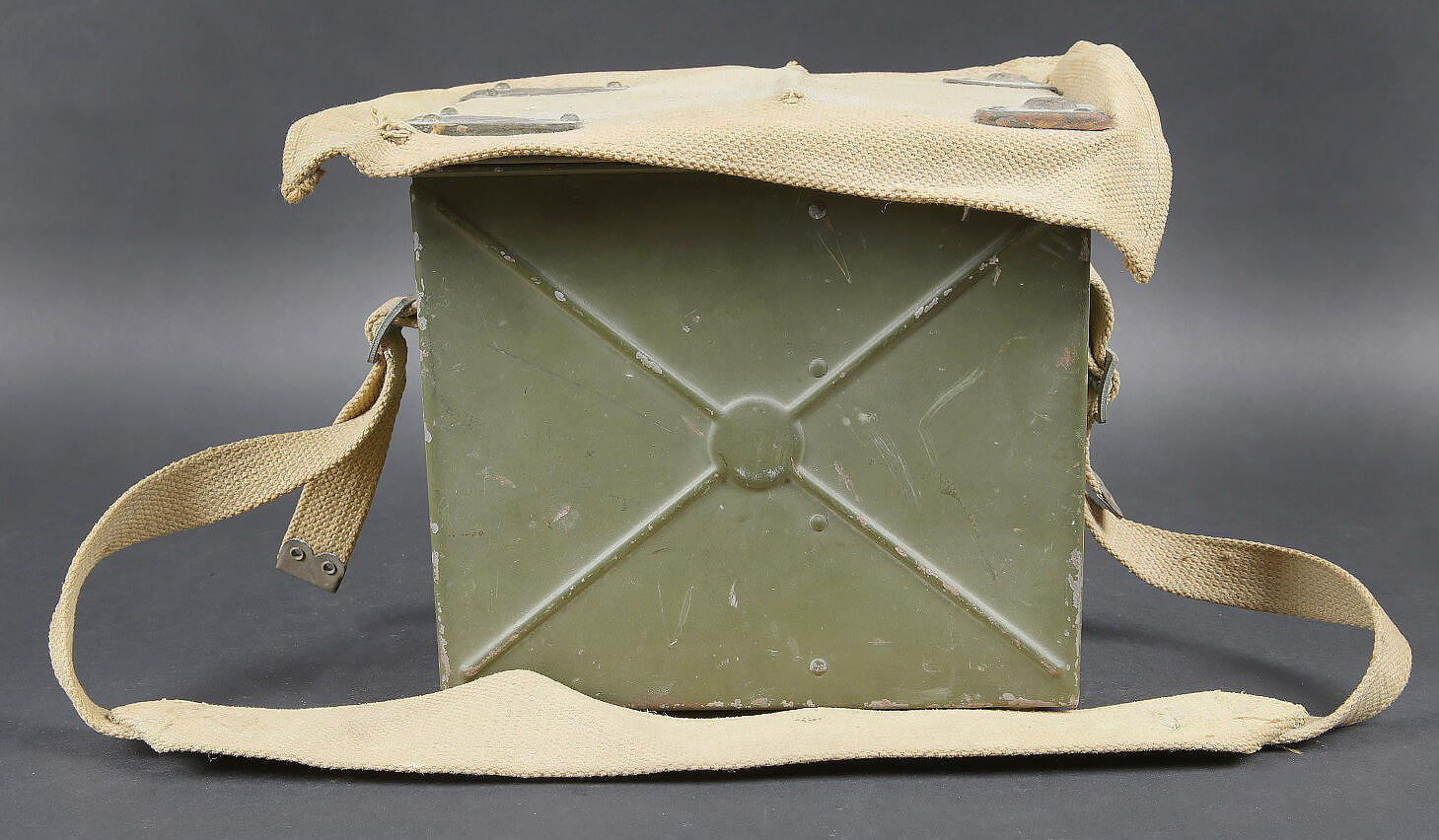 Lampe de signalisation britannique. Belle caisse en métal. Peinture kaki à 70%. Le couvercle est recouvert d’un épais tissu web. La sangle de transport est présente. Lampe complète, ainsi que de nombreux accessoires. A noter une certaine usure et patine de la pièce. Etat II+. Lampe à signaux est un projecteur spécialement conçu pour transmettre des signaux lumineux codés selon l’alphabet Morse dénommé SCOTT. British signal lamp. Fine metal transit case. Khaki paint retained to approximately 70%. The lid is covered with thick webbing fabric. The carrying strap is present. The lamp is complete and accompanied by numerous accessories. Noteworthy overall wear and an attractive period patina. Condition II+. This signal lamp is a projector specifically designed for the transmission of coded light signals in accordance with the Morse alphabet, known as the SCOTT system.