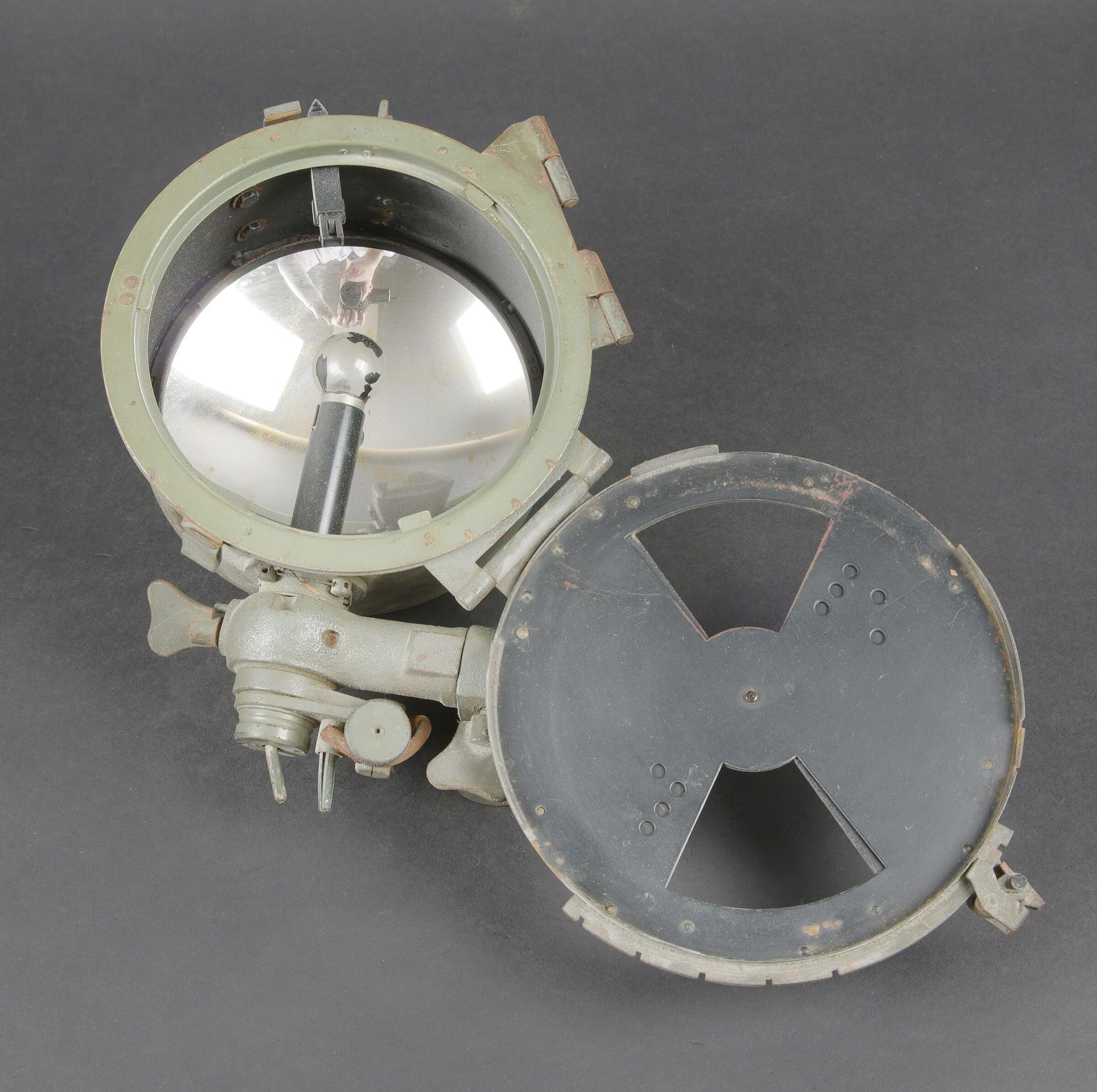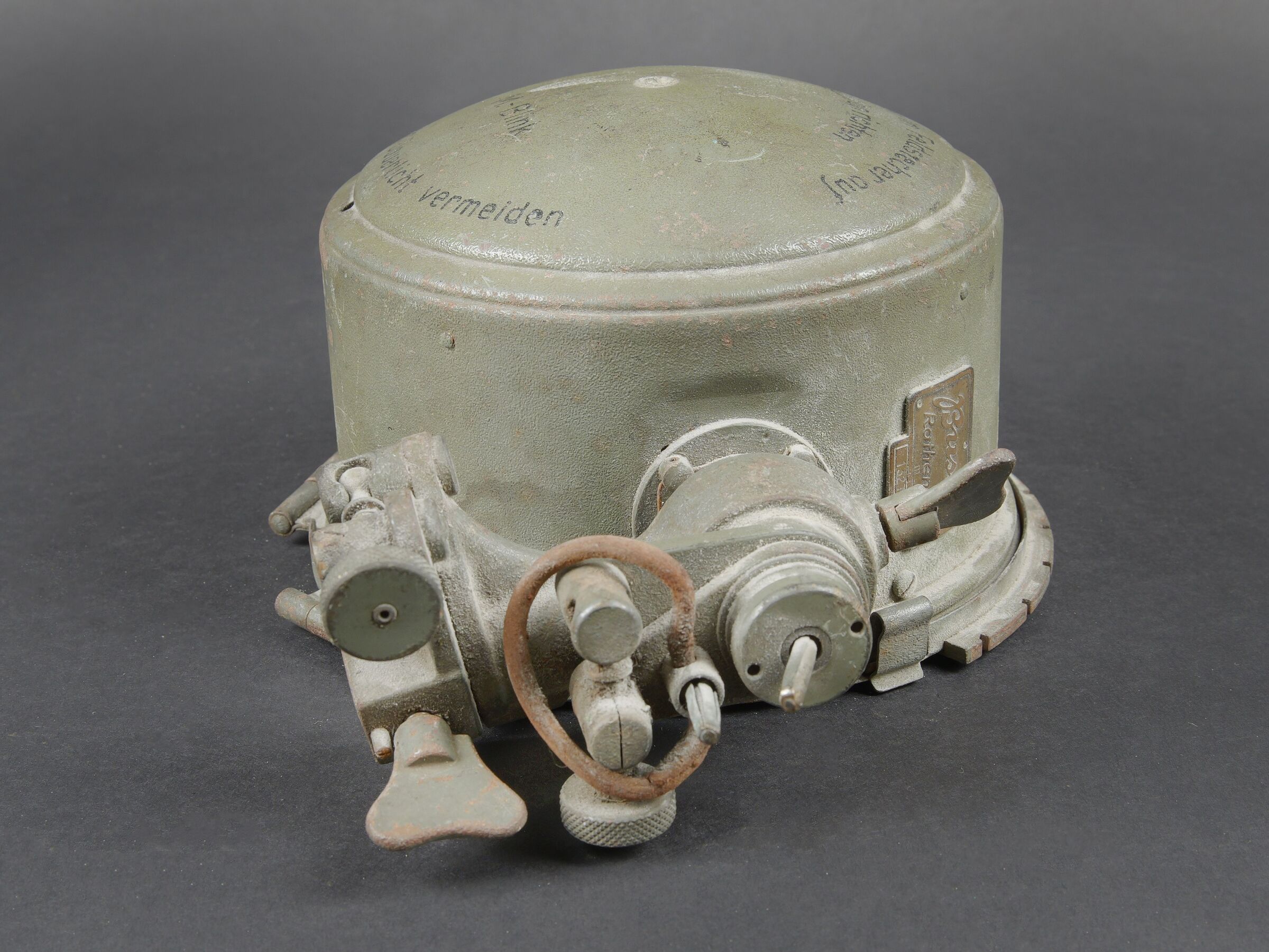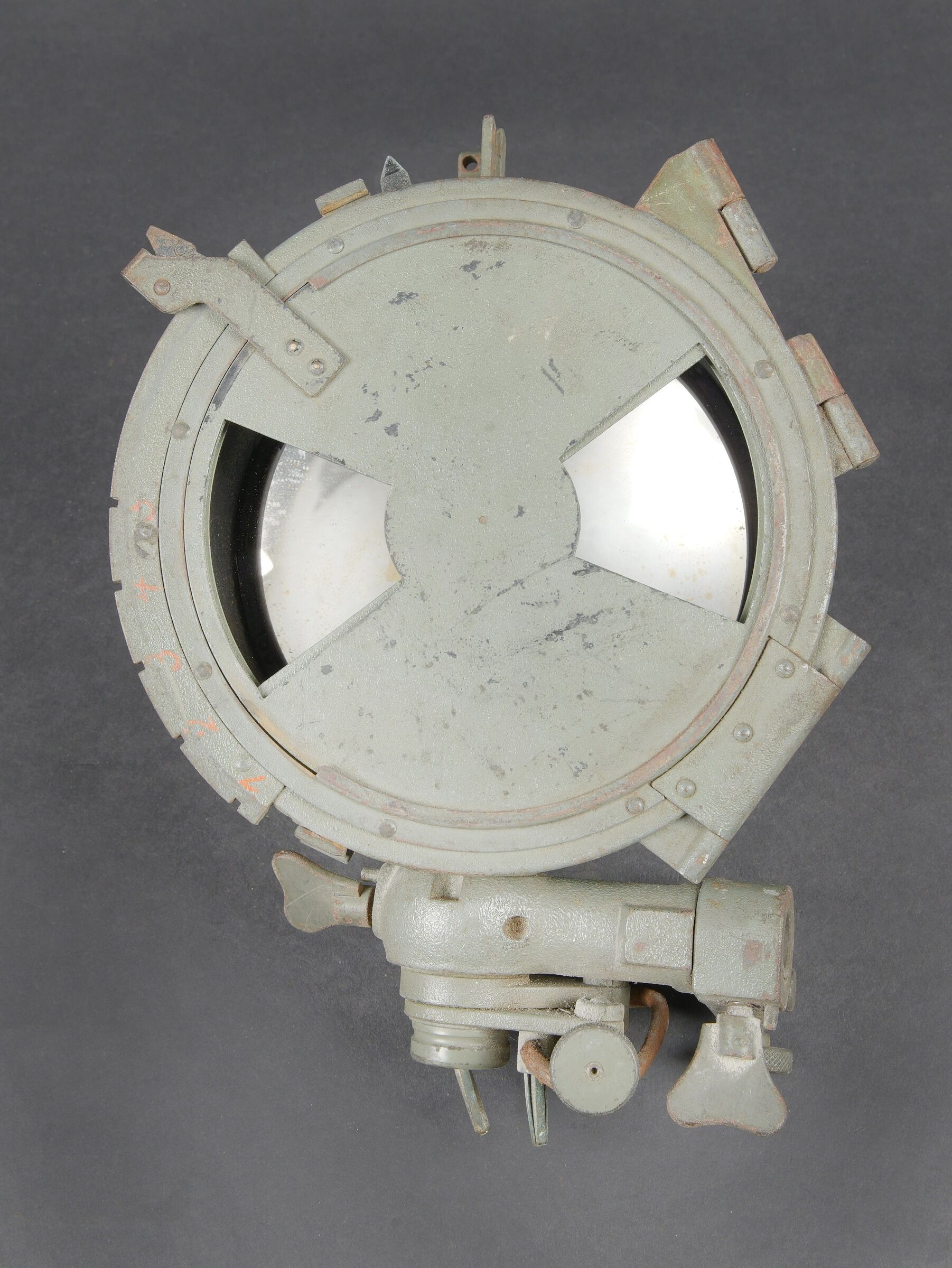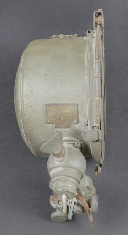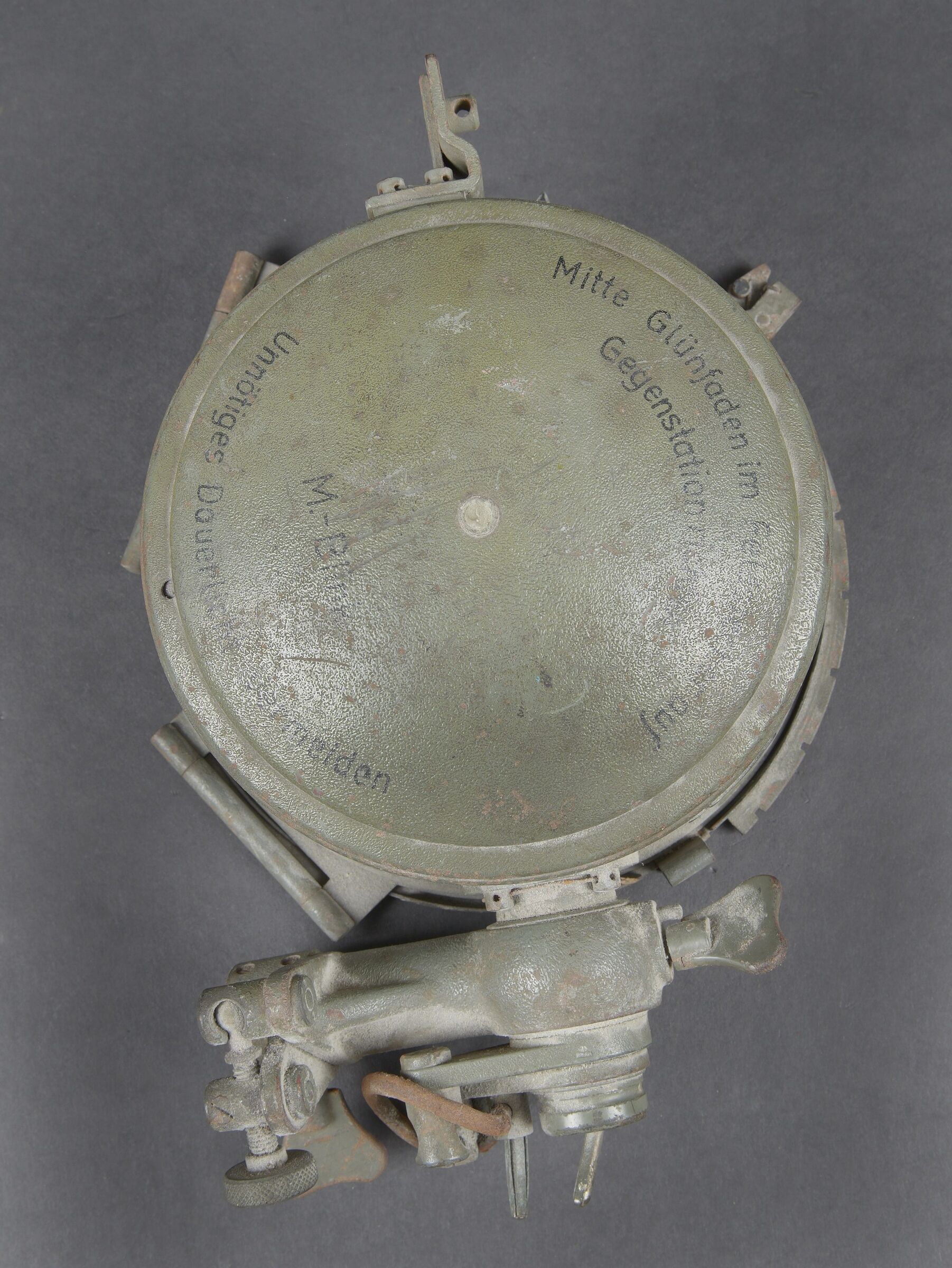Lampe de signalisation WH. En métal. Peinture Feldgrau à 90%. Marquages au dos Mitt Glünfaden im Feldstrecher auf gegenstation richten M Blink Unnötiges Dauerlicht vermeiden. Plaquette marquée Busch Rathenow numéro 1327. Toutes les pièces mobiles sont fonctionnelles. Ampoule présente, verre en très bon état. A noter une certaine usure et patine de la pièce. Etat II+. WH signal lamp manufactured in metal with approximately 90% of the original Feldgrau finish remaining. Rear markings reading Mitt Glühfaden im Feldstecher auf Gegenstation richten M Blink. Unnötiges Dauerlicht vermeiden. Plate marked Busch Rathenow with serial number 1327. All moving parts fully operational. Bulb present and glass in very good condition. Visible wear and patina consistent with age. Condition II+.