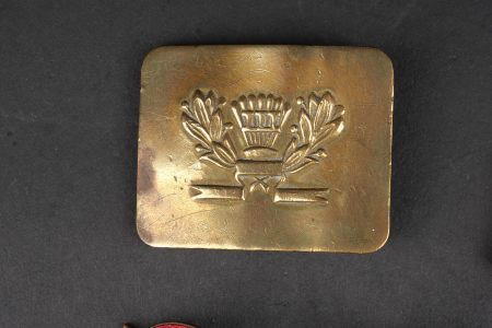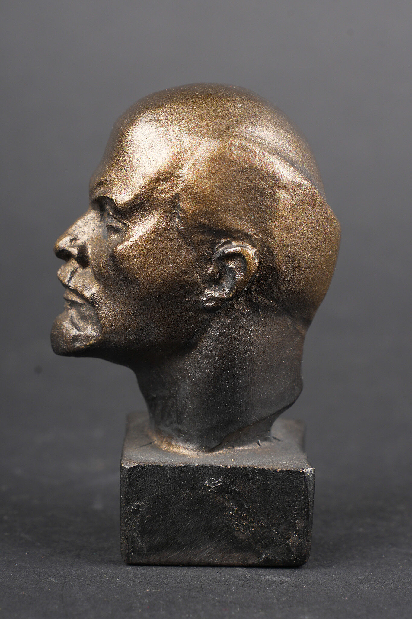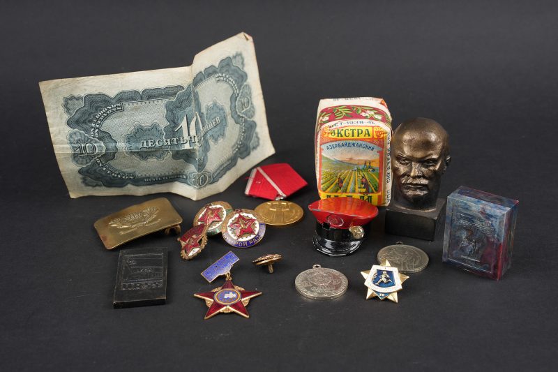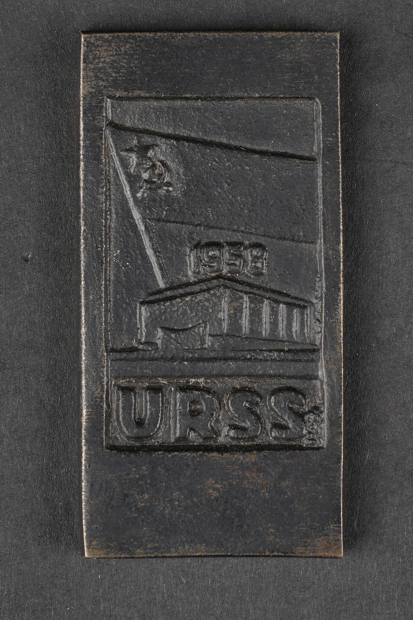 Russie soviétique lot d’insignes, médailles et divers. Insignes sportifs, médailles civiles, paquet de tabac, briquet en forme de casquette, petite broche en forme de livre contenant des vues d’une ville, boucle de ceinturon d’étudiant, un billet de banque de 1937 à l’effigie de Lénine, un petit buste résine de Lénine. Usure d’usage. Soviet Russia lot of badges, medals and miscellaneous items. Sporting badges, civilian medals, tobacco packet, cap-shaped lighter, small book-form brooch containing city views, student belt buckle, 1937 banknote bearing the portrait of Lenin, small resin Lenin bust. Service wear.