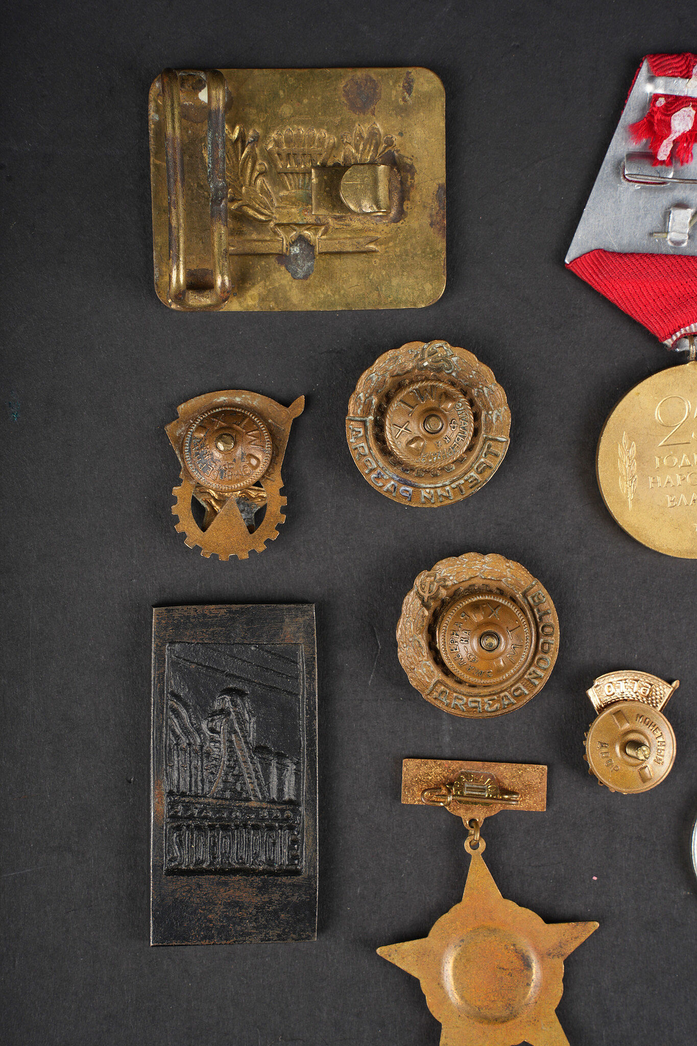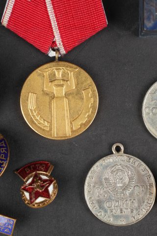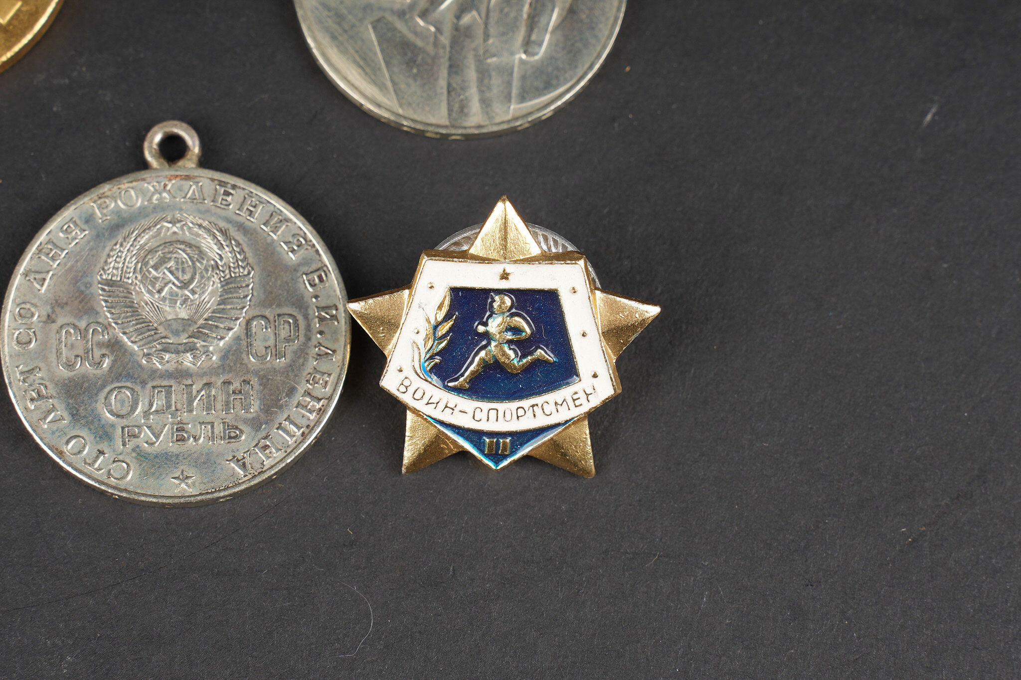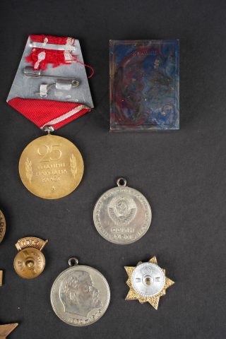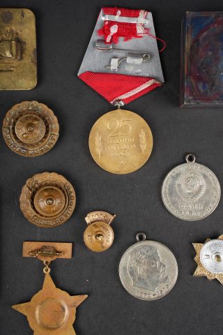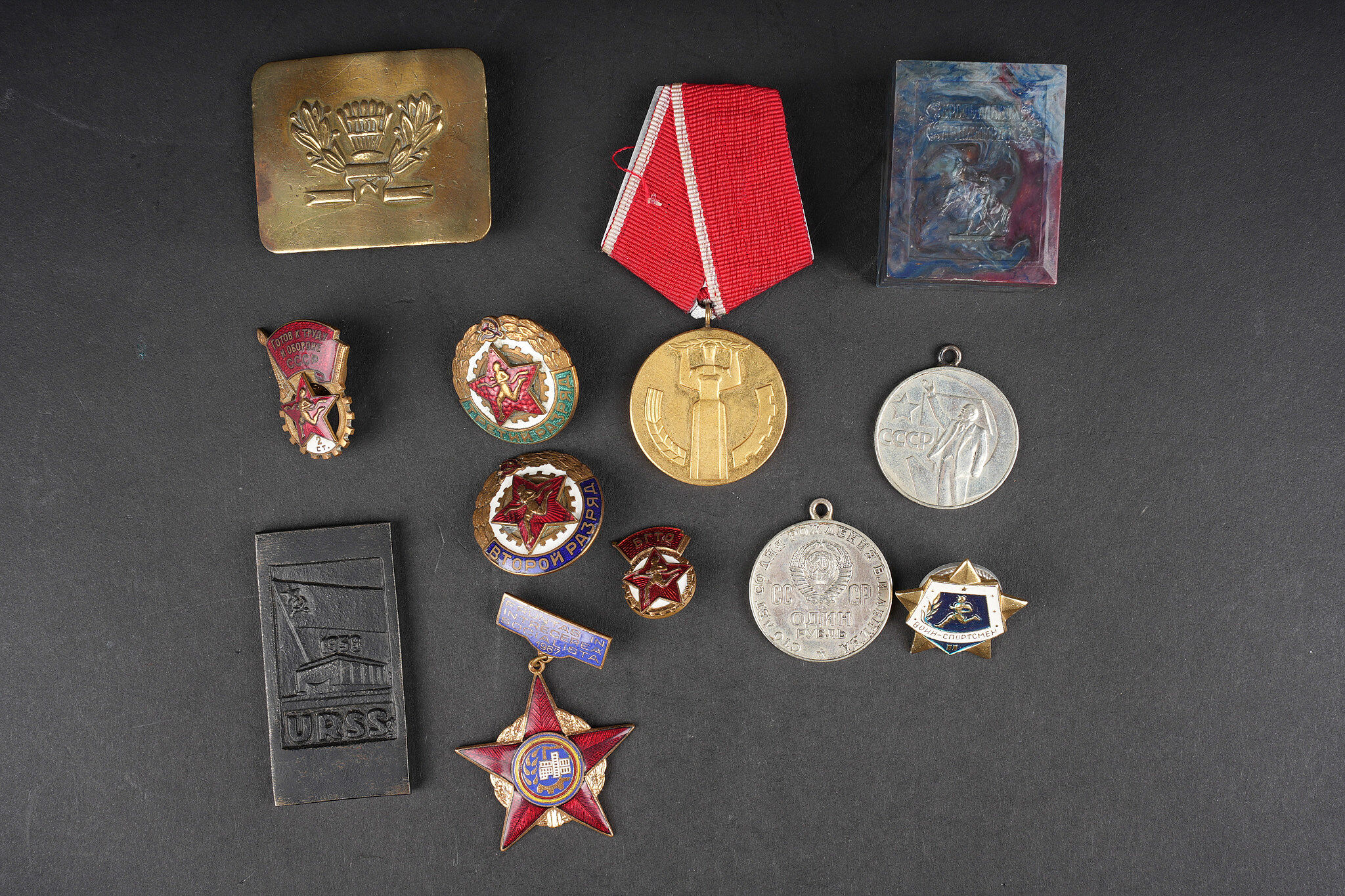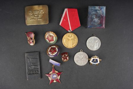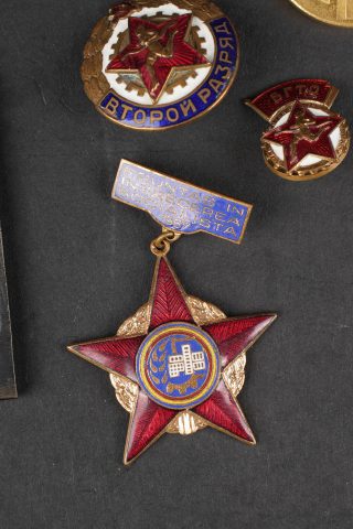 Russie soviétique lot d’insignes, médailles et divers. Insignes sportifs, médailles civiles, paquet de tabac, briquet en forme de casquette, petite broche en forme de livre contenant des... en savoir plus