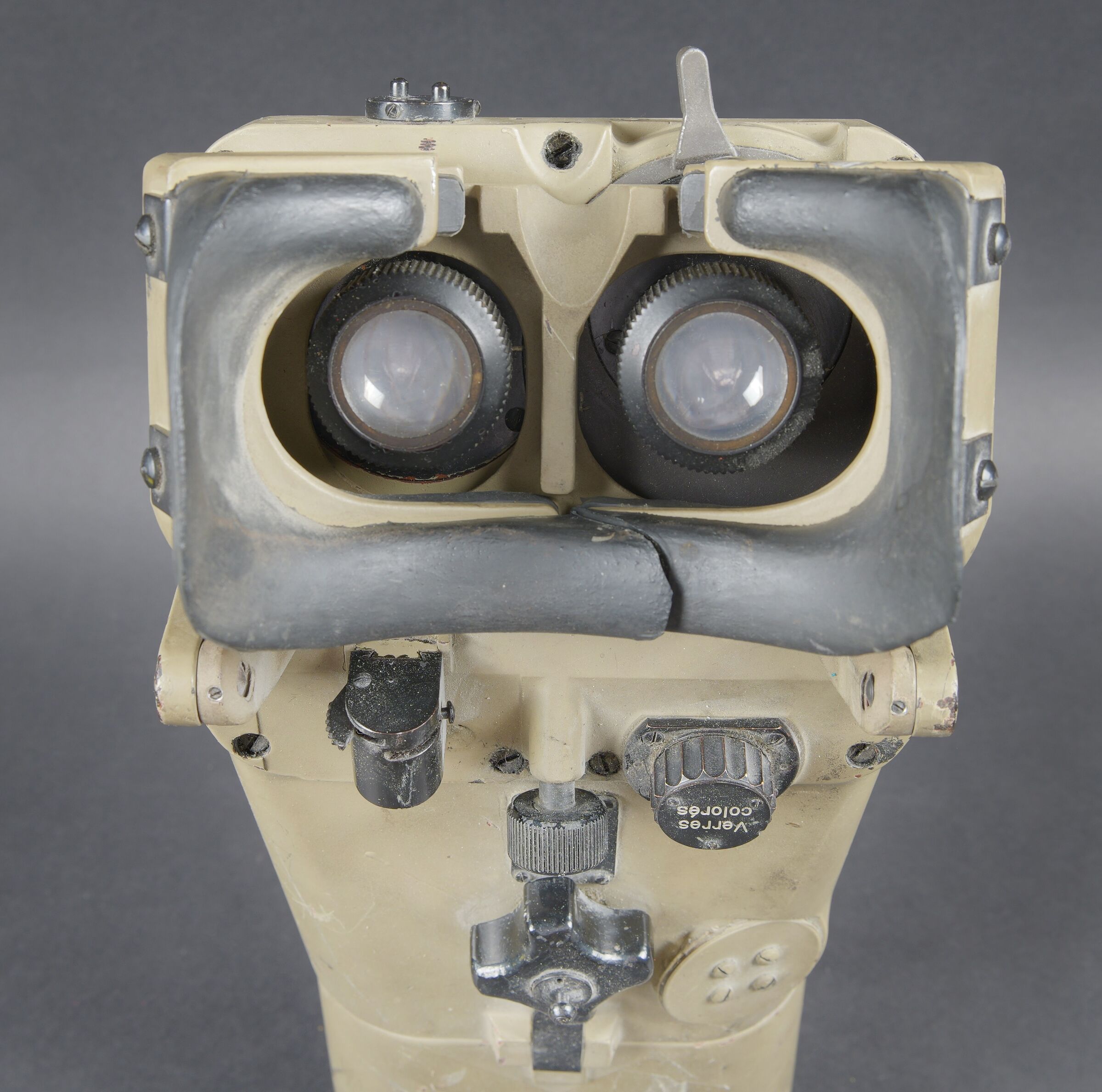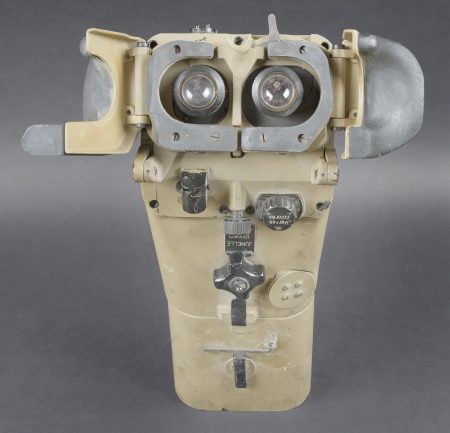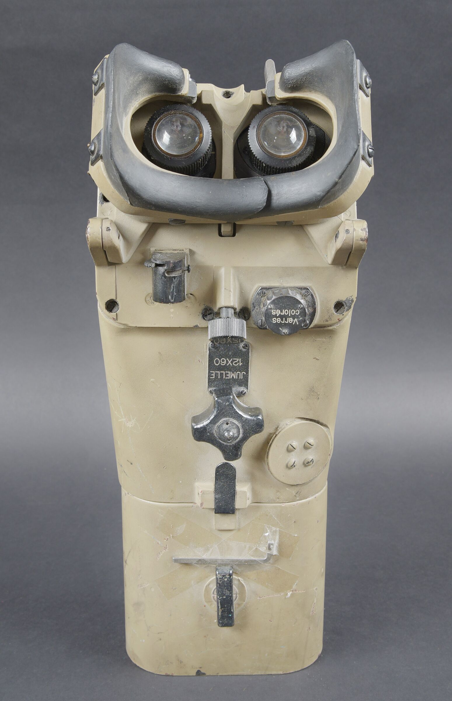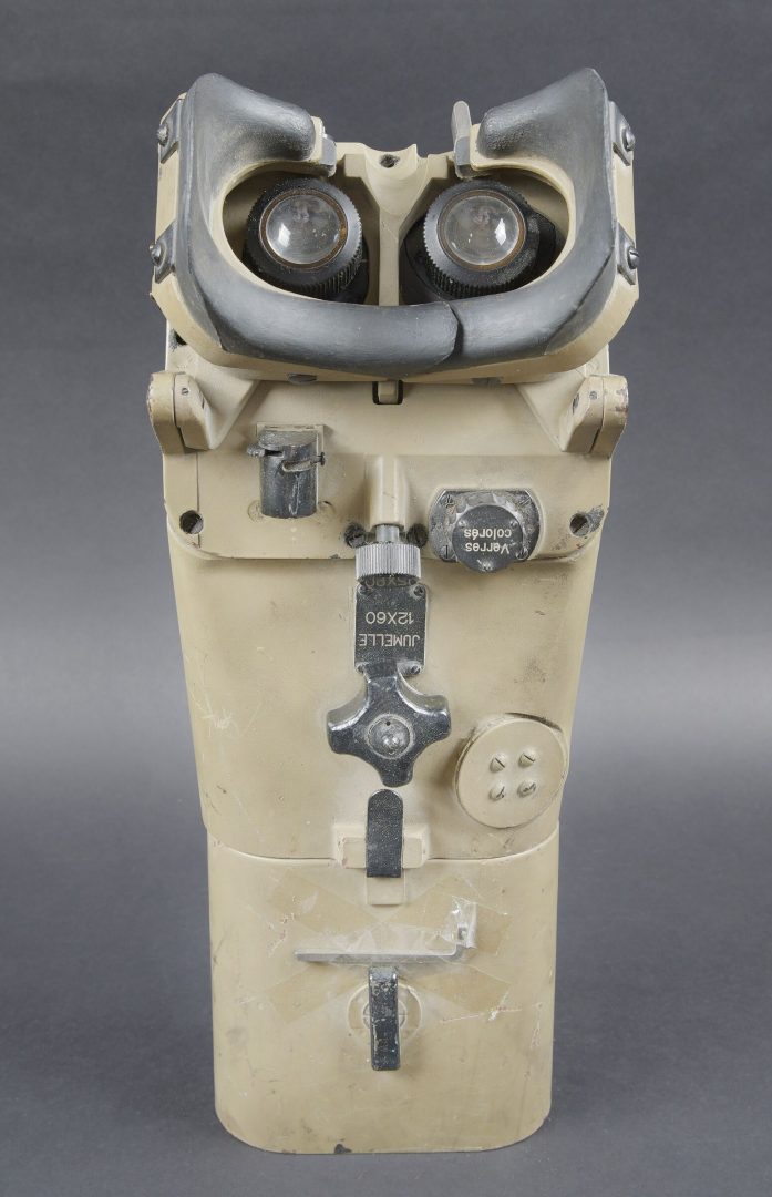 Lunette 12 x 60, reconditionnée par l’armée française. En métal. Couleur jaune sable à 90%. Le pare soleil est présent, ainsi que la clé de réglage et de démontage. Toutes les plaques d’origine ont été remplacées par des plaques française. Toutes les pièces mobiles sont fonctionnelles. Protège front complet, quelques marques d’usures visibles sur les bordures. Optique graduée en parfait état. A noter une certaine usure et patine de la pièce. Etat II+. French Army reconditioned 12 × 60 telescope. Metal construction with later sand-yellow finish retaining approximately 90%. Sunshade present together with the adjustment and dismantling key. All original plates replaced by French plates. All moving parts functional. Complete forehead rest with minor edge wear. Graduated optics in perfect condition. Noteworthy overall wear and an attractive period patina. Condition II+.