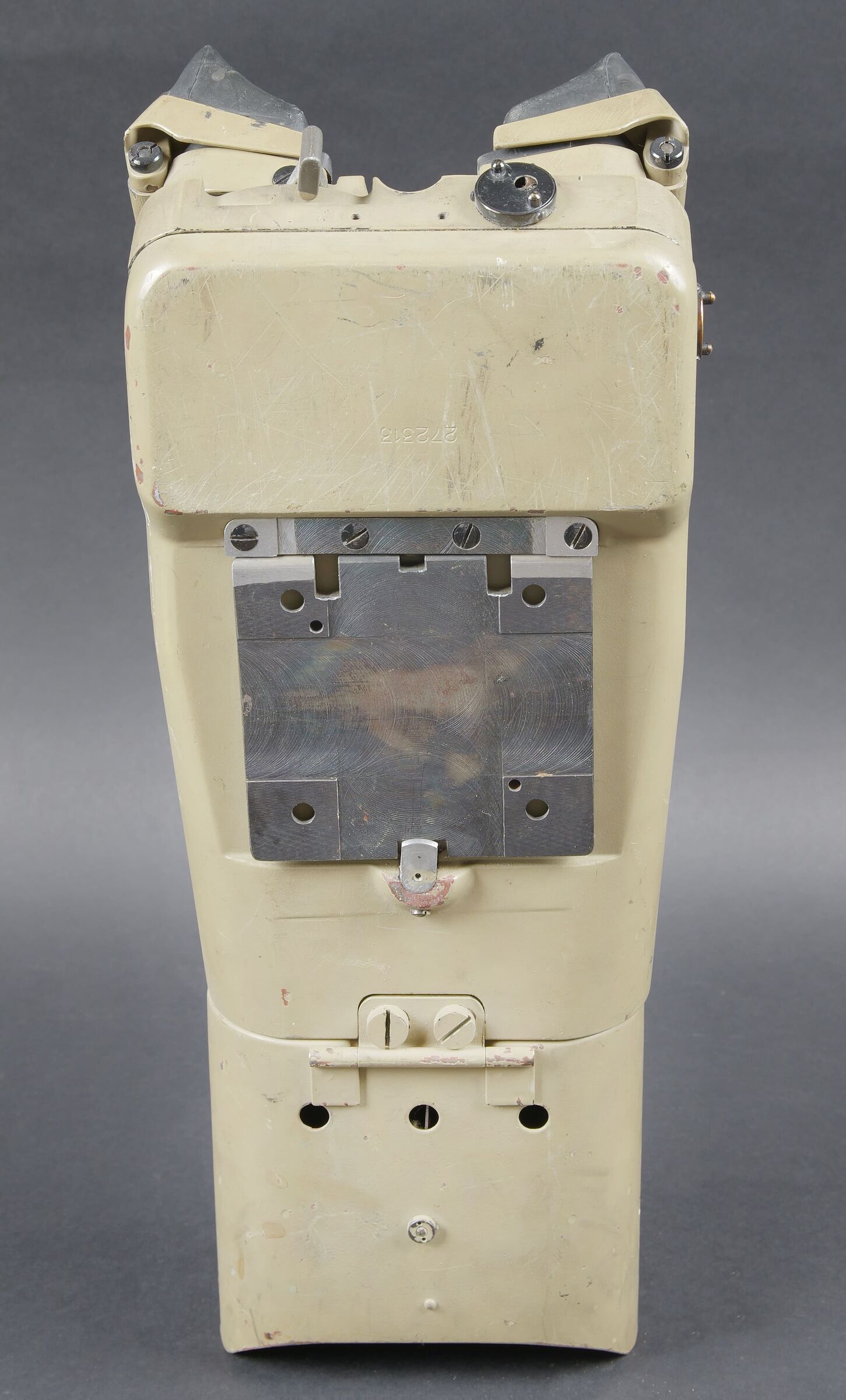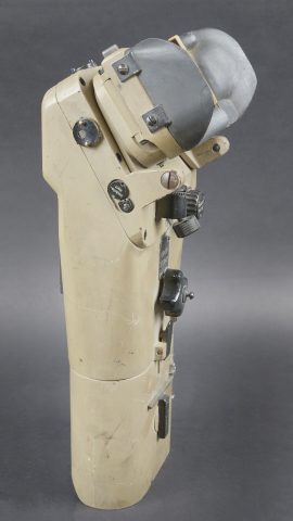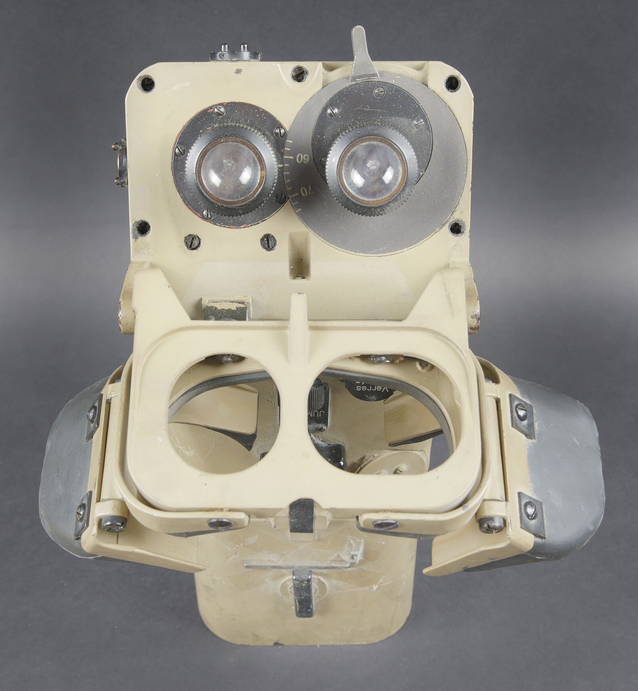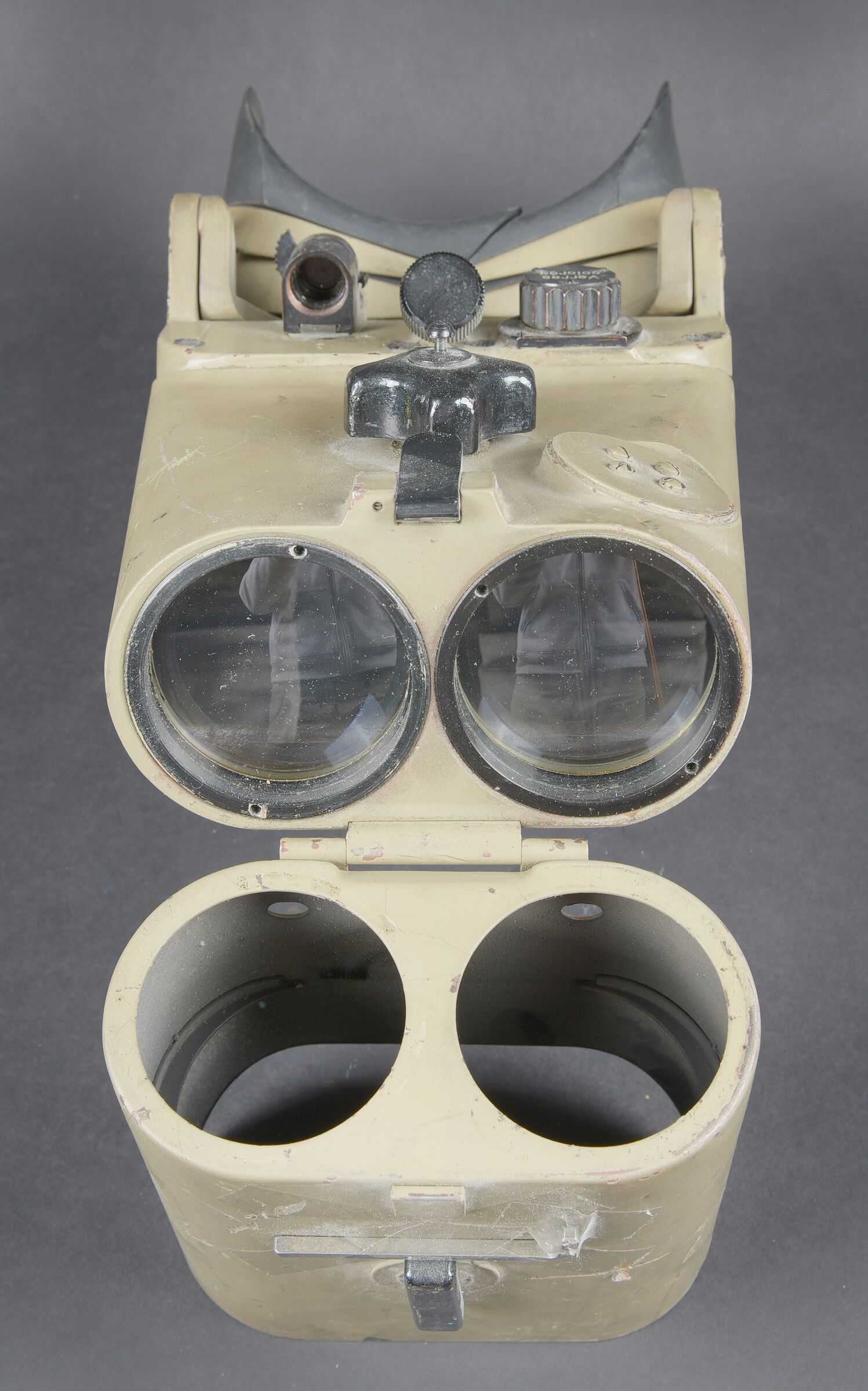 Lunette 12 x 60, reconditionnée par l’armée française. En métal. Couleur jaune sable à 90%. Le pare soleil est présent, ainsi que la clé de réglage et de démontage. Toutes les plaques d’origine ont été remplacées par des plaques française. Toutes les pièces mobiles sont fonctionnelles. Protège front complet, quelques marques d’usures visibles sur les bordures. Optique graduée en parfait état. A noter une certaine usure et patine de la pièce. Etat II+. French Army reconditioned 12 × 60 telescope. Metal construction with later sand-yellow finish retaining approximately 90%. Sunshade present together with the adjustment and dismantling key. All original plates replaced by French plates. All moving parts functional. Complete forehead rest with minor edge wear. Graduated optics in perfect condition. Noteworthy overall wear and an attractive period patina. Condition II+.