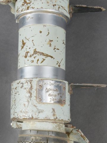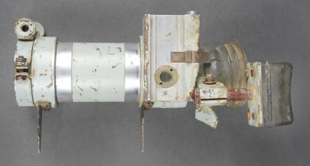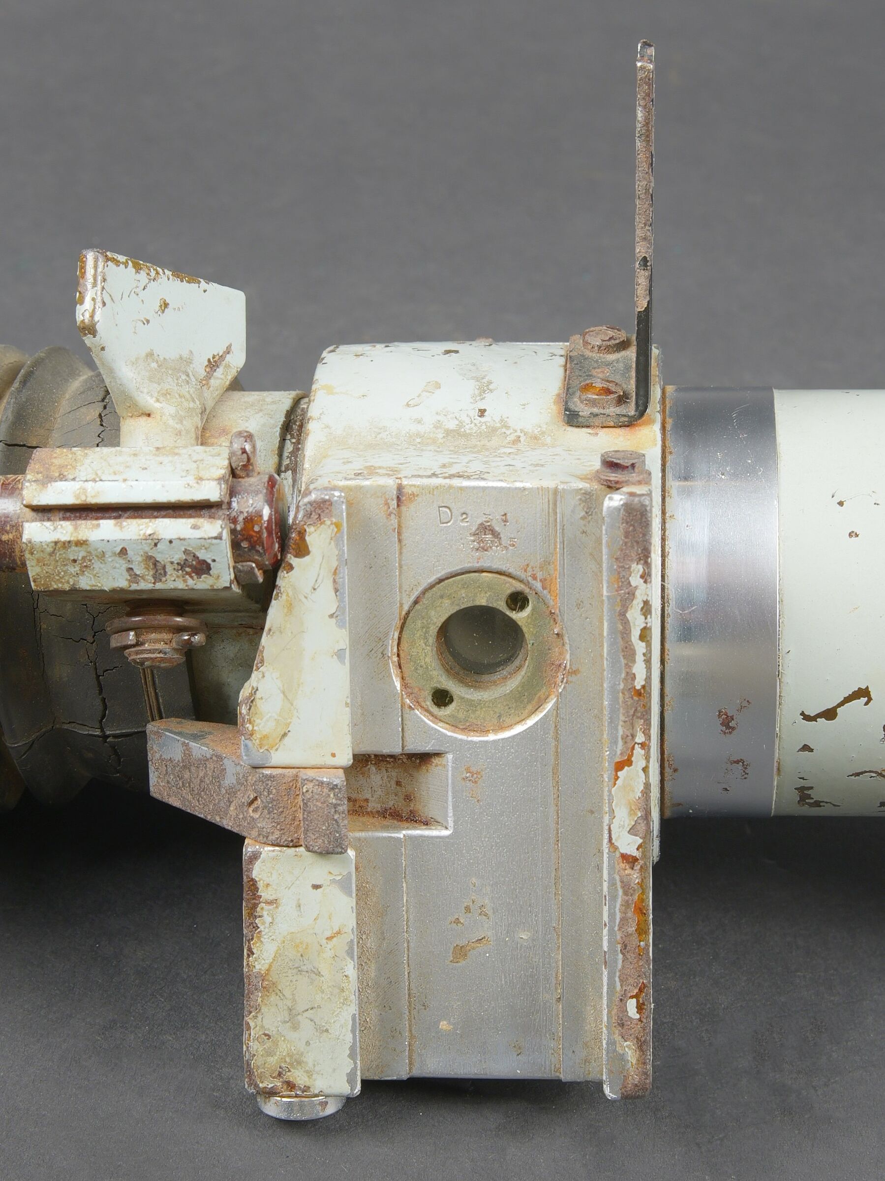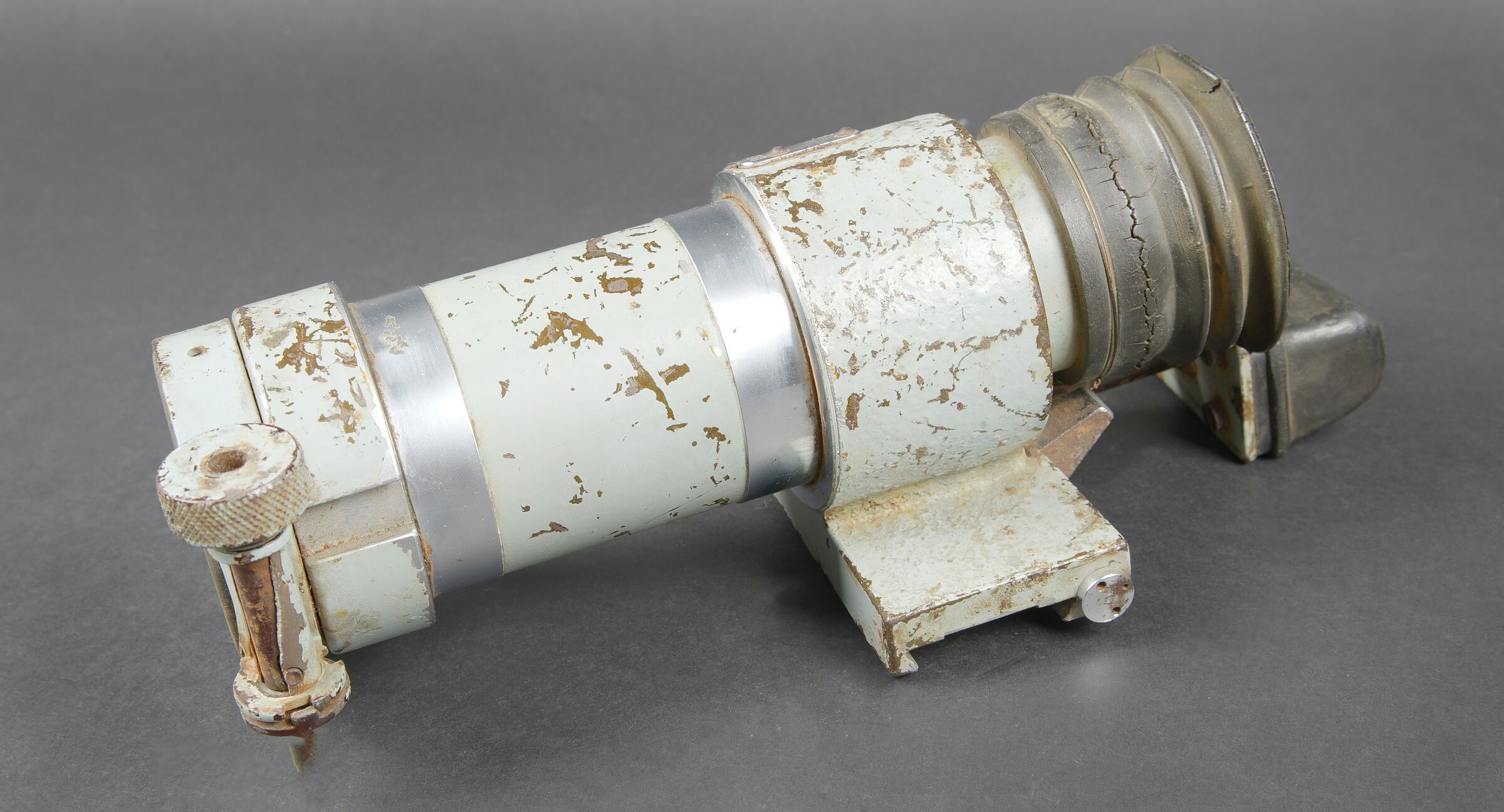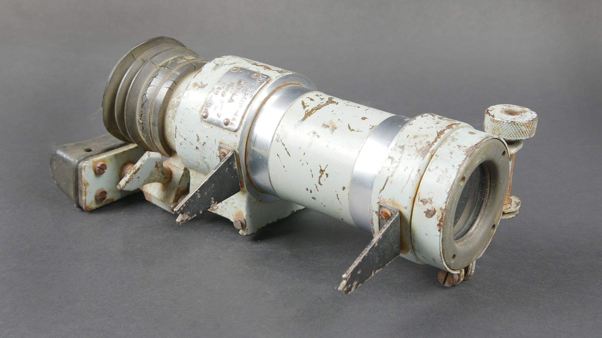 Lunette de canon M44 DNW. En métal. Peinture gris bateau pouvant correspondre à la marine de guerre des forces de l’axe, à 70%. Bonnette en caoutchouc complète, mais présentant des craquelures et fissures. Appui front complet. Plaquette marquée DOK 1×40 M44 AUSF A DNW 240. Optique graduée en parfait état. A noter une certaine usure et patine de la pièce. Etat II+. M44 DNW gun sight. All metal construction. Grey naval type finish possibly corresponding to the Axis naval forces with approximately 70 percent remaining. Rubber eyecup complete but showing cracks and fissures. Forehead rest complete. Data plate marked DOK 1×40 M44 Ausf A DNW 240. Graticuled optics in perfect condition. Noticeable overall wear and patina. Condition II+.