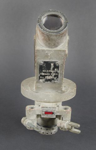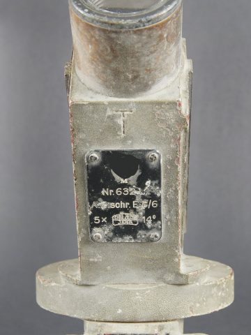 Lunette de tir de la marine de guerre des forces de l’axe. En métal. Peinture gris bateau présentant des traces d’oxydation. Quelques accessoires sont manquants. Toutes les pièces mobiles sont fonctionnelles. Plaquette disposant du marquage de la marine de guerre. Marquages Nr 632L. A Schr E 6/6 5 x Carl Zeiss Jena 5x 14°. Optique claire et graduée en parfait état. Les filtres sont fonctionnels. A noter une certaine usure et patine de la pièce. Etat II+. Naval aiming telescope of the Axis war navy. Metal construction with ship-grey paint showing traces of oxidation. A few accessories missing. All moving parts functional. Plate bearing the Kriegsmarine marking. Marked Nr. 632L A. Schr. E 6/6 5× Carl Zeiss Jena 5× 14°. Clear graduated optics in perfect condition. Filters functional. Noteworthy overall wear and an attractive period patina. Condition II+.