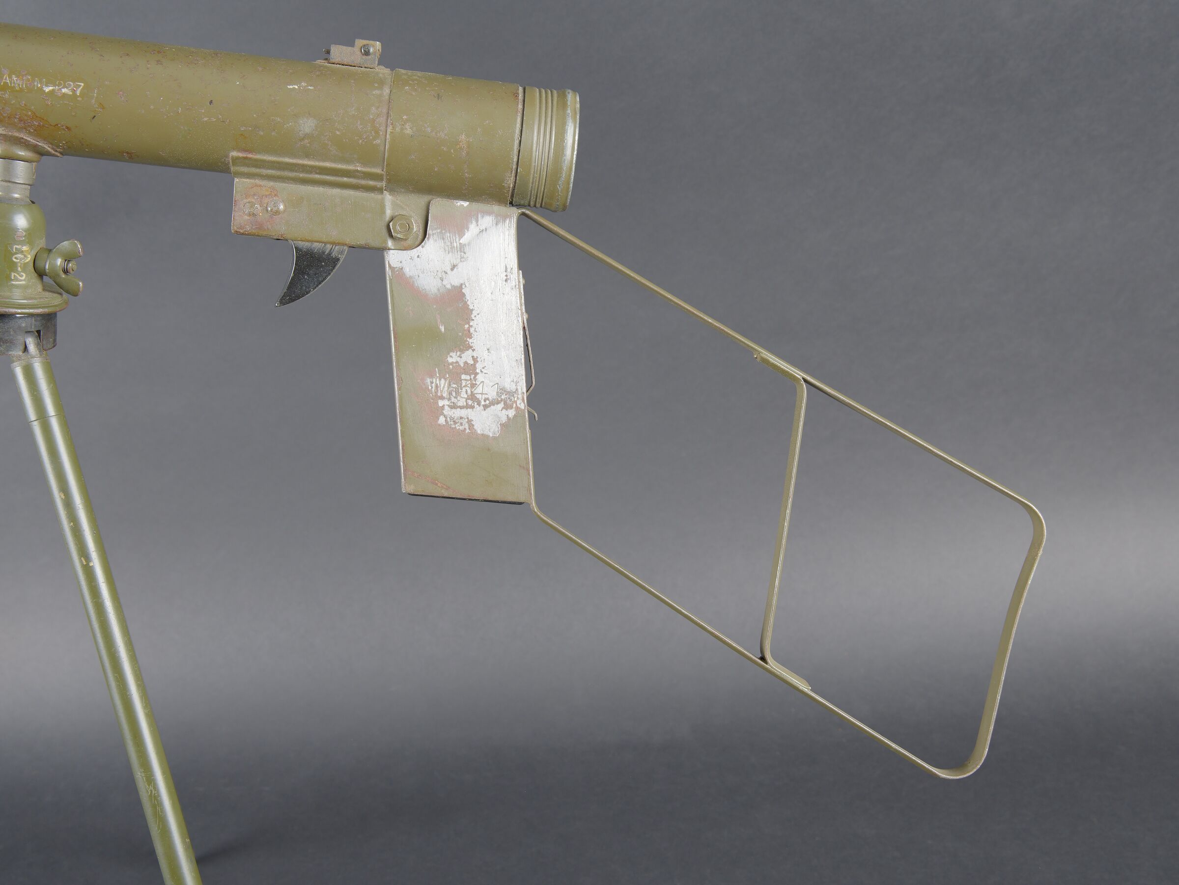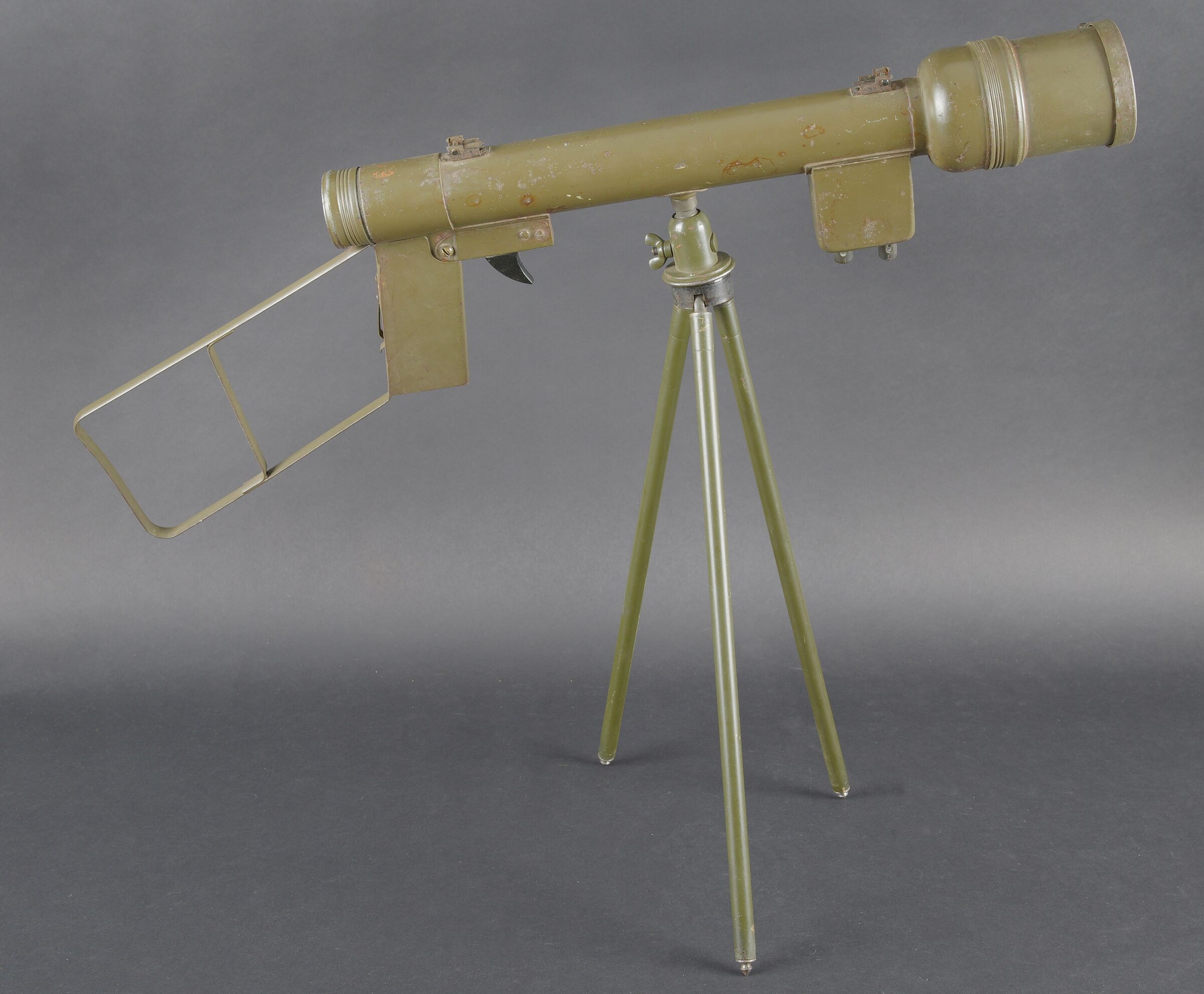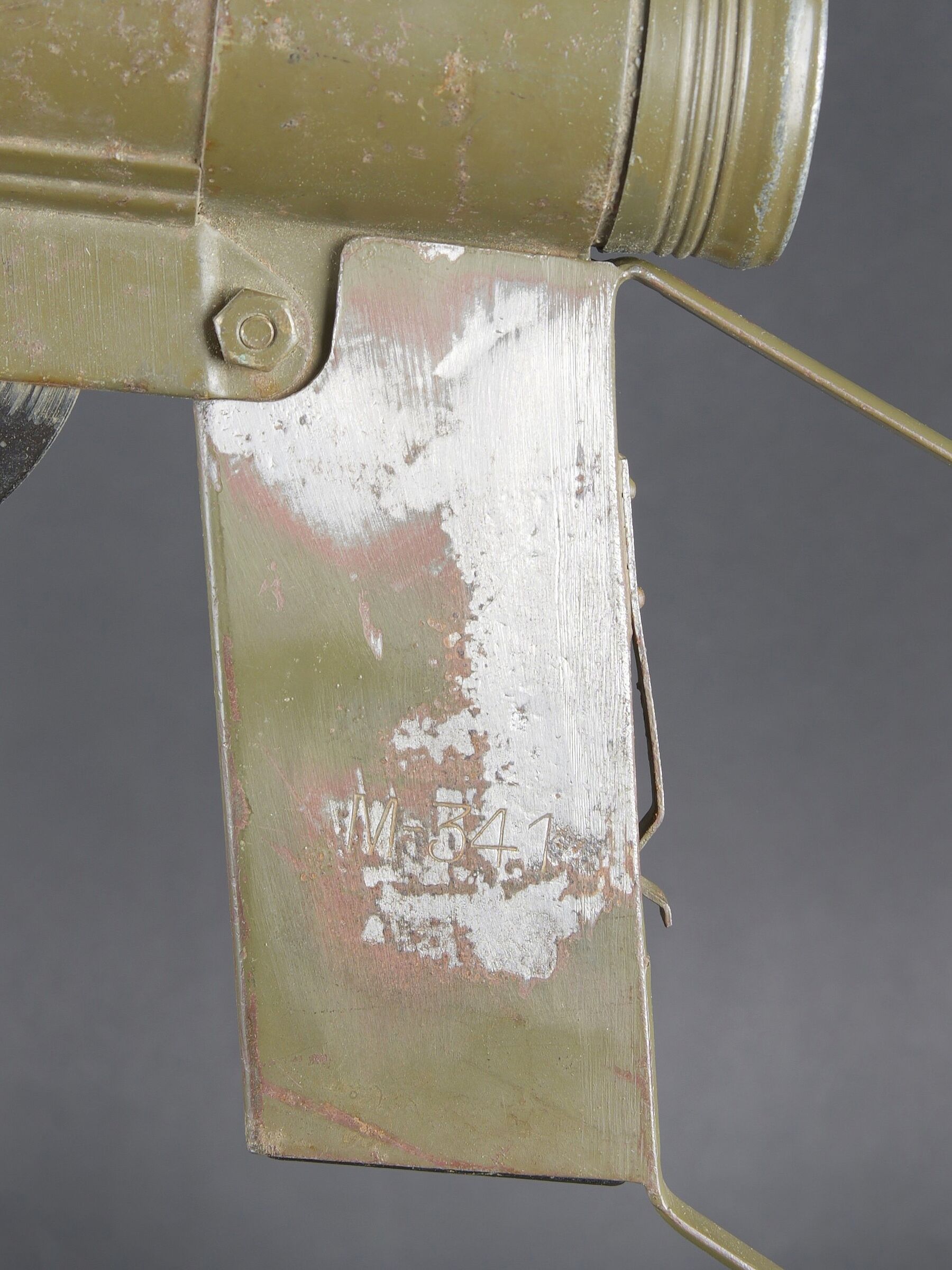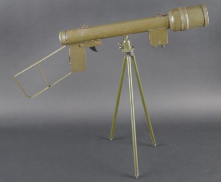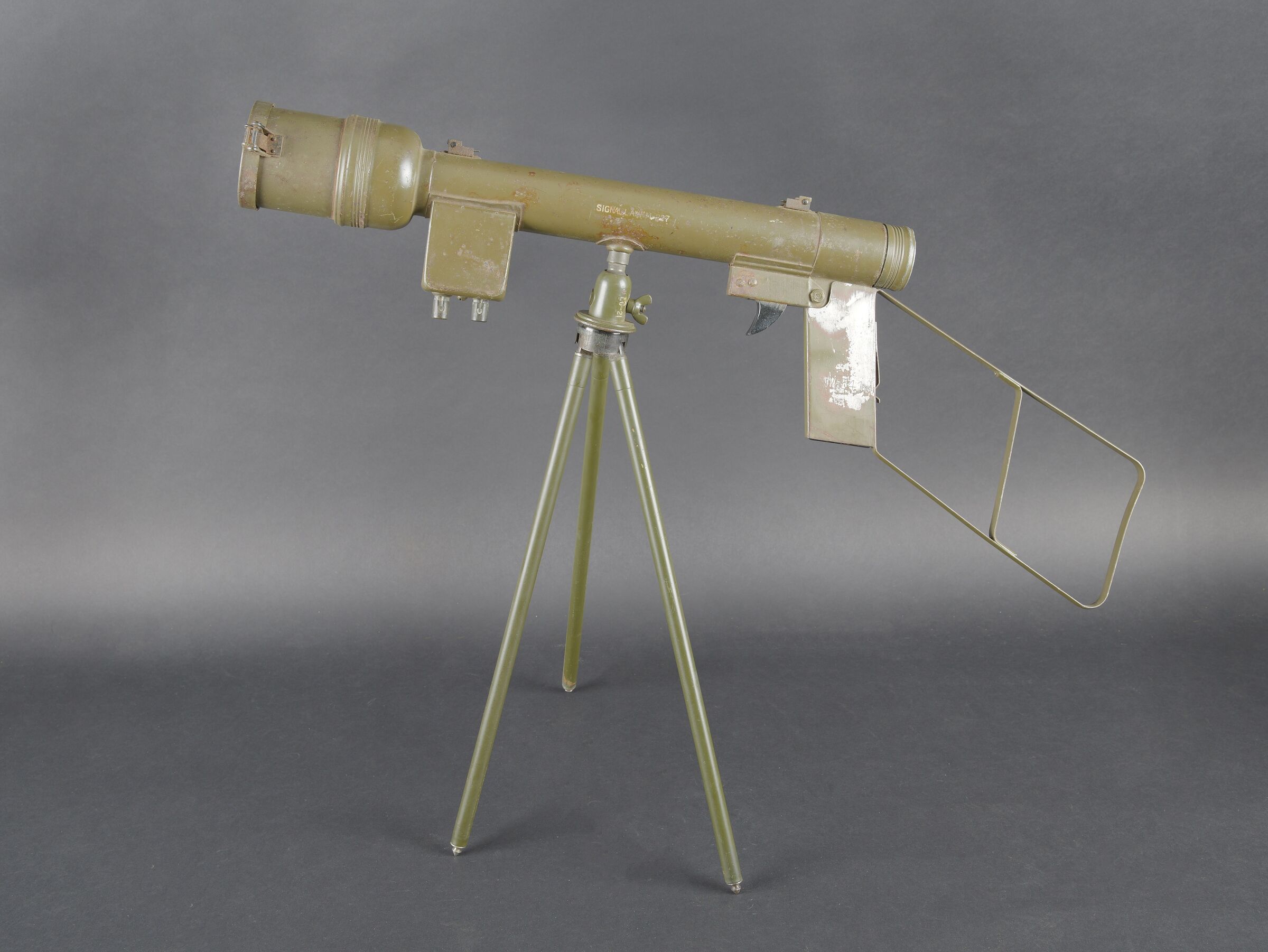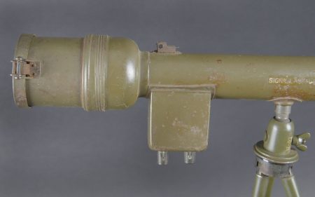Détails de la vente >Lunette M-227. Lunette en métal. Poignée de détente en bakélite noire. Filtre complet, ampoule présente, peinture kaki à 70%. Piles absentes. Marquages Signal AN M-227. Trépied LG-21... en savoir plus