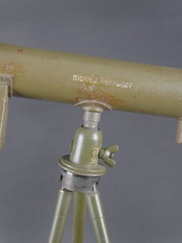 Lunette M-227. Lunette en métal. Poignée de détente en bakélite noire. Filtre complet, ampoule présente, peinture kaki à 70%. Piles absentes. Marquages Signal AN M-227. Trépied LG-21... en savoir plus