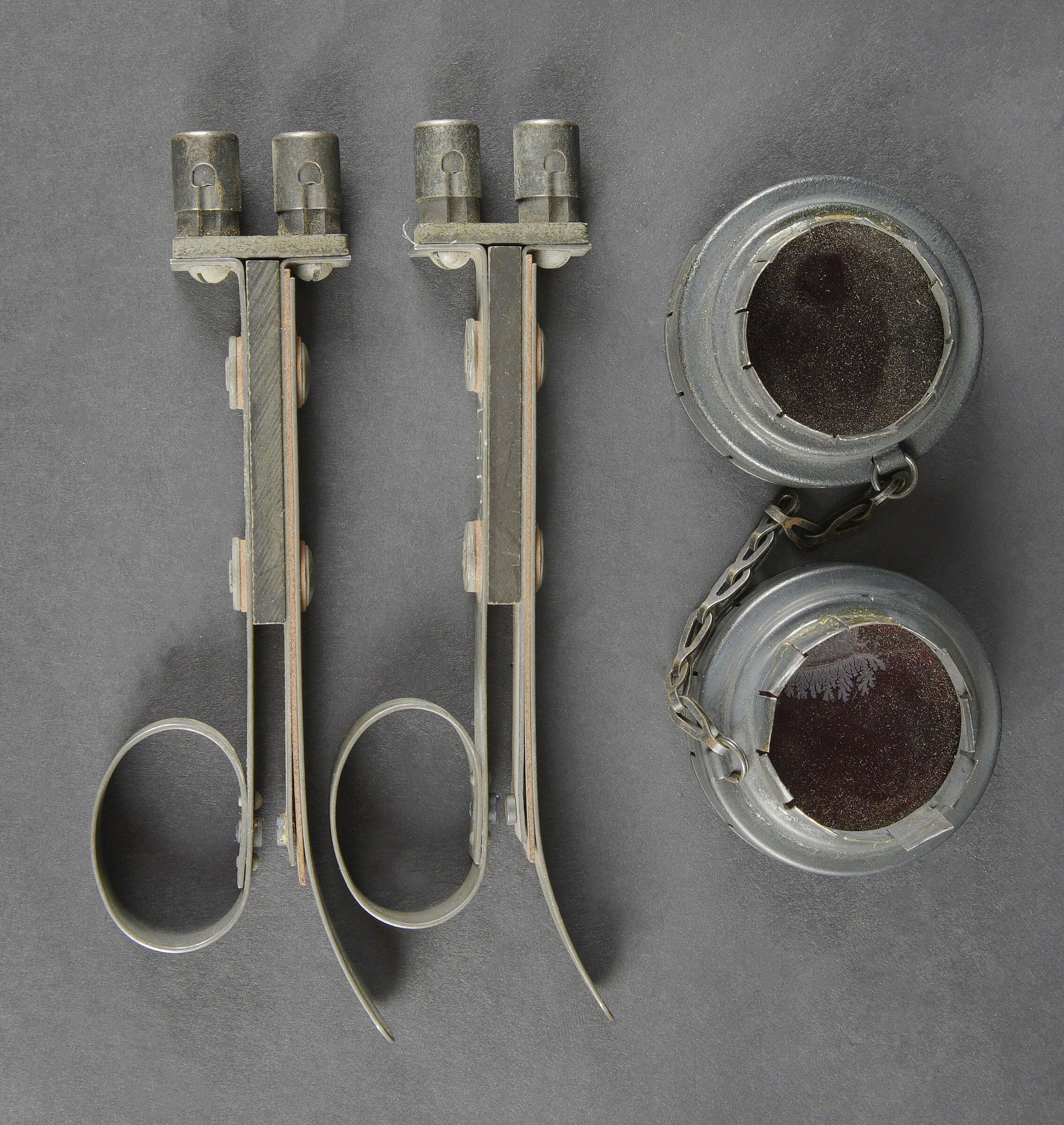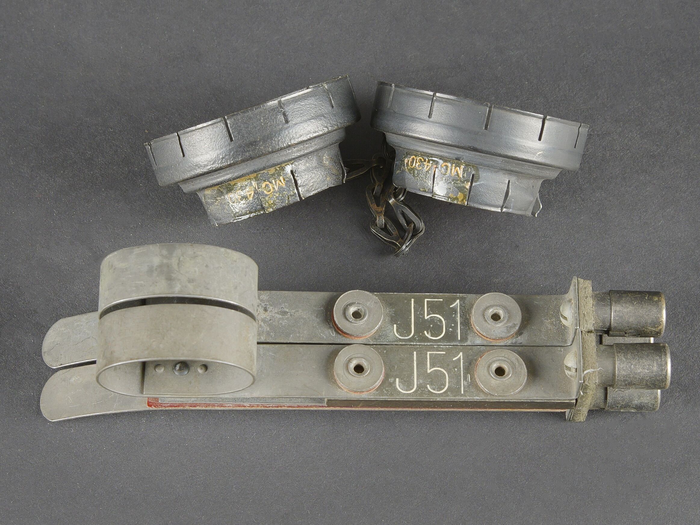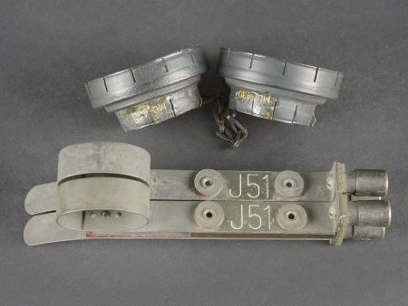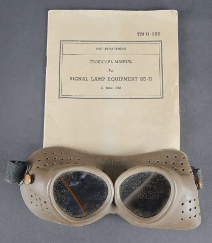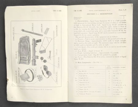 Lunette M-227. Lunette en métal. Poignée de détente en bakélite noire. Filtre complet, ampoule présente, peinture kaki à 70%. Piles absentes. Marquages Signal AN M-227. Trépied LG-21 complet. Peinture kaki à 80%. Toutes les pièces mobiles sont fonctionnelles. Crosse en métal M341 complète, la peinture est partiellement décapée. TM 11-392 Signal Lamp Equipment SE-11, daté du 11 juin 1943. On y joint une paire de lunette M-172. Housse en forte toile OD. Tous les boutons pressions sont fonctionnels. Reste de marquages BG illisibles. Sangle de transport complète. Deux filtres rouges complet avec leurs chainette, marqués MC4430. Deux accessoires J51 complets. A noter une certaine usure et patine de la pièce. Etat II+. Signal lamp M-227 set Metal lamp with black bakelite trigger handle. Complete filter and bulb present. Khaki paint 70% preserved. Batteries missing. Marked Signal AN M-227. Tripod LG-21 complete with khaki paint 80% preserved. All moving parts functional. Complete metal chest M341 with partially stripped paint. Technical manual TM 11-392 Signal Lamp Equipment SE-11 dated June 11, 1943. Pair of binoculars M-172 included in heavy OD canvas case with all press studs functional, remnants of illegible BG markings and complete carrying strap. Two complete red filters with retaining chains marked MC4430. Two complete accessories J51. Note some wear and patina to the piece. Condition II+.
