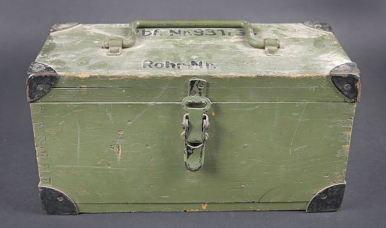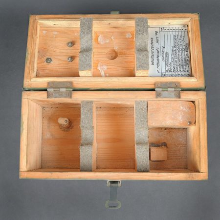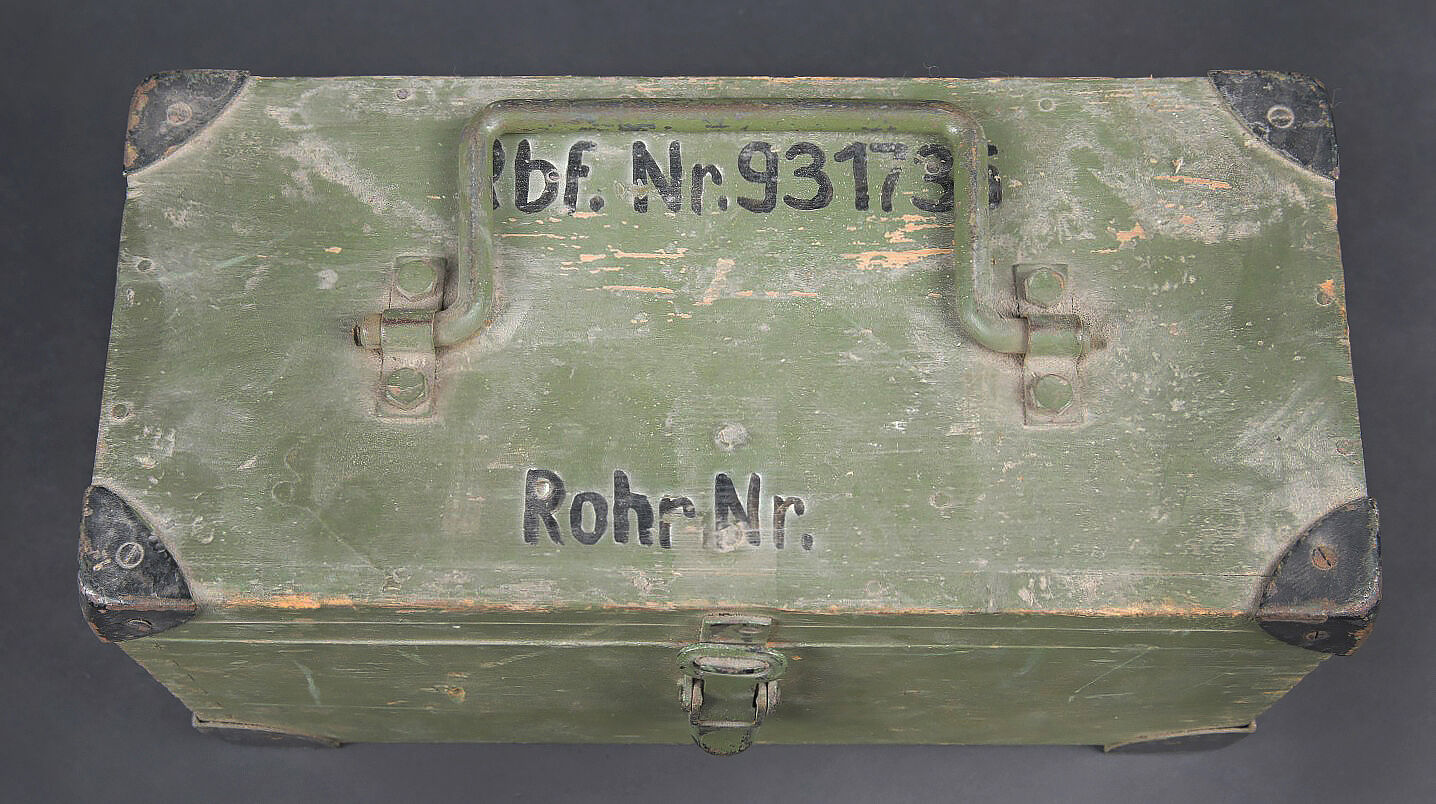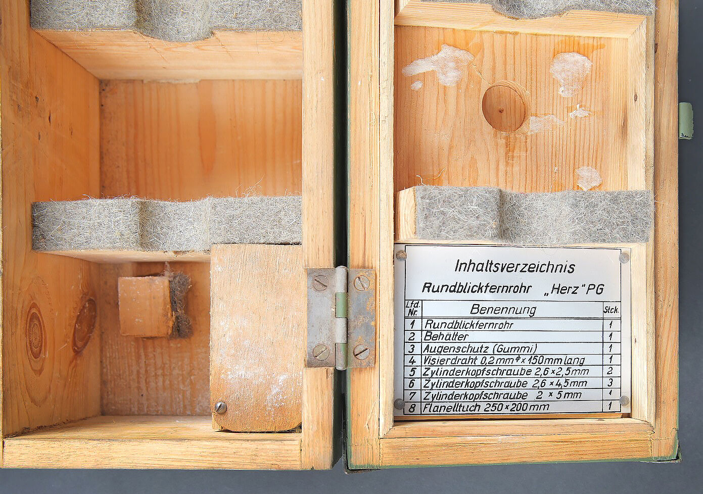 Lunette RBF 931735. Belle caisse en bois avec renfort en métal. Peinture kaki à 70%. Poignée de transport fonctionnelle. Les crochets de fermeture sont complets. Marquages sur le couvercle RBF NR 93173 Rohr Nr. Cales en bois recouvertes d’une feutrine grise. Tous les accessoires sont manquants. Lunette en métal, peinture kaki à 70%. Marquages Rbf Nr 931735. Optique graduée en parfait état. A noter une certaine usure et patine de la pièce. Etat II+. RBF 931735 sight. Fine wooden case with metal reinforcements and khaki paint 70% preserved. Functional carrying handle and complete closing hooks. Lid marked RBF NR 93173 Rohr Nr. Wooden internal supports covered with grey felt. All accessories missing. Metal sight with khaki paint 70% preserved. Marked Rbf Nr 931735. Graduated optics in perfect condition. Note some wear and patina to the piece. Condition II+.