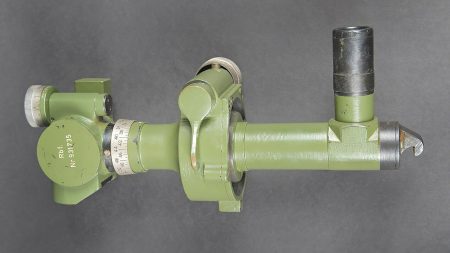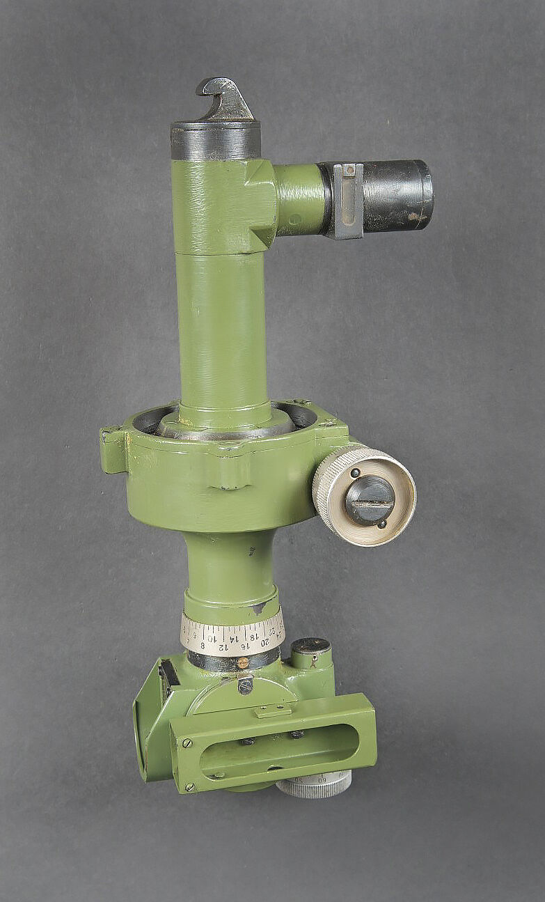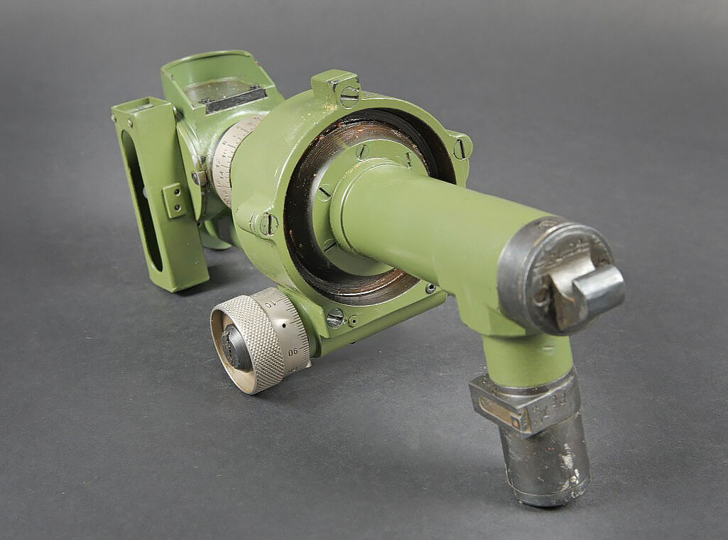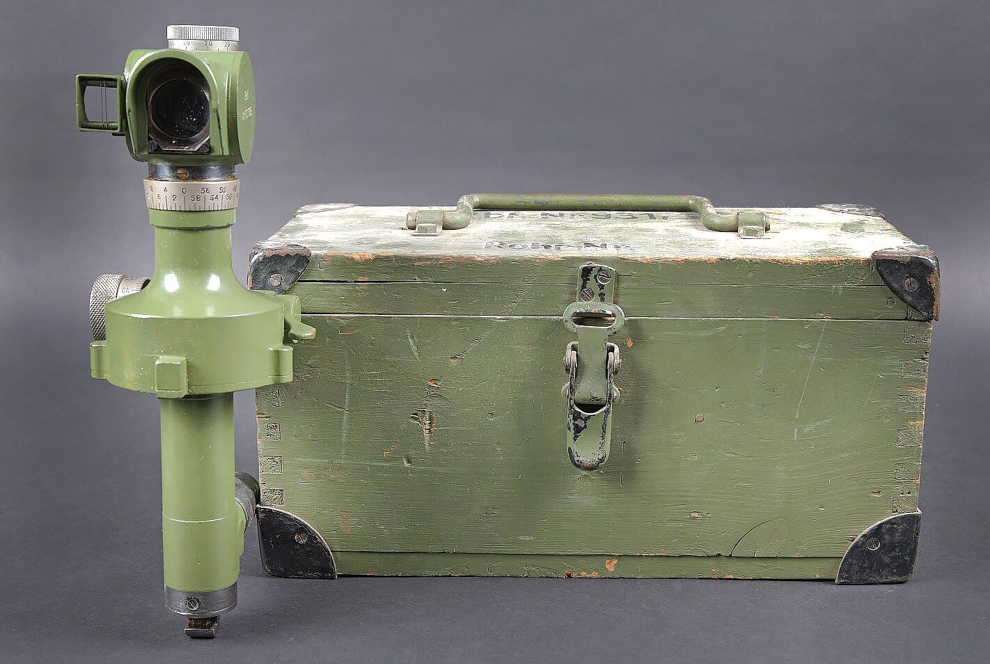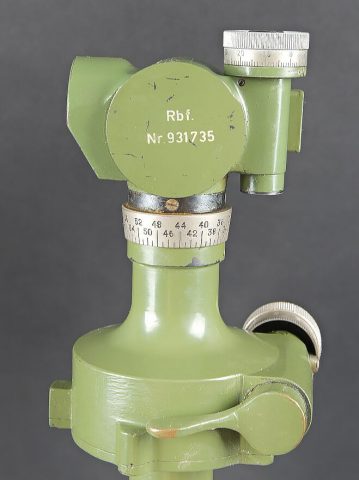 Lunette RBF 931735. Belle caisse en bois avec renfort en métal. Peinture kaki à 70%. Poignée de transport fonctionnelle. Les crochets de fermeture sont complets. Marquages sur le couvercle RBF NR 93173 Rohr Nr. Cales en bois recouvertes d’une feutrine grise. Tous les accessoires sont manquants. Lunette en métal, peinture kaki à 70%. Marquages Rbf Nr 931735. Optique graduée en parfait état. A noter une certaine usure et patine de la pièce. Etat II+. RBF 931735 sight. Fine wooden case with metal reinforcements and khaki paint 70% preserved. Functional carrying handle and complete closing hooks. Lid marked RBF NR 93173 Rohr Nr. Wooden internal supports covered with grey felt. All accessories missing. Metal sight with khaki paint 70% preserved. Marked Rbf Nr 931735. Graduated optics in perfect condition. Note some wear and patina to the piece. Condition II+.