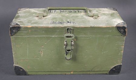 Détails de la vente >Lunette RBF 931735. Belle caisse en bois avec renfort en métal. Peinture kaki à 70%. Poignée de transport fonctionnelle. Les crochets de fermeture sont complets. Marquages sur le couvercle RBF... en savoir plus