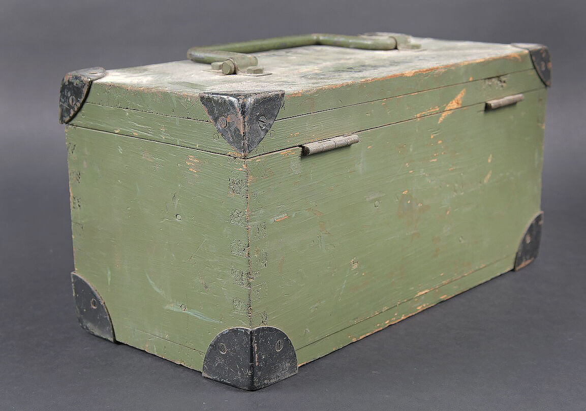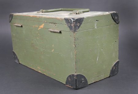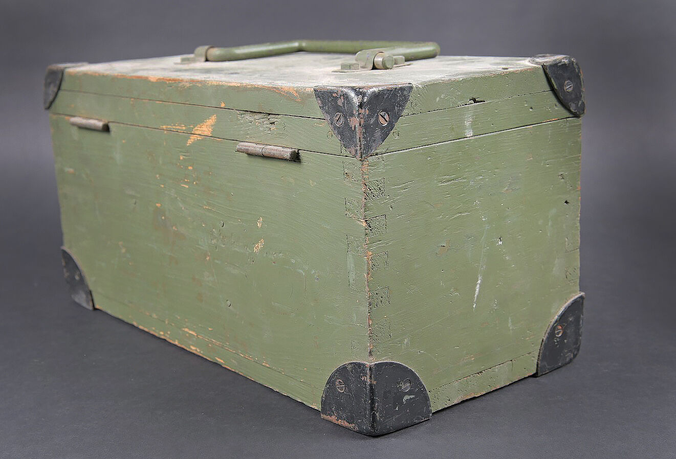 Lunette RBF 931735. Belle caisse en bois avec renfort en métal. Peinture kaki à 70%. Poignée de transport fonctionnelle. Les crochets de fermeture sont complets. Marquages sur le couvercle RBF... en savoir plus