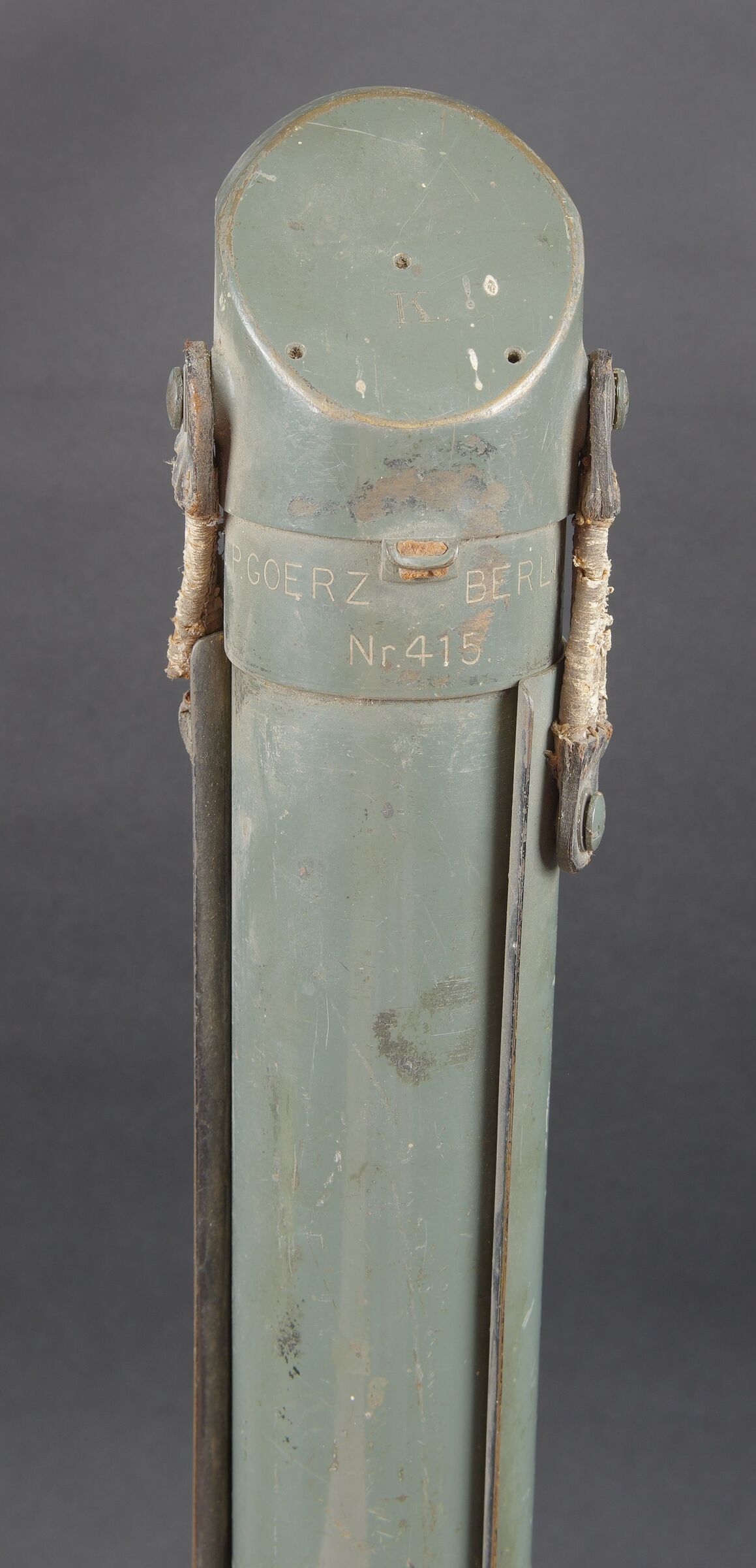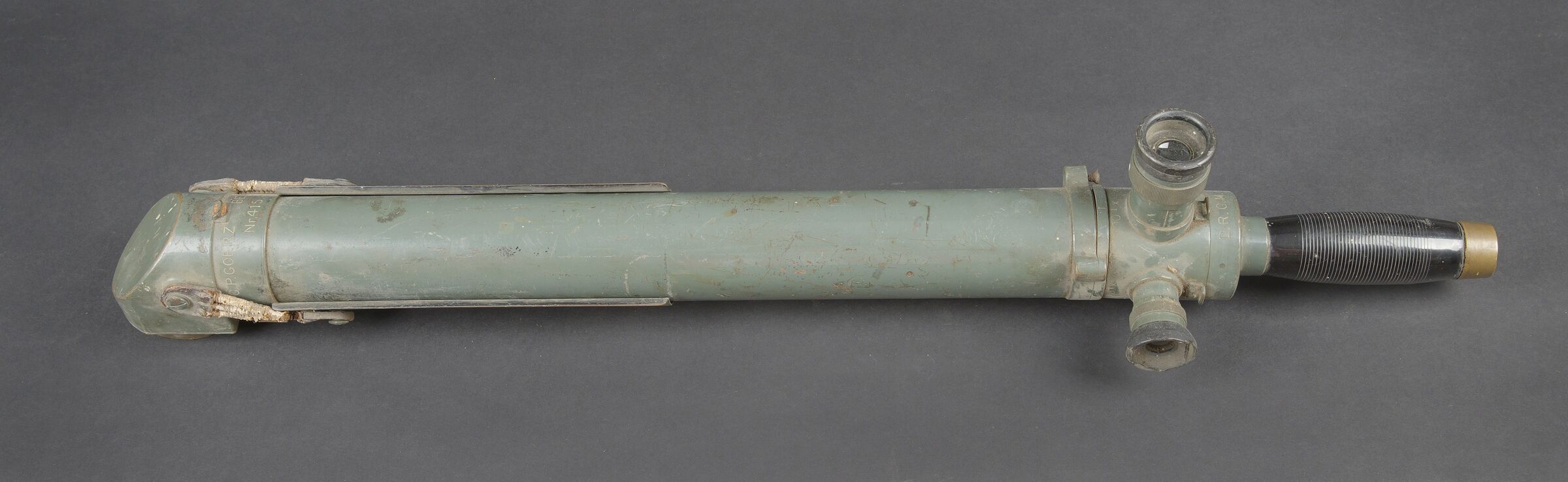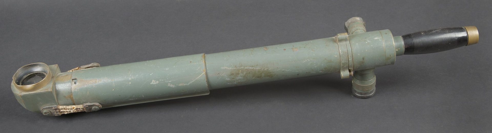 Monoculaire WH. En métal. Peinture Feldgrau à 70%. Pare soleil complet, maintenu par deux élastiques. Marquages Goerz Berlin Nr 41 DRGM. Poignée en bakélite complète. Les protèges oculaires présentent des manques. Optique claire et graduée présentant des tâches. A noter une certaine usure et patine de la pièce. Etat II+. WH monocular. Metal construction with Feldgrau paint 70% preserved. Complete sunshade held by two elastic bands. Marked Goerz Berlin Nr 41 DRGM. Complete bakelite handle. Eyepiece covers incomplete. Clear graduated optics with some spotting. Note some wear and patina to the piece. Condition II+.