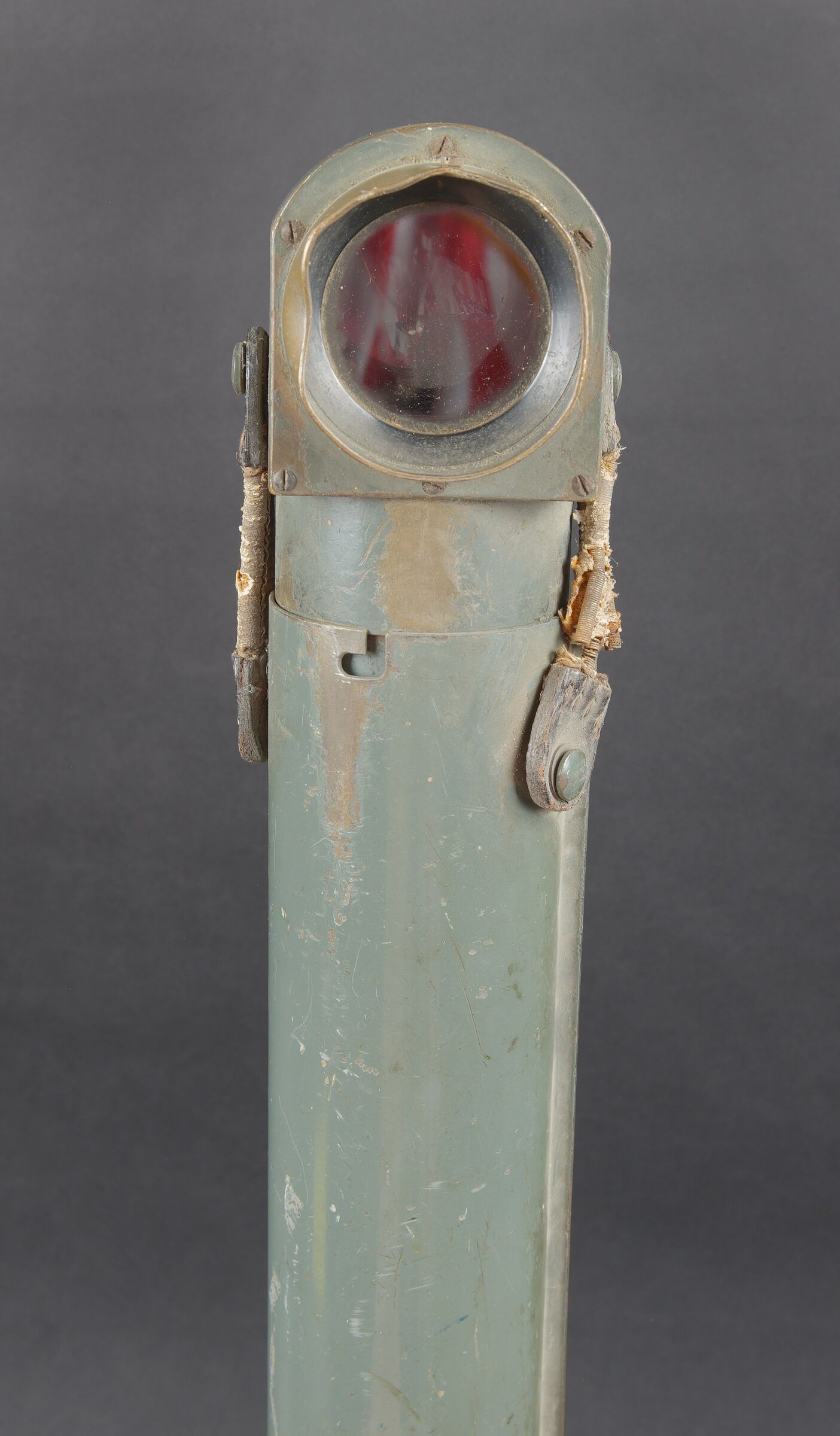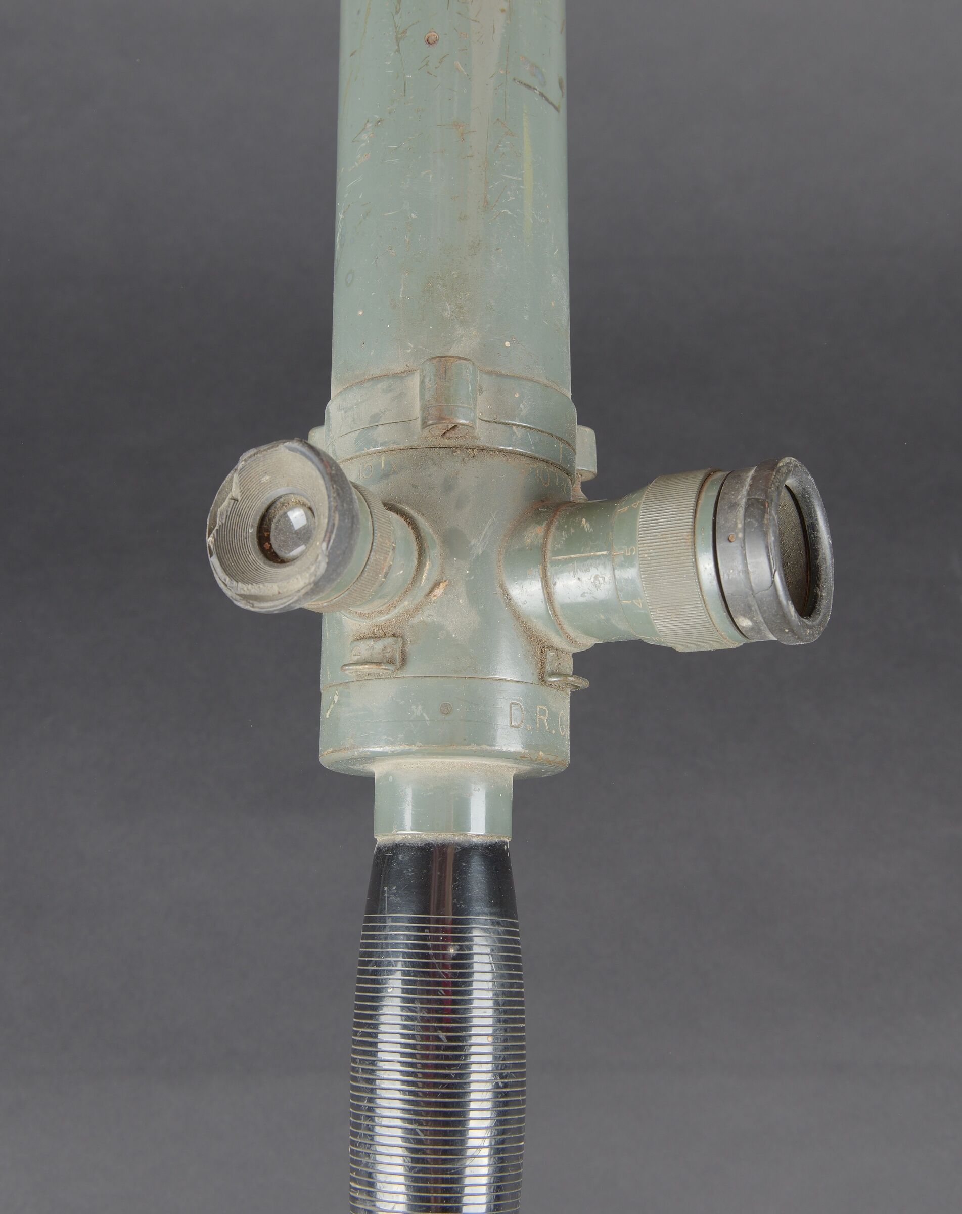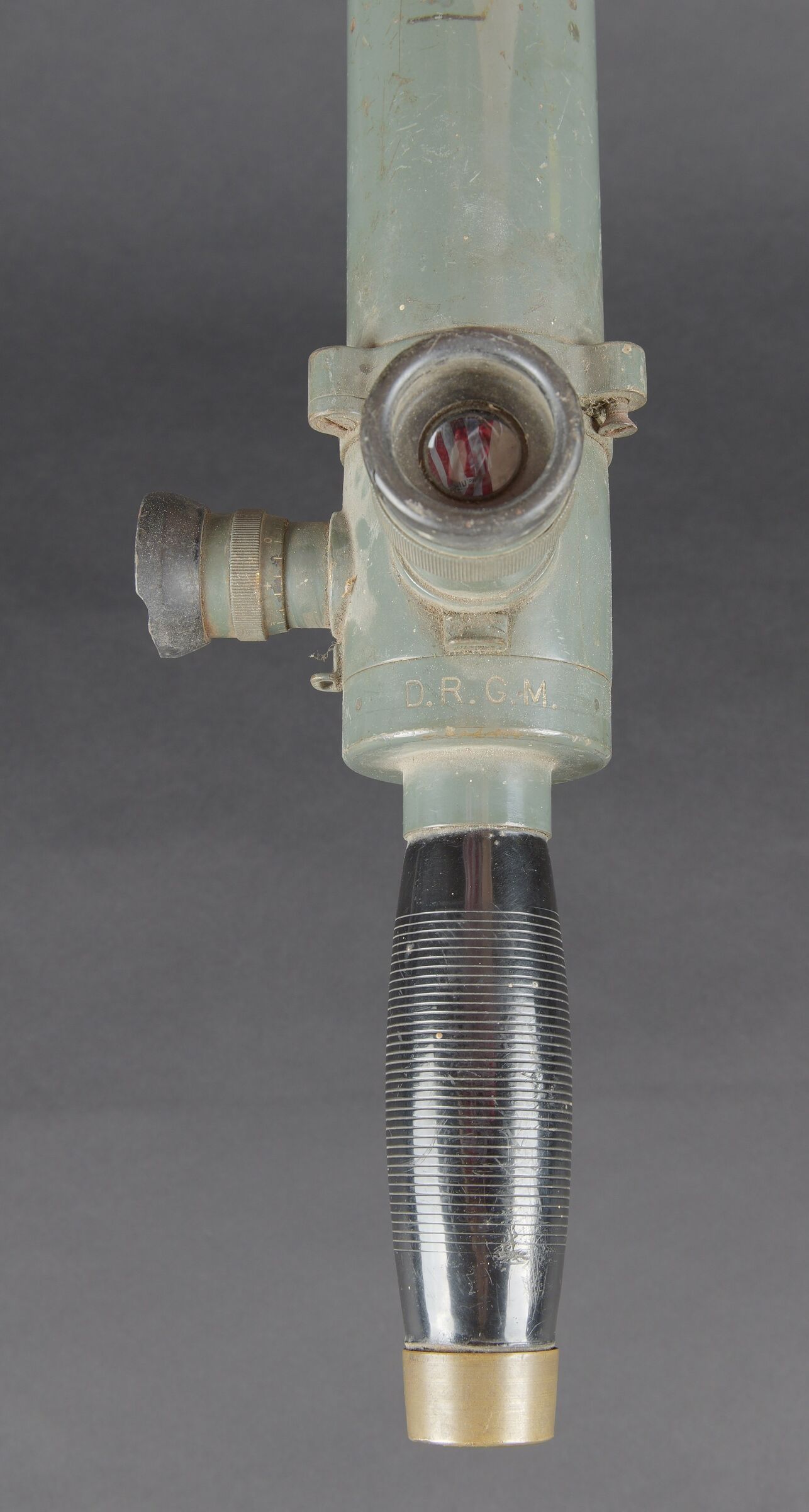 Monoculaire WH. En métal. Peinture Feldgrau à 70%. Pare soleil complet, maintenu par deux élastiques. Marquages Goerz Berlin Nr 41 DRGM. Poignée en bakélite complète. Les protèges oculaires présentent des manques. Optique claire et graduée présentant des tâches. A noter une certaine usure et patine de la pièce. Etat II+. WH monocular. Metal construction with Feldgrau paint 70% preserved. Complete sunshade held by two elastic bands. Marked Goerz Berlin Nr 41 DRGM. Complete bakelite handle. Eyepiece covers incomplete. Clear graduated optics with some spotting. Note some wear and patina to the piece. Condition II+.