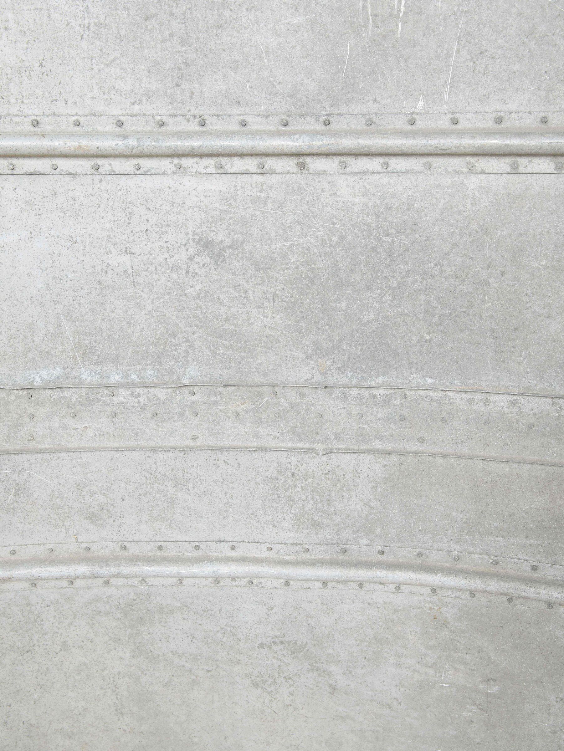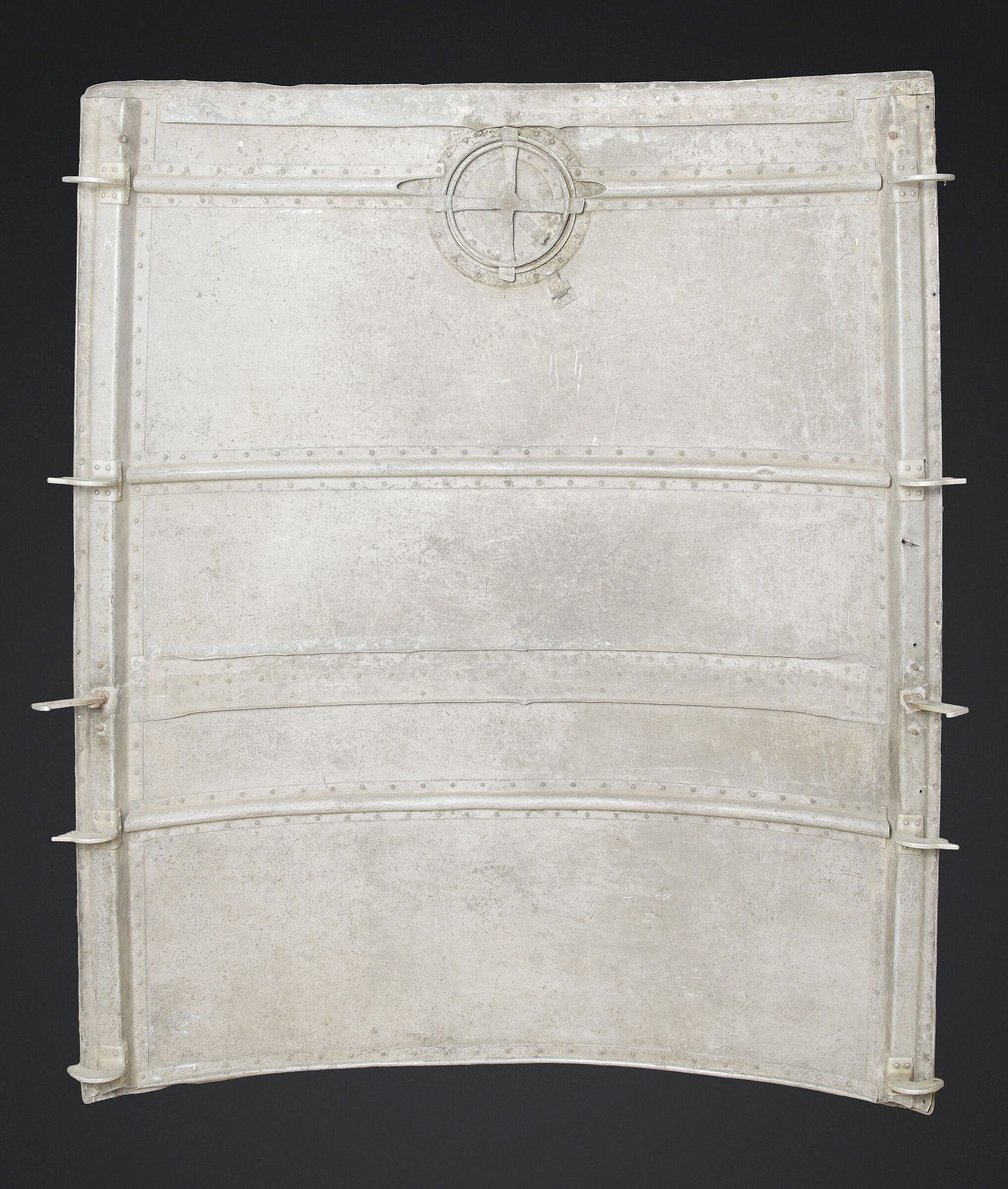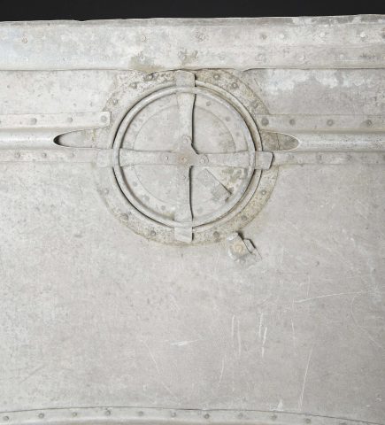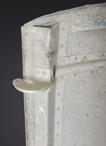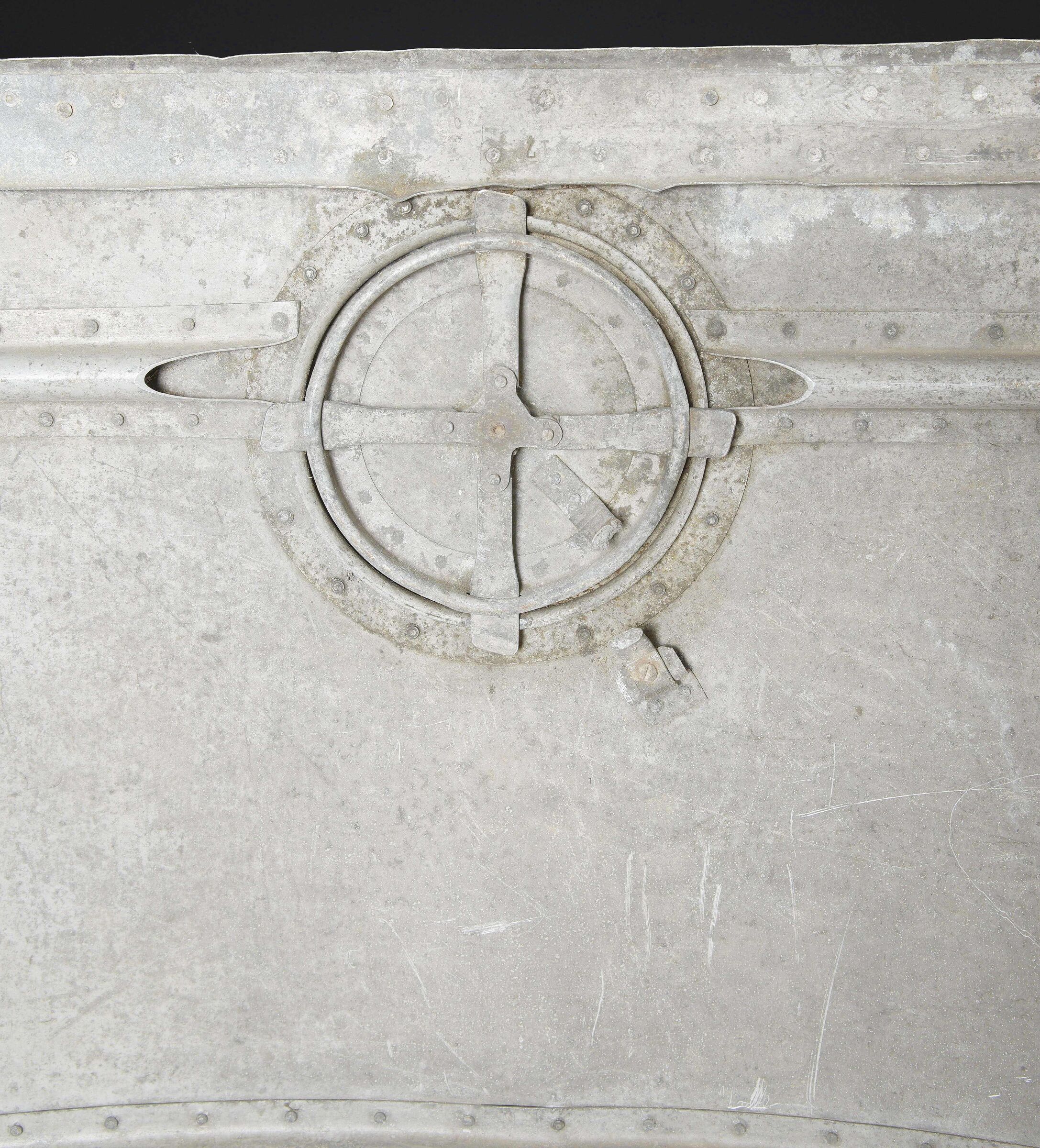 Morceau de carlingue d’avion. En aluminium. Très grande pièce disposant de plusieurs crochets. Peinture à 40%. Nombreuses bosses. Sans marquages visibles. Pièce provenant d’un crash. Dimensions 115 x 130 cm. A noter une certaine usure et patine de la pièce. Etat II+. Aircraft fuselage section Large aluminium fragment with multiple attachment hooks. Paint 40% preserved. Numerous dents. No visible markings. Recovered from a crash. Dimensions 115 × 130 cm. Note some wear and patina to the piece. Condition II+.