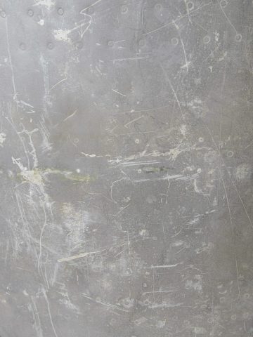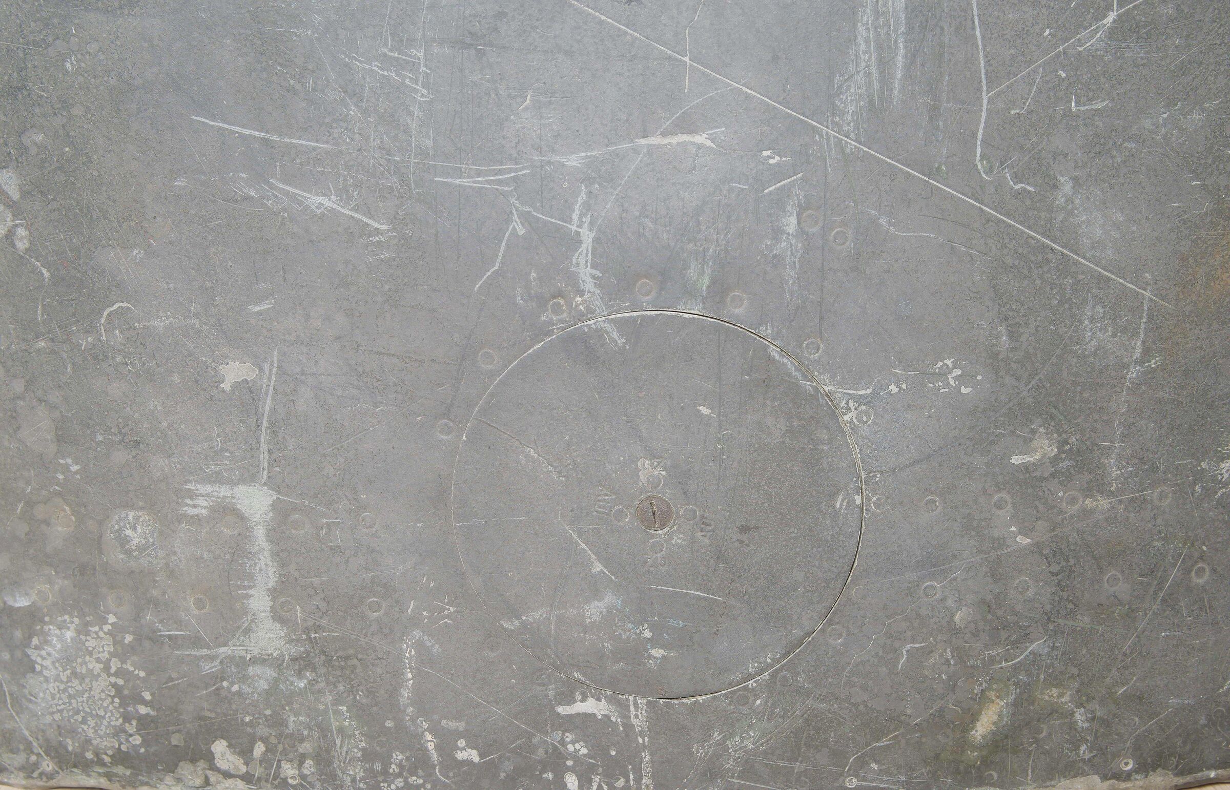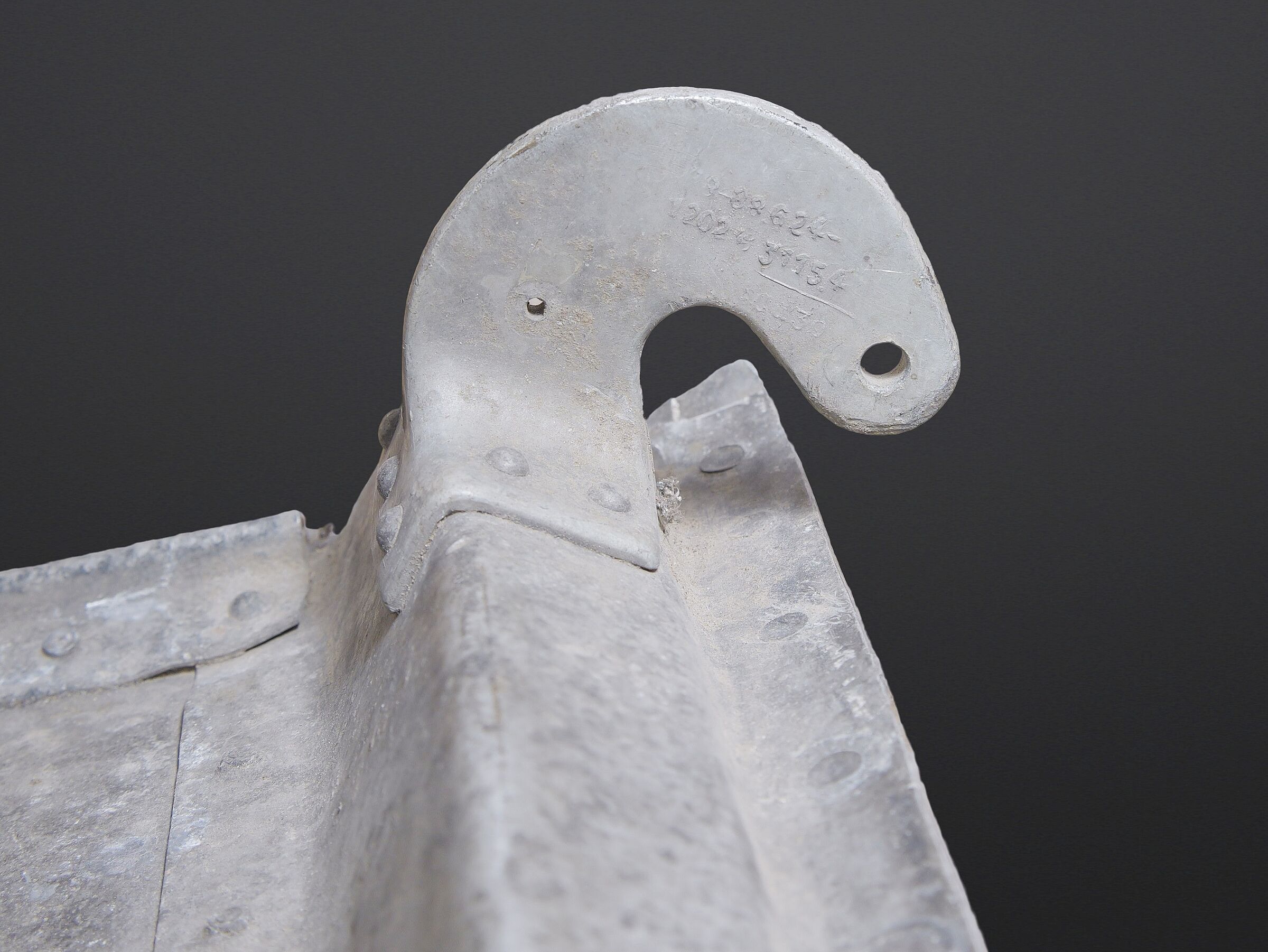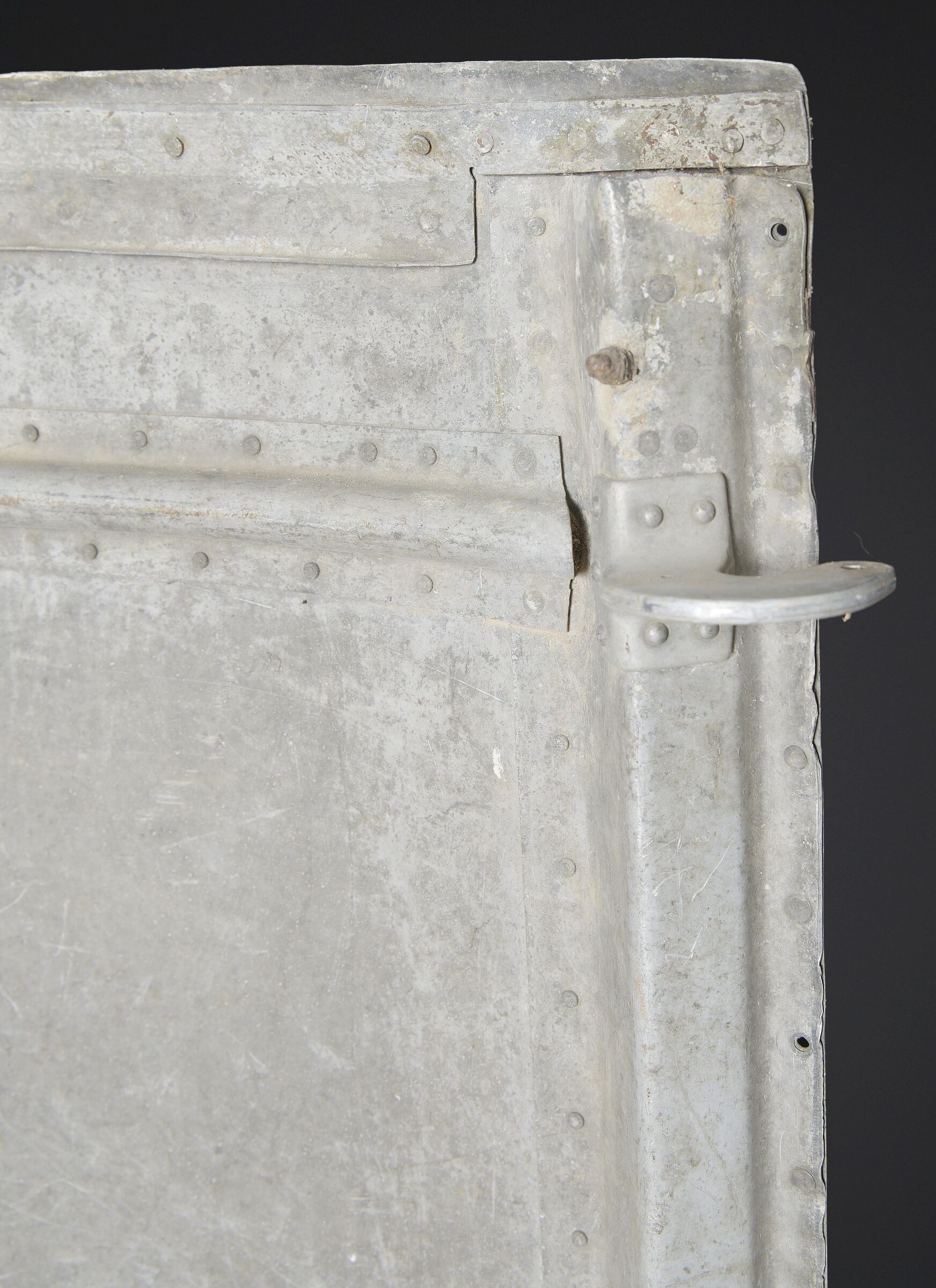 Morceau de carlingue d’avion. En aluminium. Très grande pièce disposant de plusieurs crochets. Peinture à 40%. Nombreuses bosses. Sans marquages visibles. Pièce provenant d’un crash. Dimensions 115 x 130 cm. A noter une certaine usure et patine de la pièce. Etat II+. Aircraft fuselage section Large aluminium fragment with multiple attachment hooks. Paint 40% preserved. Numerous dents. No visible markings. Recovered from a crash. Dimensions 115 × 130 cm. Note some wear and patina to the piece. Condition II+.