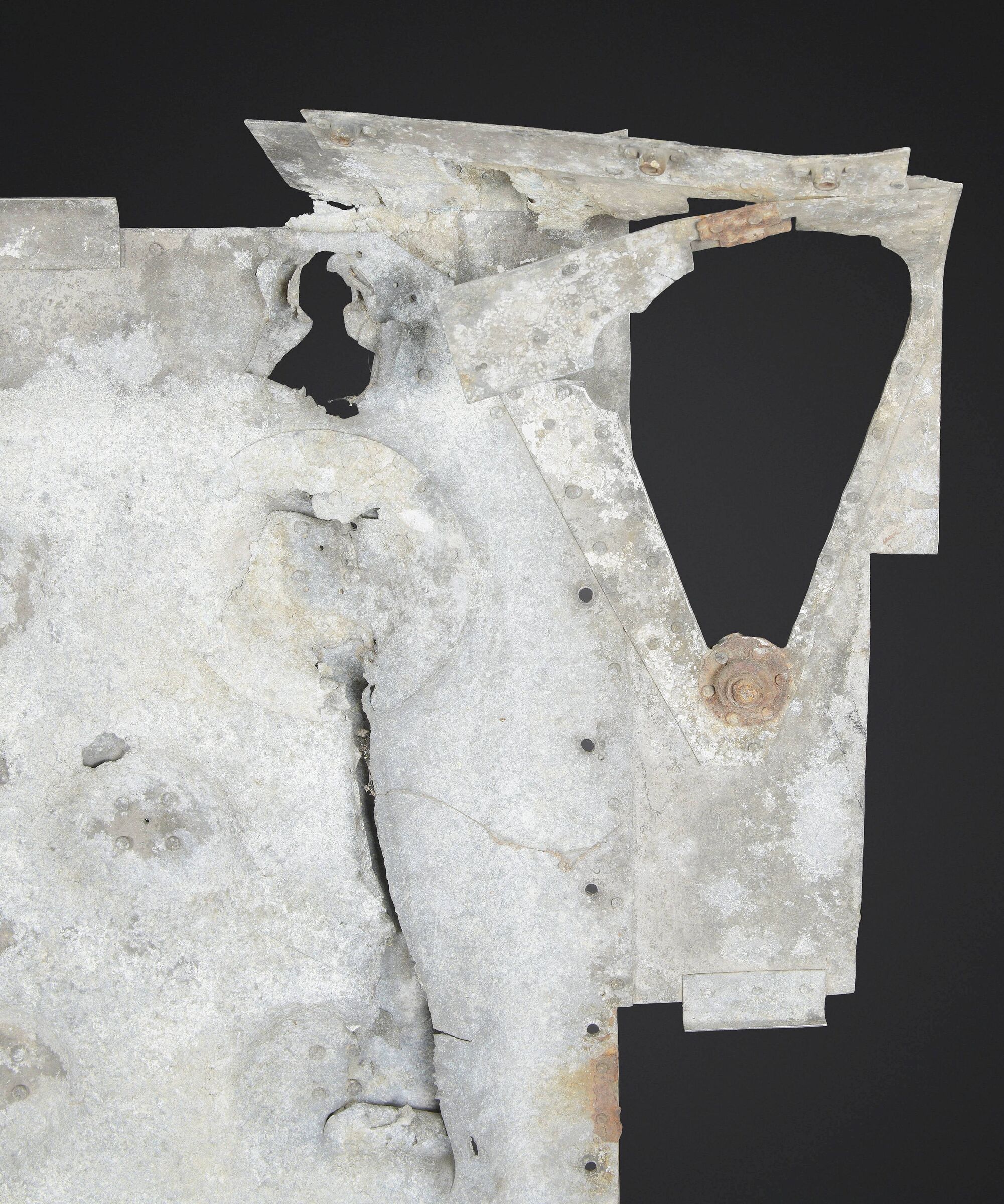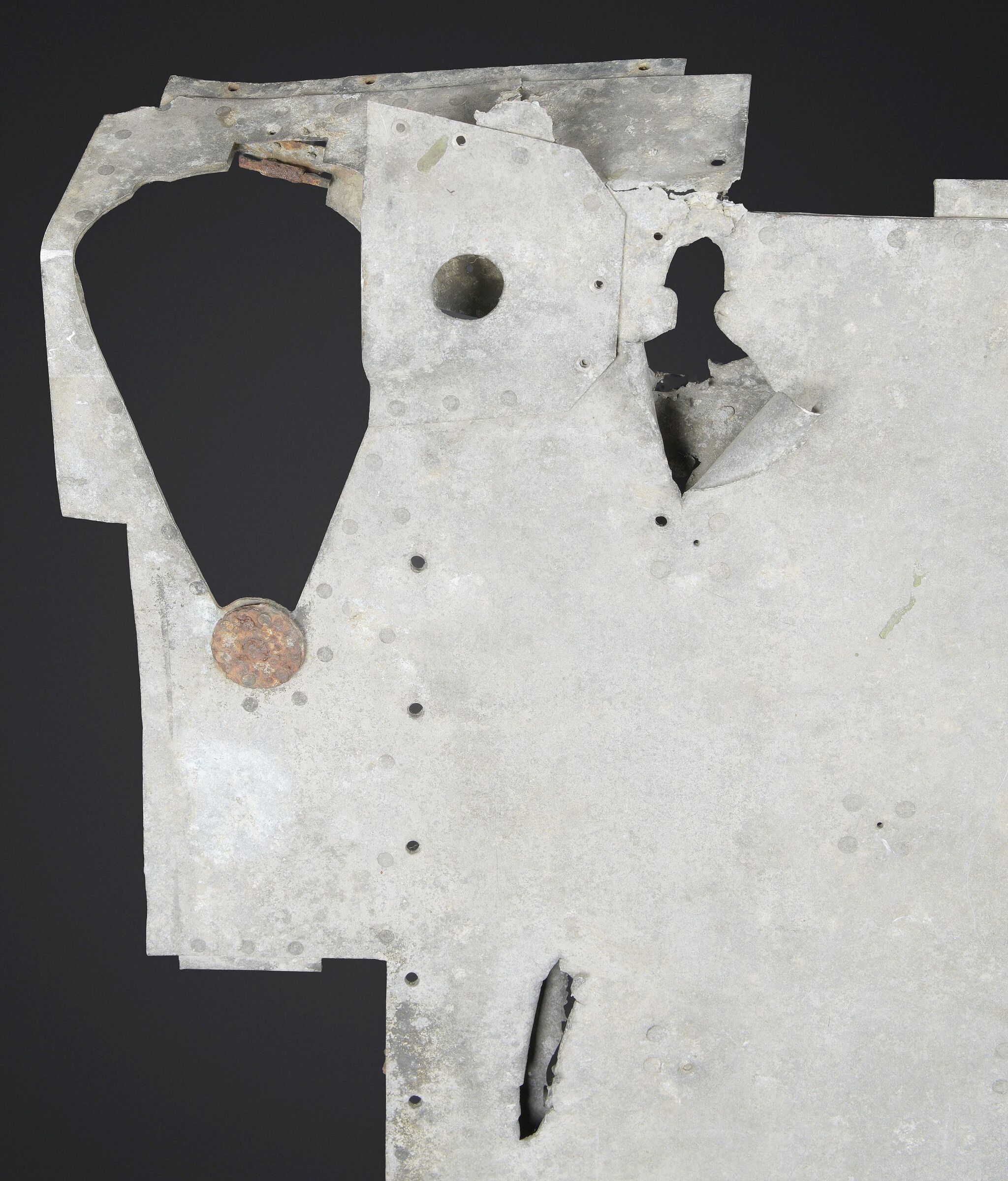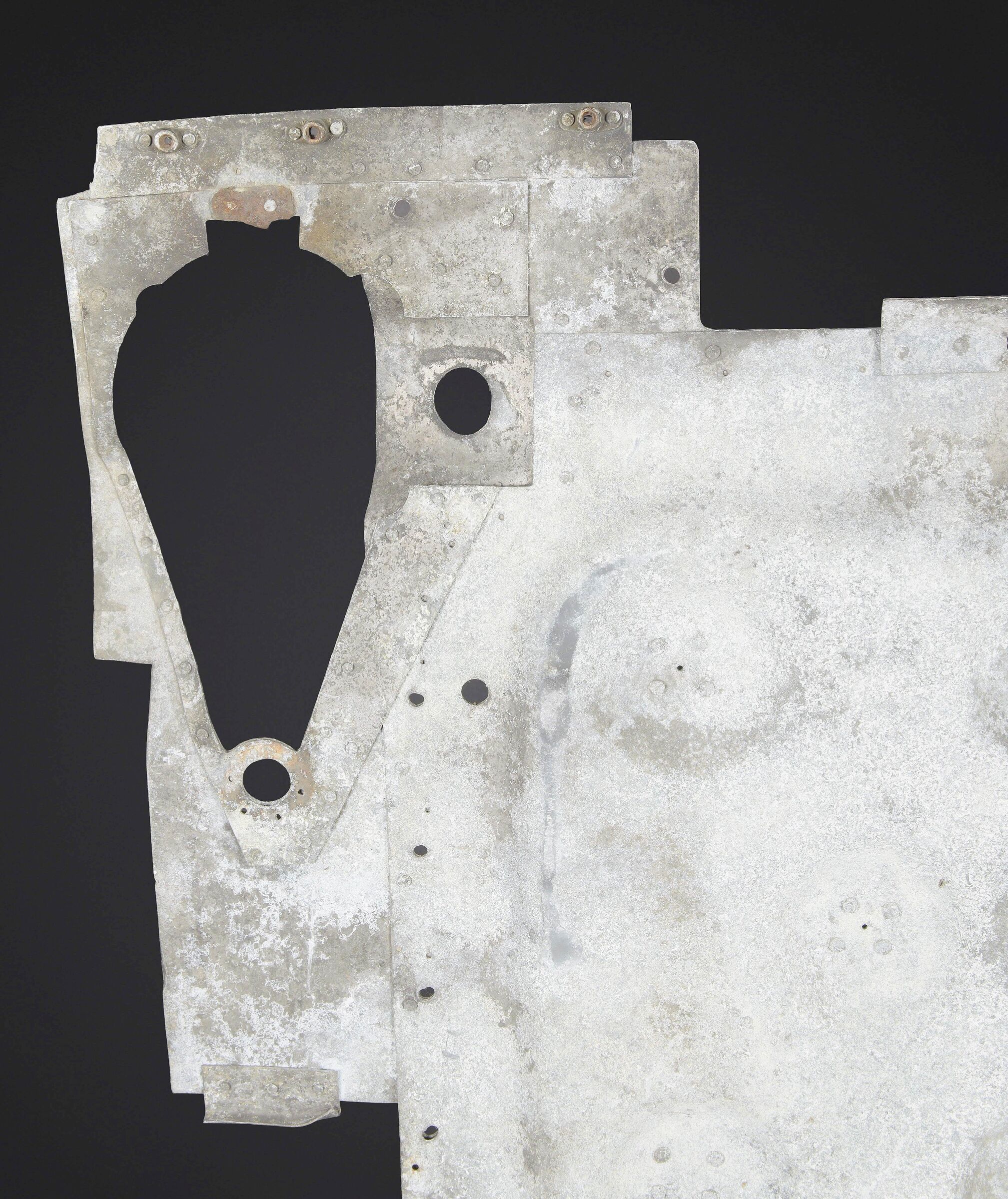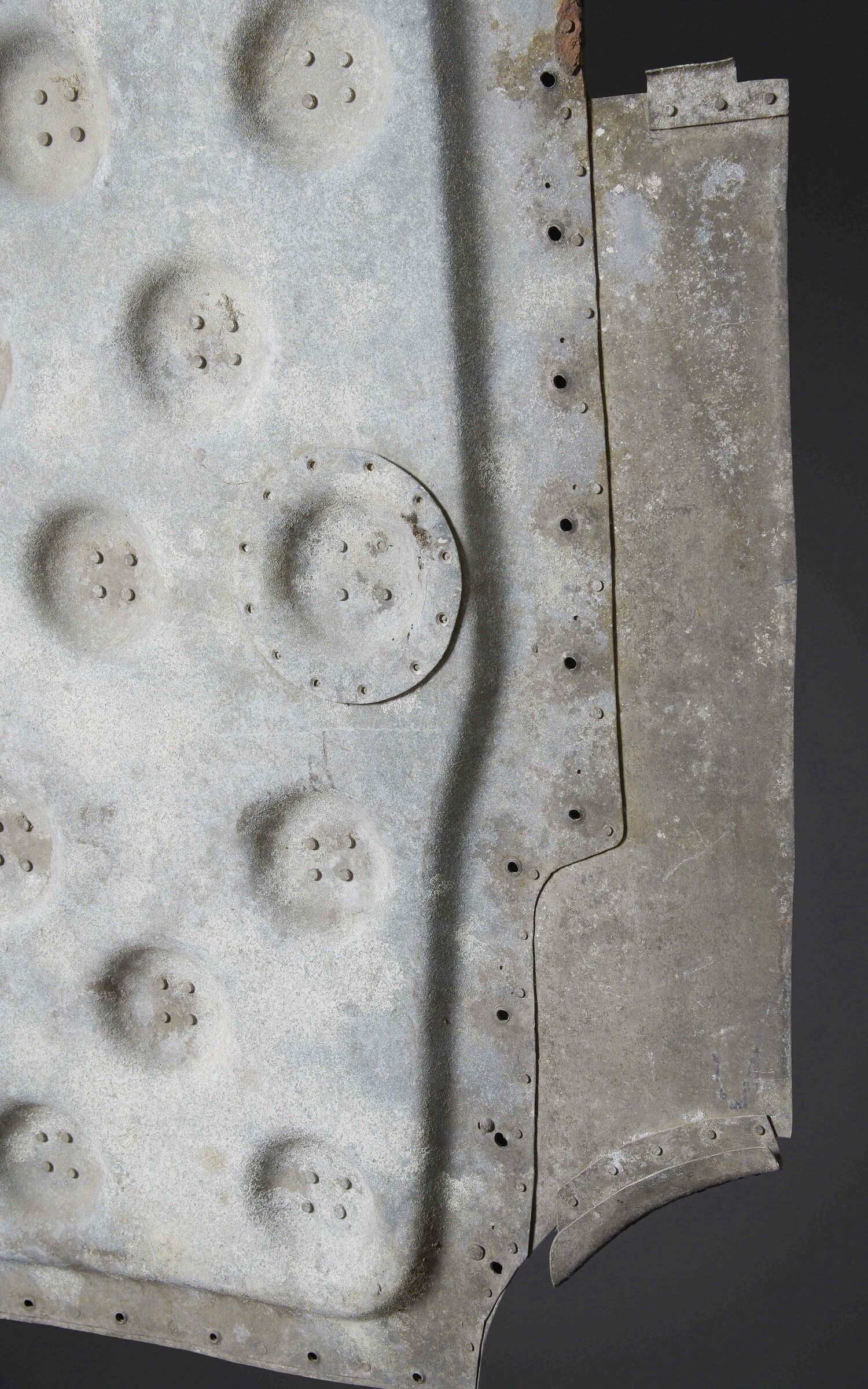 Morceau de carlingue. Important morceau d’aluminium. Le verso est alvéolé. Impact pénétrant sur un côté le projectile est visiblement ressorti après l’impact. Pièce provenant d’un crash d’avion. Sans marquages visibles. Complètement dépourvu de peinture. Dimensions 140 x 120 cm. A noter une certaine usure et patine de la pièce. Etat II+. Aircraft fuselage section Large aluminium fragment with honeycomb internal structure. Penetrating impact with clear exit point visible. Recovered from an aircraft crash. No visible markings. Completely devoid of paint. Dimensions 140 × 120 cm. Note some wear and patina to the piece. Condition II+.