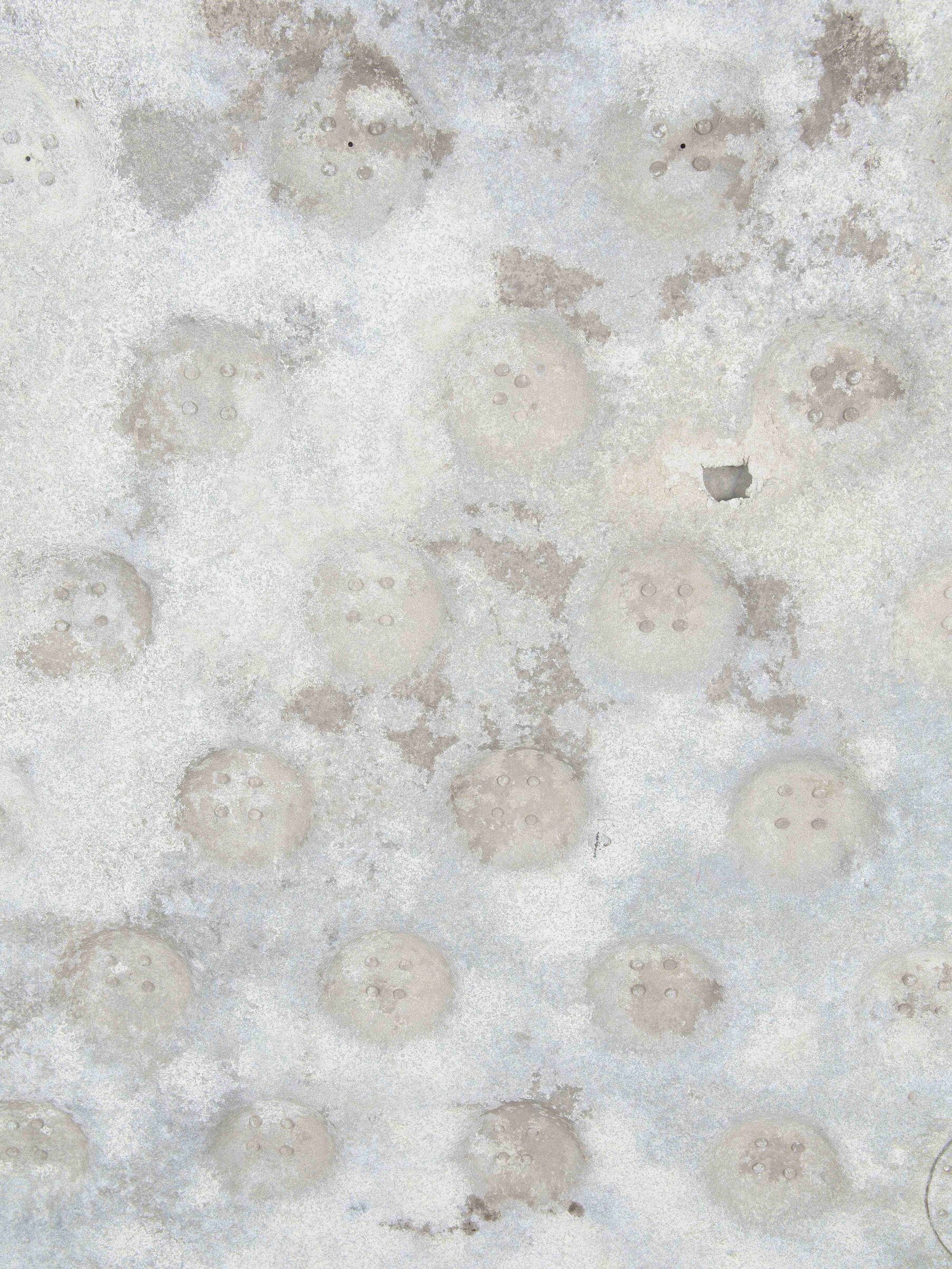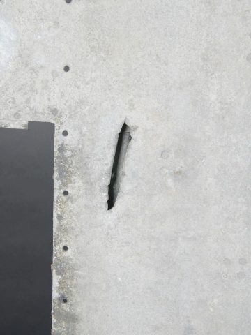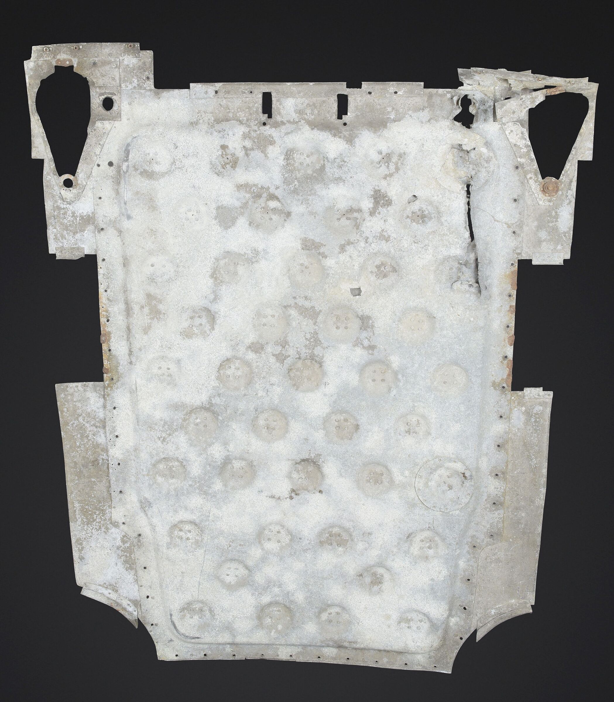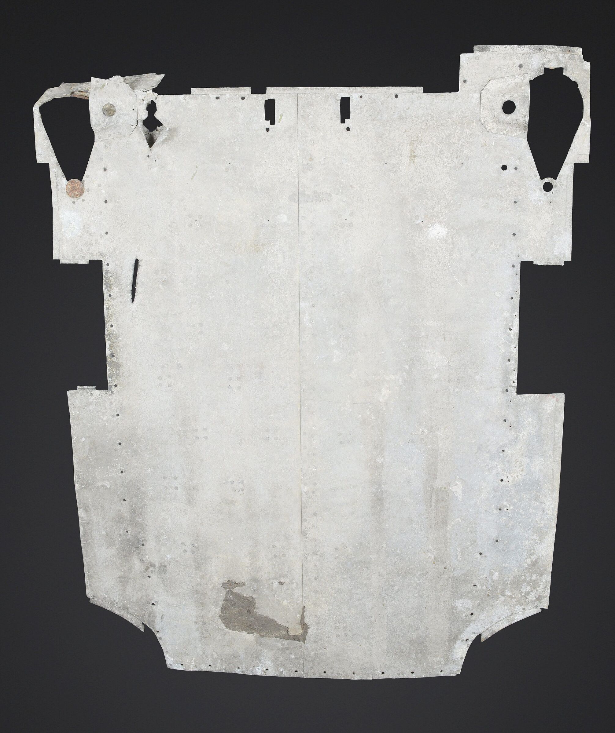 Morceau de carlingue. Important morceau d’aluminium. Le verso est alvéolé. Impact pénétrant sur un côté le projectile est visiblement ressorti après l’impact. Pièce provenant d’un crash d’avion. Sans marquages visibles. Complètement dépourvu de peinture. Dimensions 140 x 120 cm. A noter une certaine usure et patine de la pièce. Etat II+. Aircraft fuselage section Large aluminium fragment with honeycomb internal structure. Penetrating impact with clear exit point visible. Recovered from an aircraft crash. No visible markings. Completely devoid of paint. Dimensions 140 × 120 cm. Note some wear and patina to the piece. Condition II+.