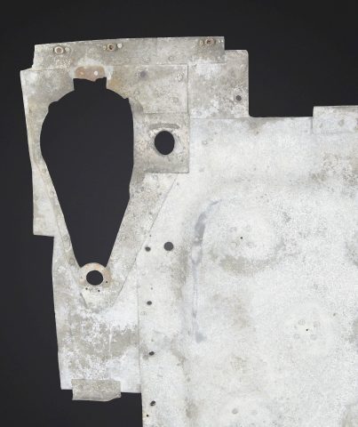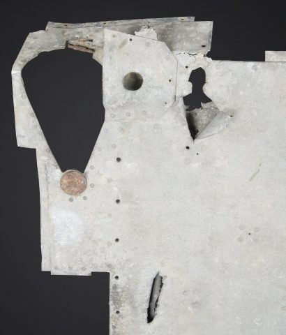 Morceau de carlingue. Important morceau d’aluminium. Le verso est alvéolé. Impact pénétrant sur un côté le projectile est visiblement ressorti après l’impact. Pièce provenant... en savoir plus