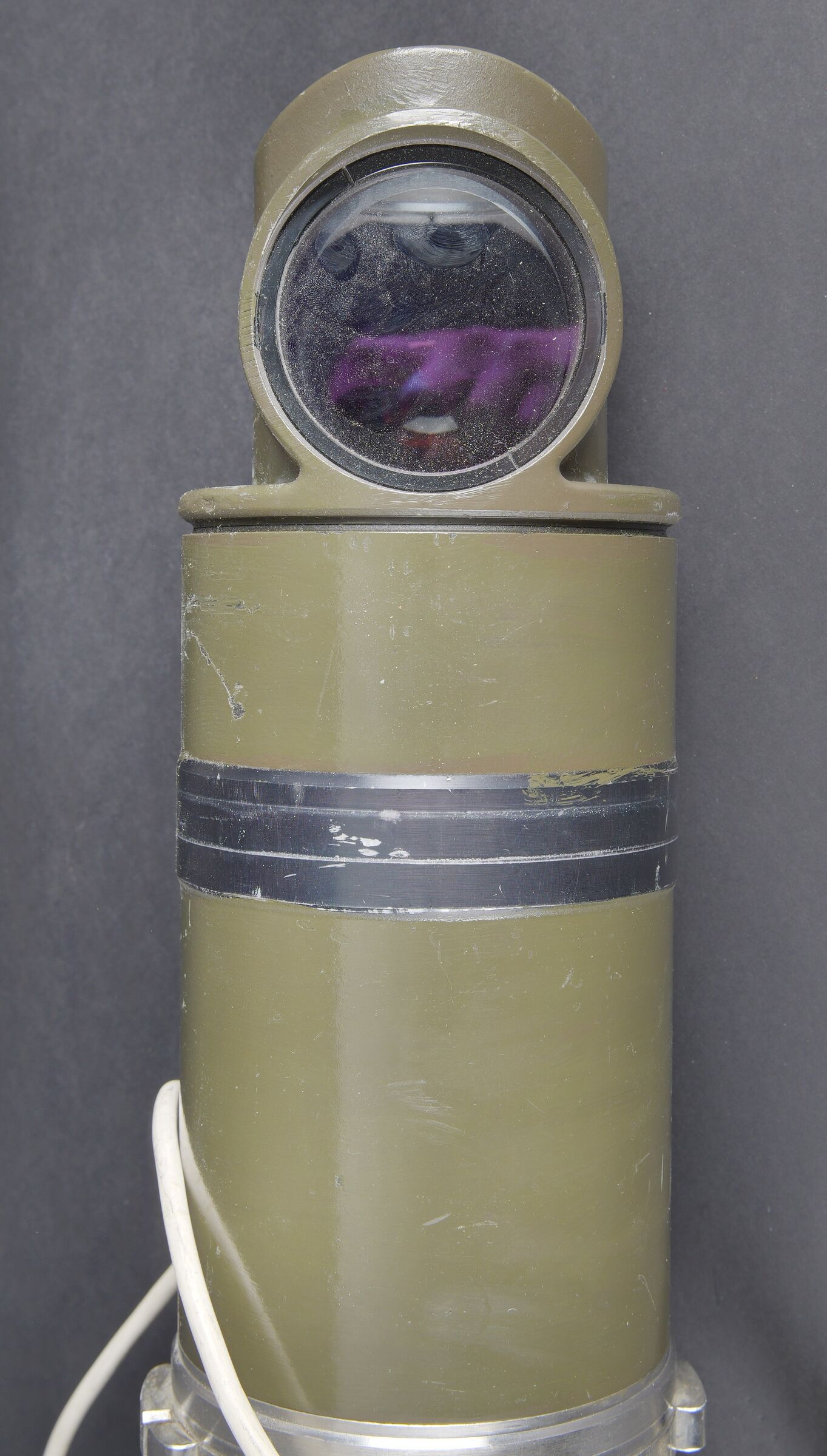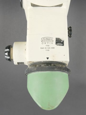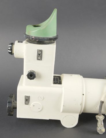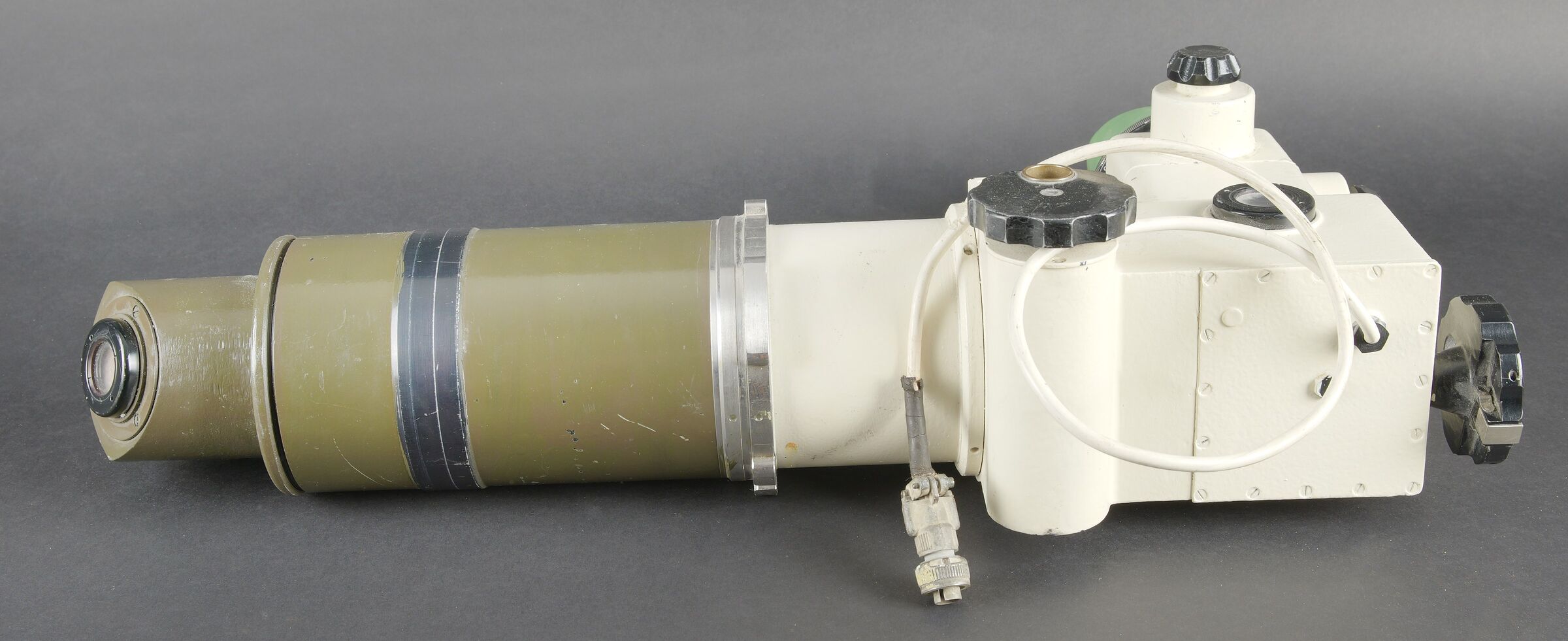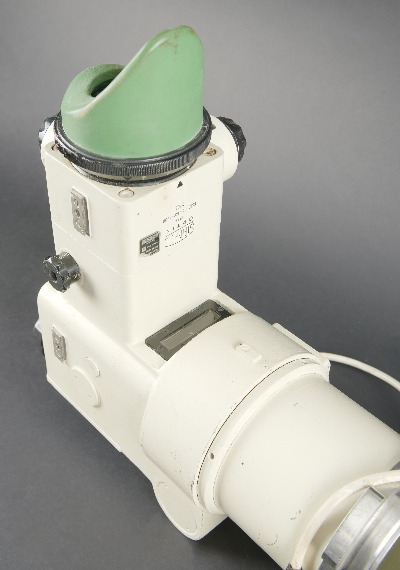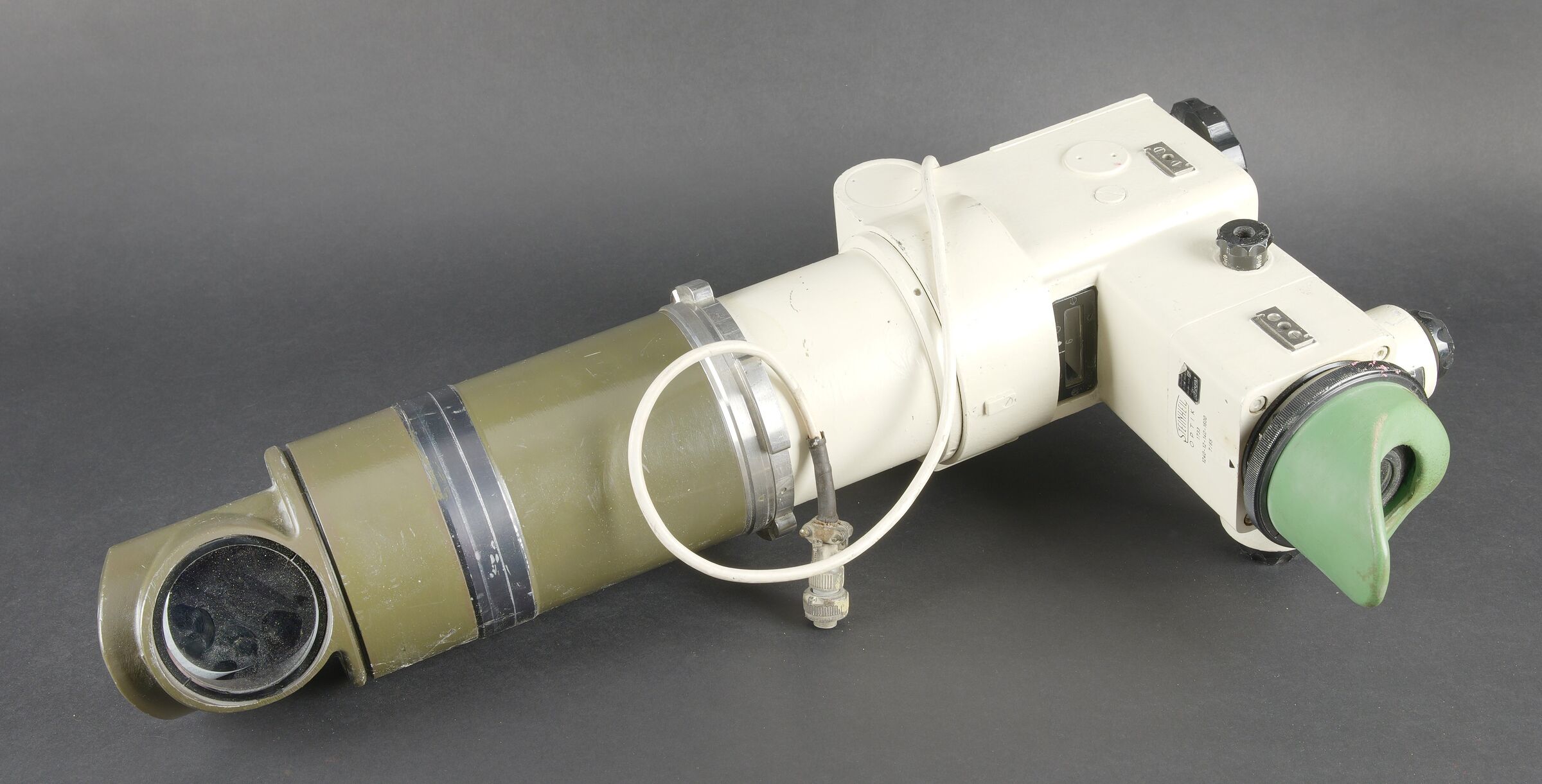 Optique de char Leopard I. En métal. Peinture blanche et kaki à 90%. Toutes les pièces mobiles sont fonctionnelles. Bonnette en caoutchouc complète. Câble et prise complets. Fabrication Steinheil Optik 1733 1240-12-140-1600 7/65. Optique claire et graduée, présentant quelques tâches. Modèle de viseur périscopique monoculaire utilisé par le chef de char pour la détection d’objectifs. Ce périscope panoramique est capable de pivoter à 360 degrés et possède deux grossissement X4 et X20. Le viseur intègre un dispositif contrarotatif permettant de rester aligner sur l’objectif pendant que le chef de char rallie la tourelle sur ce dernier. Il a également copié par les israéliens pour équiper le char Merkava. A noter une certaine usure et patine de la pièce. Etat II+. Leopard I tank optic Metal construction. White and khaki paint 90% preserved. All moving parts functional. Complete rubber eyepiece. Cable and plug present. Manufactured by Steinheil Optik 1733 1240-12-140-1600 dated 7/65. Clear graduated optics with some spotting. Monocular periscopic sight model used by the tank commander for target acquisition. This panoramic periscope is capable of 360-degree rotation and provides two magnifications ×4 and ×20. The sight incorporates a counter-rotating device allowing the line of sight to remain on the target while the turret is traversed onto it. This model was also copied by the Israelis for the Merkava tank. Note some wear and patina to the piece. Condition II+.