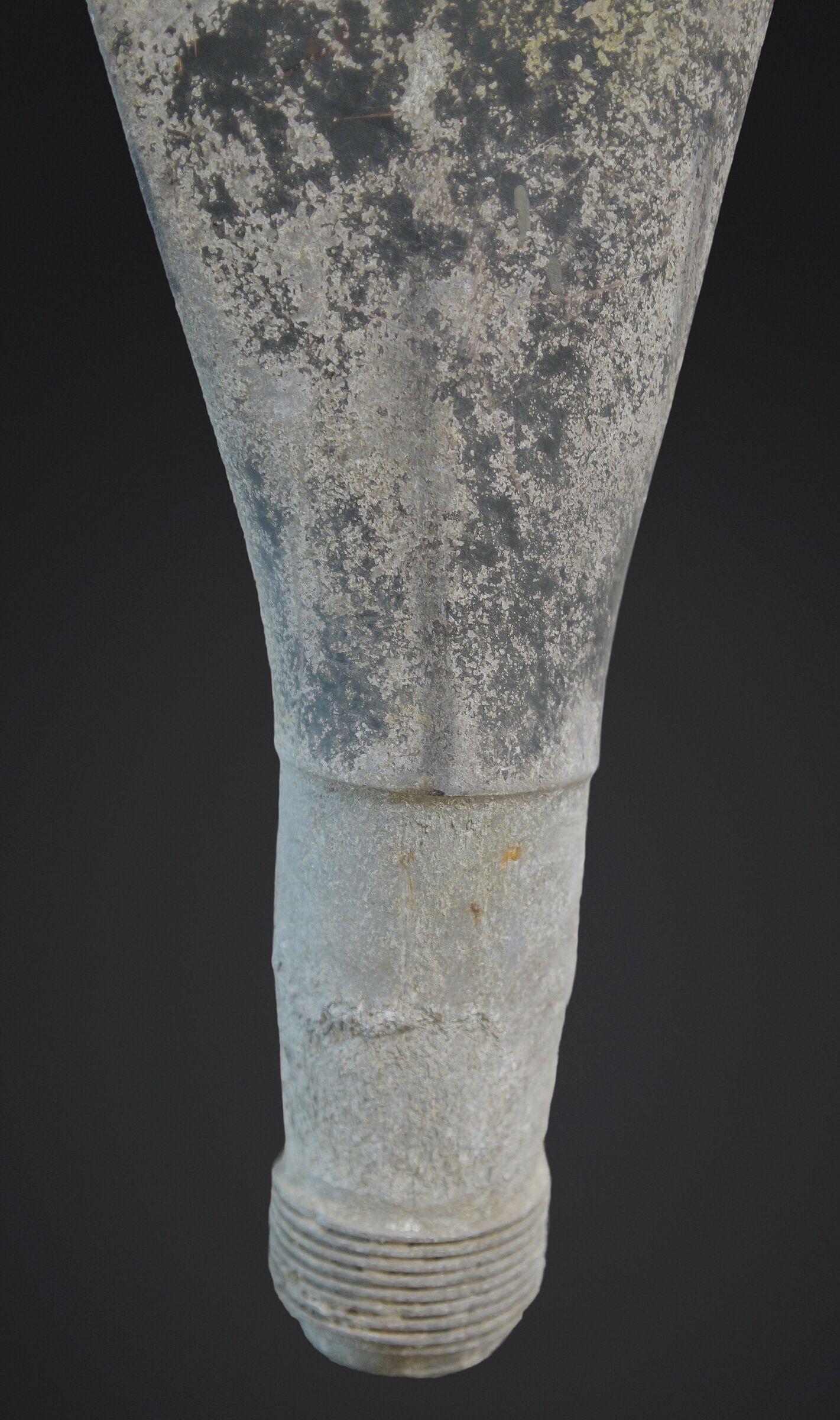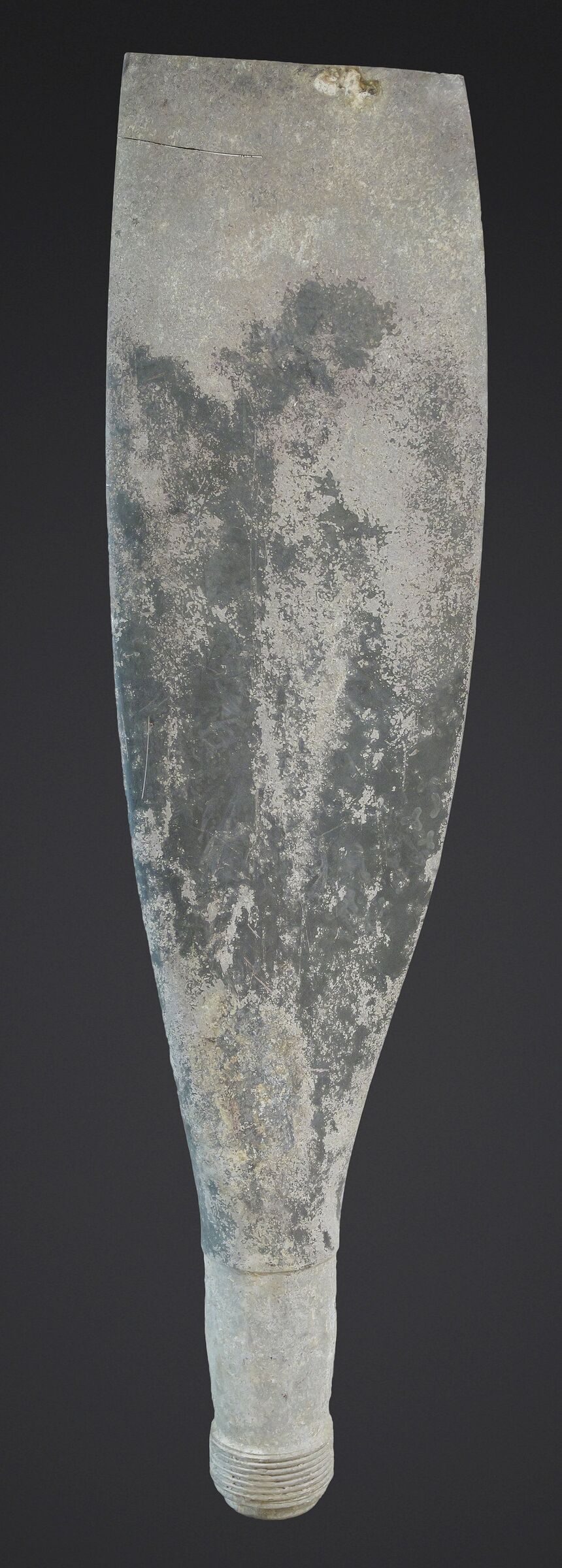 Pale d’hélice de crash. En métal. Fortement oxydée. La partie supérieure de la pale est manquante. Sans marquages visibles. Morceau d’avion provenant d’un crash en Belgique. Hauteur environ 130 cm. Poids environ 40 KG. A noter une certaine usure et oxydation de la pièce. Belle relique des combats pour la libération de la Belgique. Etat II+. Crash propeller blade Metal example heavily oxidised with upper section missing. No visible markings. Aircraft wreck fragment recovered in Belgium. Height approximately 130 cm. Weight approximately 40 kg. Fine relic of the fighting for the liberation of Belgium. Condition II+.