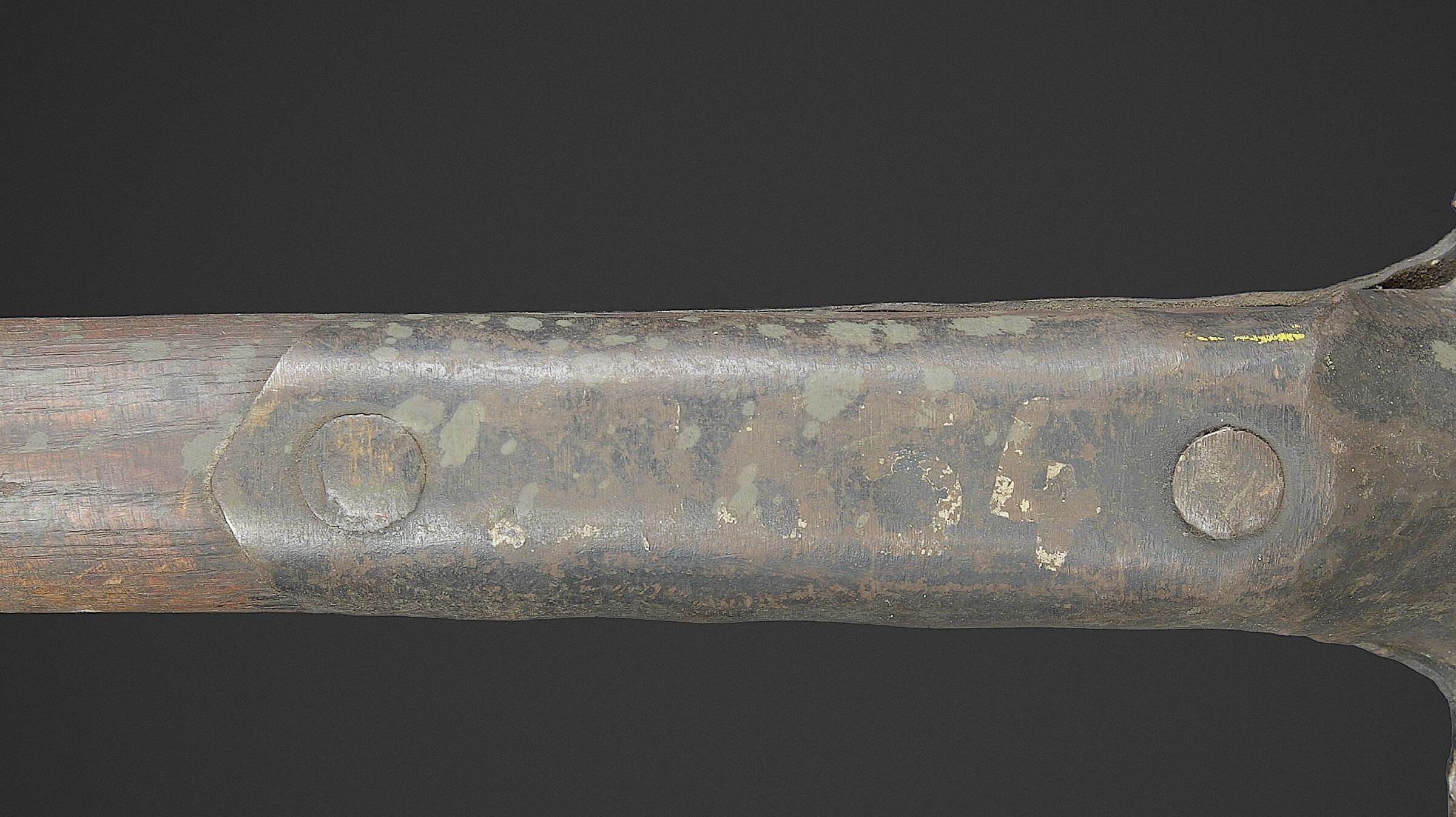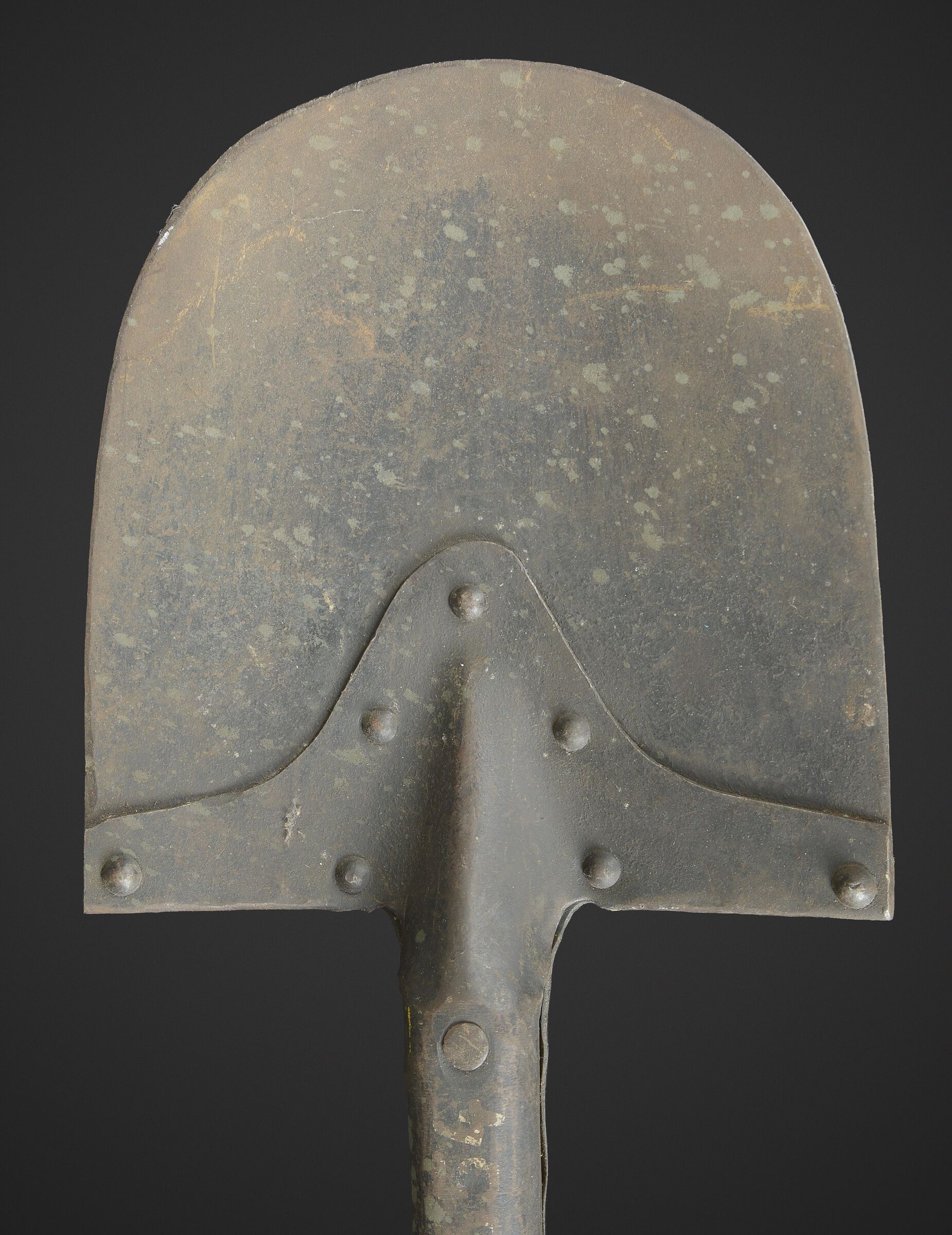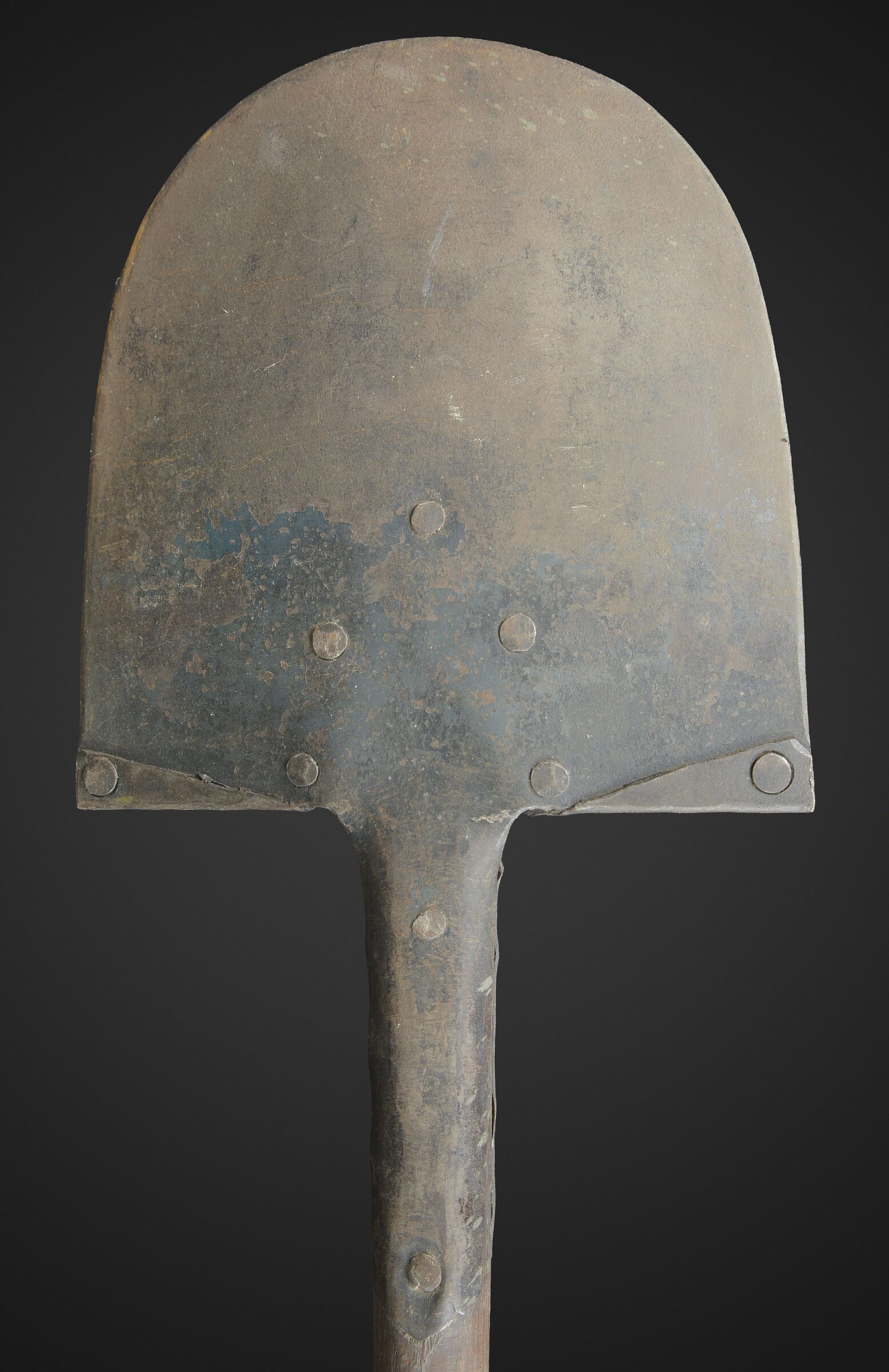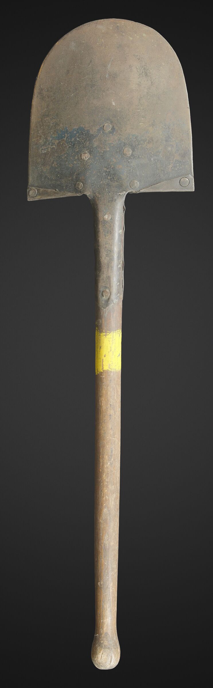 Pelle WH. Manche en bois, bout arrondi. Bande jaune faisant le tour du manche. Partie métallique en métal, peinture noire à 70%. Restes de marquages illisibles. Longueur 84 cm. A noter une certaine usure et patine de la pièce. Etat II+. WH shovel. Wooden handle with rounded end and yellow identification band. Metal blade with 70% black paint and traces of illegible markings. Length 84 cm. Showing wear and patina. Condition II+.