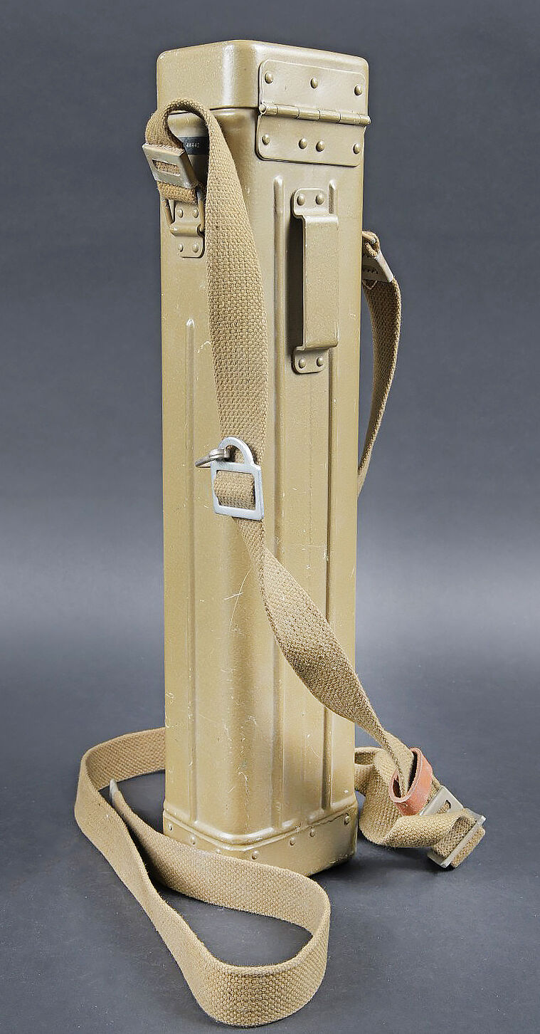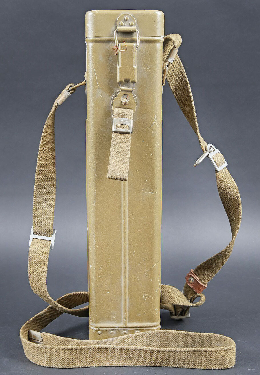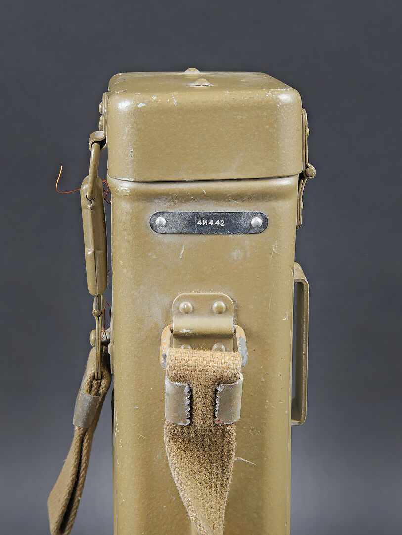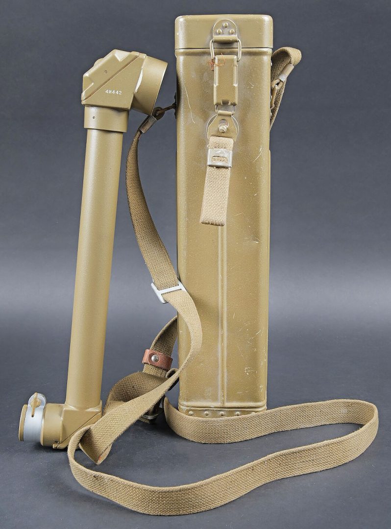 Périscope Pacte de Varsovie. Boite en métal. Attache complète. Sangle de transport présente. Numéro 4N442. Peinture à 70%. Modèle de périscope se fixant sur une optique secondaire. En métal, peinture à 90%. Numéro 4N442. Optique en parfait état. A noter une certaine usure et patine de la pièce. Etat II+. Warsaw Pact periscope Metal transport case with complete fastening system and carrying strap. Serial number 4N442. Paint 70% preserved. Periscope model designed for mounting on a secondary optic. Metal periscope with paint 90% preserved. Serial number 4N442. Optics in perfect condition. Note some wear and patina to the piece. Condition II+.