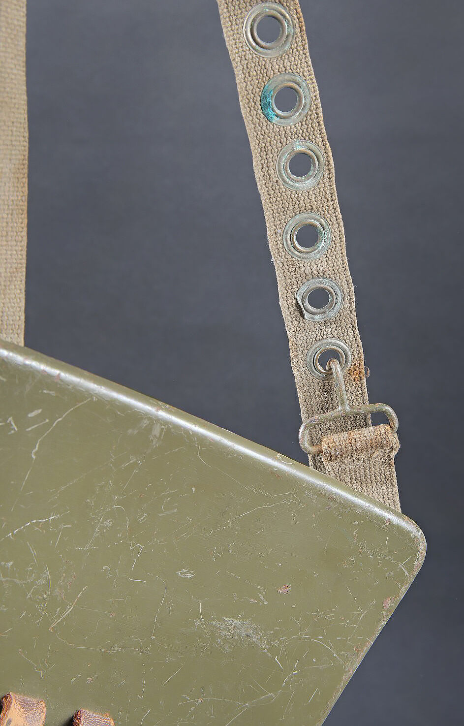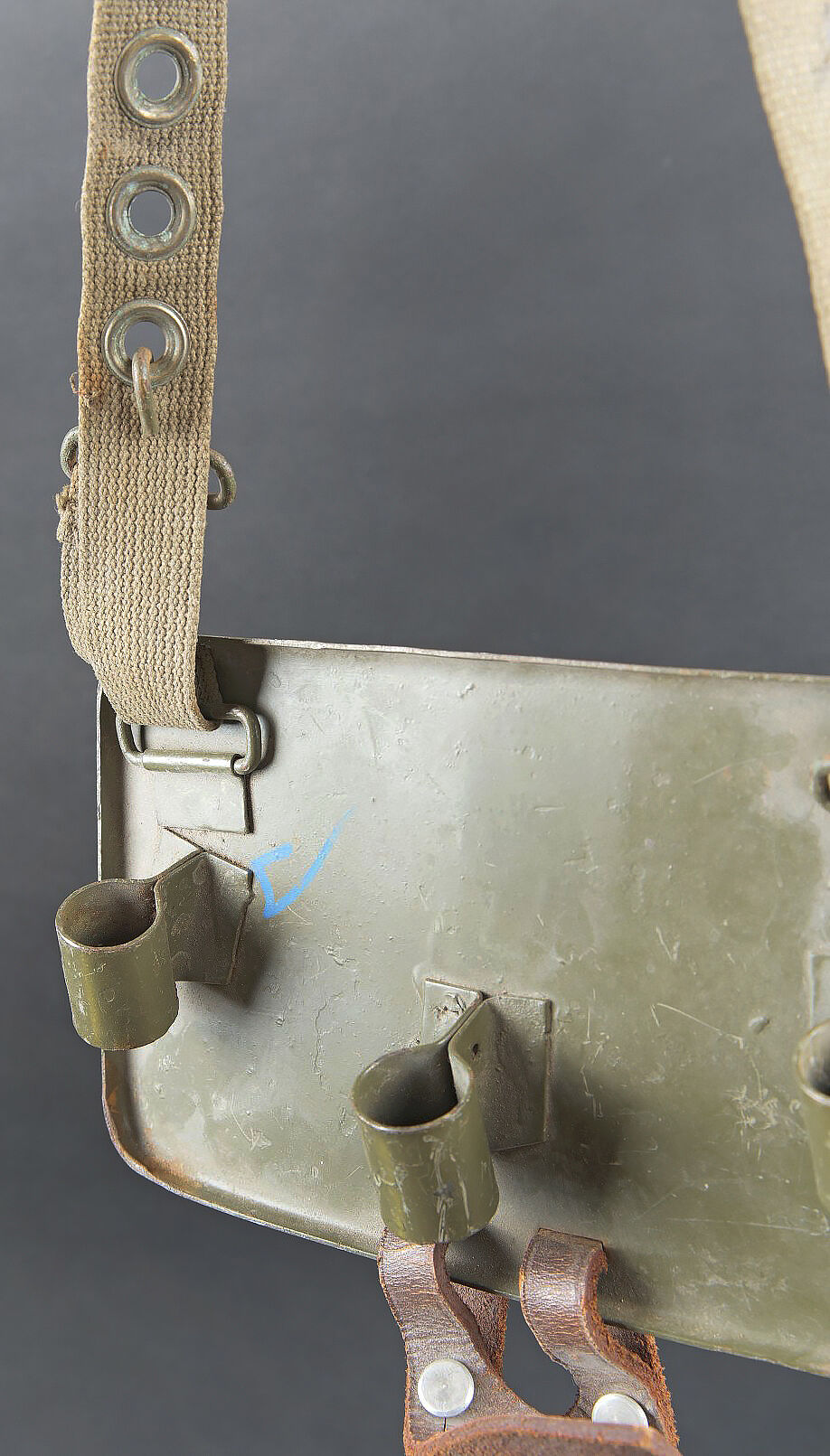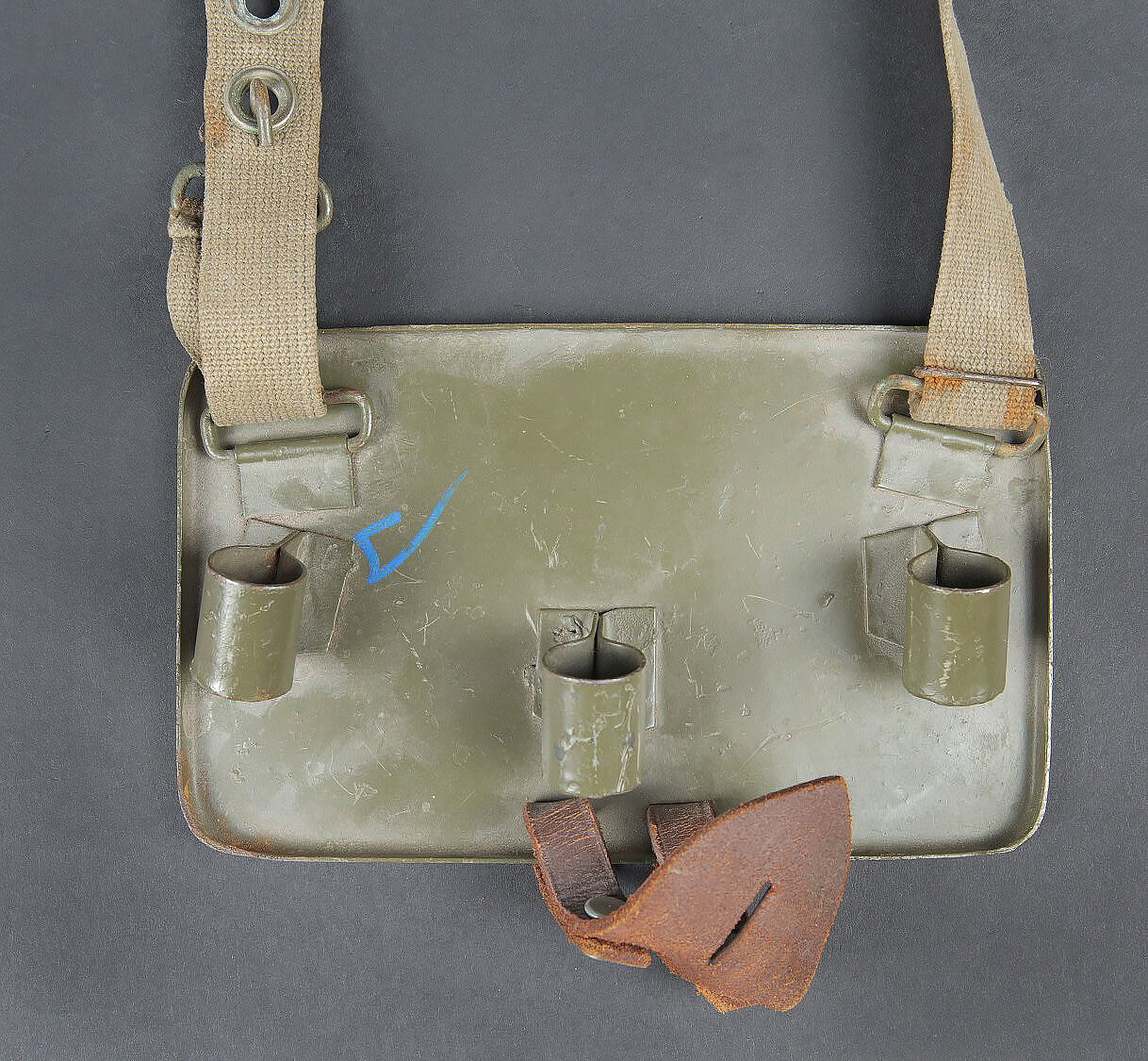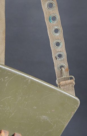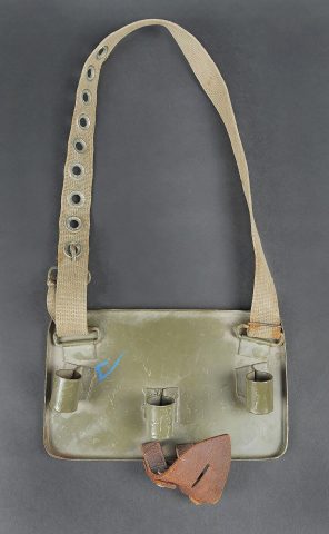 Plaque de poitrine pour télémètre WH. Plaque en métal, disposant de trois points de fixation pour les pieds du petit télémètre WH. Patte de boutonnière en cuir marron, visiblement postérieure. Sangle de fixation au cou en forte toile Feldgrau. Peinture Feldgrau à 70%. Sans marquages visibles. A noter une certaine usure et patine de la pièce. Etat II+. Breast plate for WH rangefinder Metal construction with three mounting points for the feet of the small WH rangefinder. Brown leather buttonhole tab of later manufacture. Heavy Feldgrau canvas neck strap. Feldgrau paint 70% preserved. No visible markings. Note some wear and patina to the piece. Condition II+.