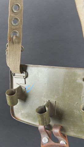 Plaque de poitrine pour télémètre WH. Plaque en métal, disposant de trois points de fixation pour les pieds du petit télémètre WH. Patte de boutonnière en cuir marron, visiblement... en savoir plus