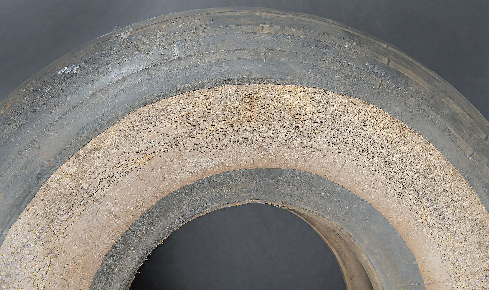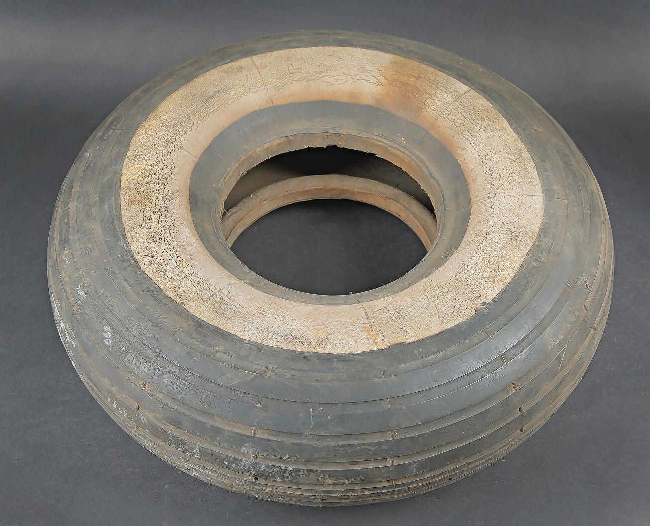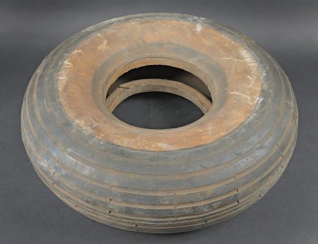 Pneu de Junker 52. En caoutchouc noir avec bande blanche. Le pneu est un peu craquelé. Les marquages sont illisibles. Diamètre a peu près 45 cm. Fabrication Continental 500 x 180. A noter une certaine usure et patine de la pièce. Etat II+. Junkers Ju 52 tyre. Black rubber with white band. Continental 500 × 180. Slightly cracked. Diameter approx. 45 cm. Showing normal wear and patina. Condition II+.