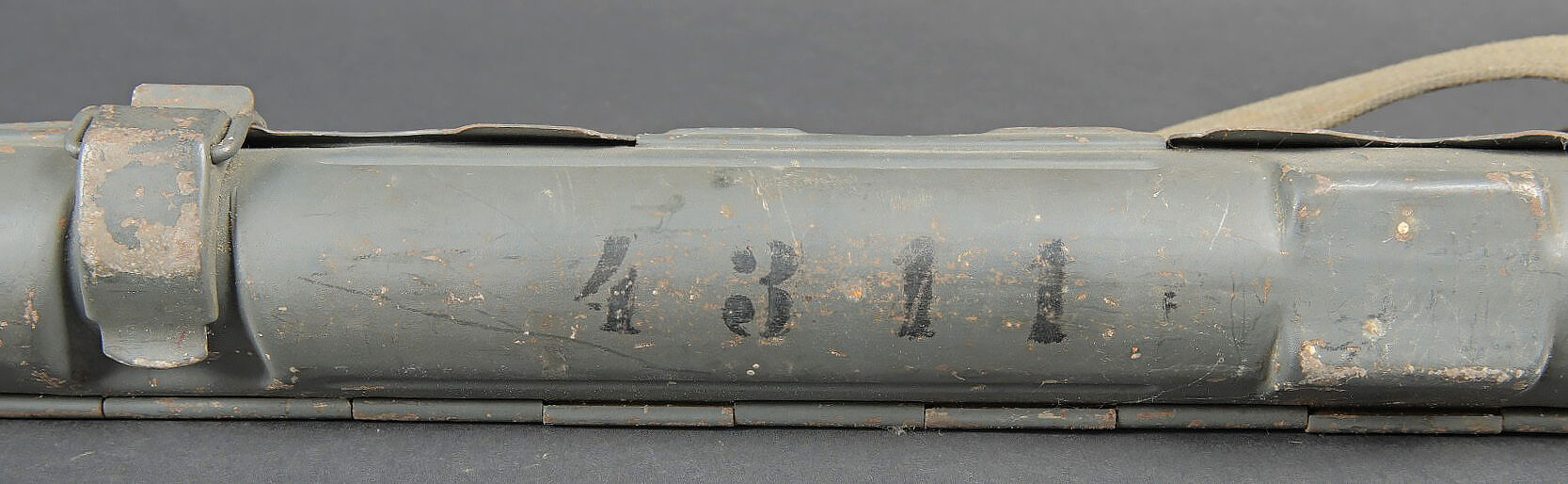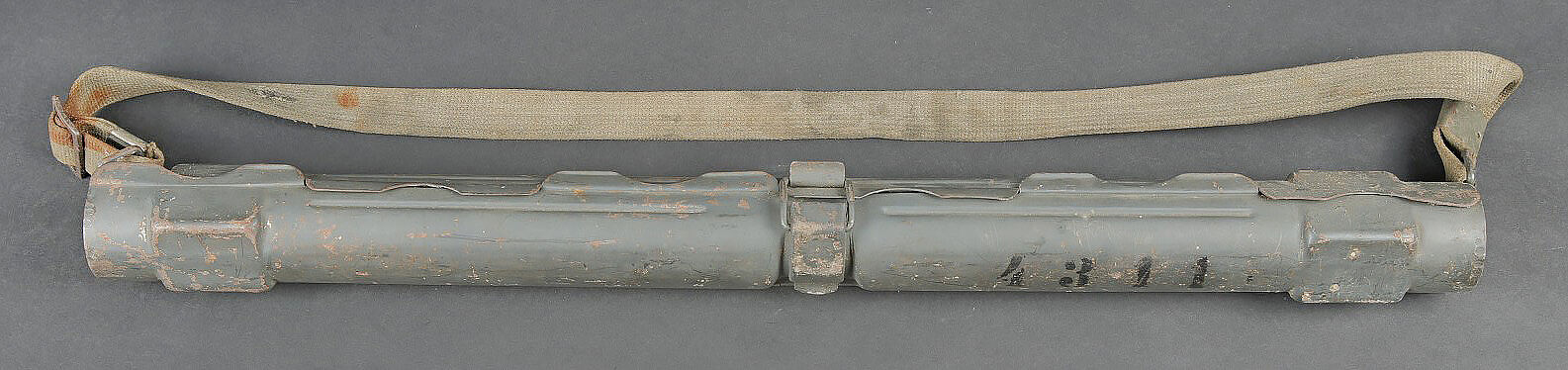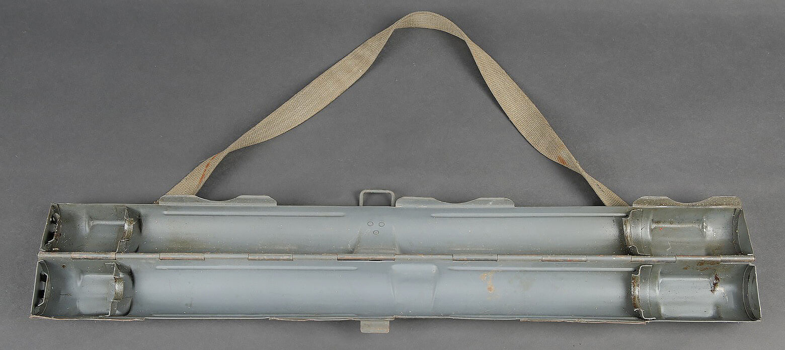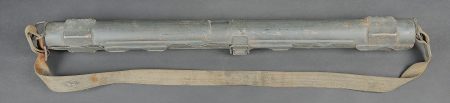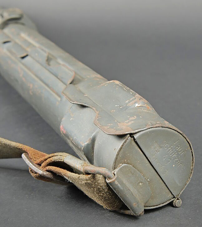 Porte canon de mitrailleuse MG 34/42. En métal, peinture Feldgrau à 70%. Numéro 4311 peint en noir sur le côté du boitier. Le crochet de fermeture est fonctionnel. Fabrication BRC 43. Sangle de transport présente. A noter une certaine usure et patine de la pièce, ainsi que quelques accrocs sur la sangle. Etat II+. MG 34/42 barrel carrier. Metal construction with 70% Feldgrau paint. Black painted number 4311 on the side. Functional closure hook. Maker marked BRC 43. Carrying strap present with minor damage. Showing wear and patina. Condition II+.