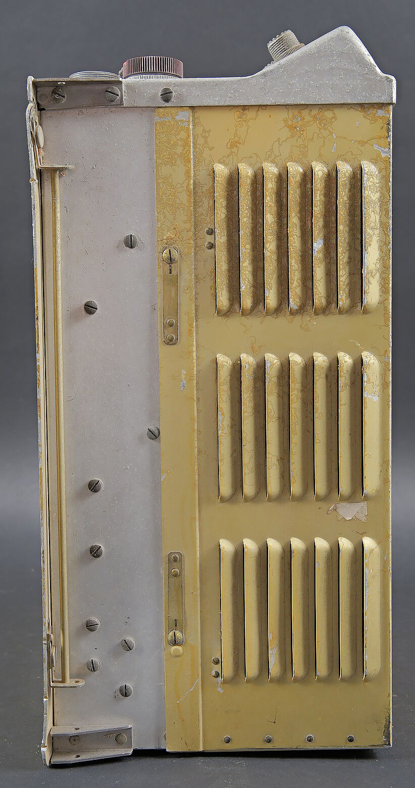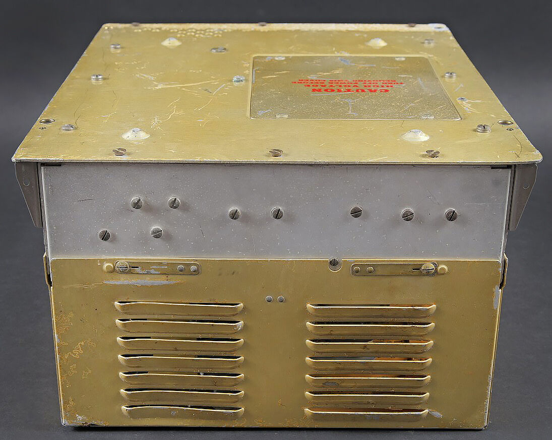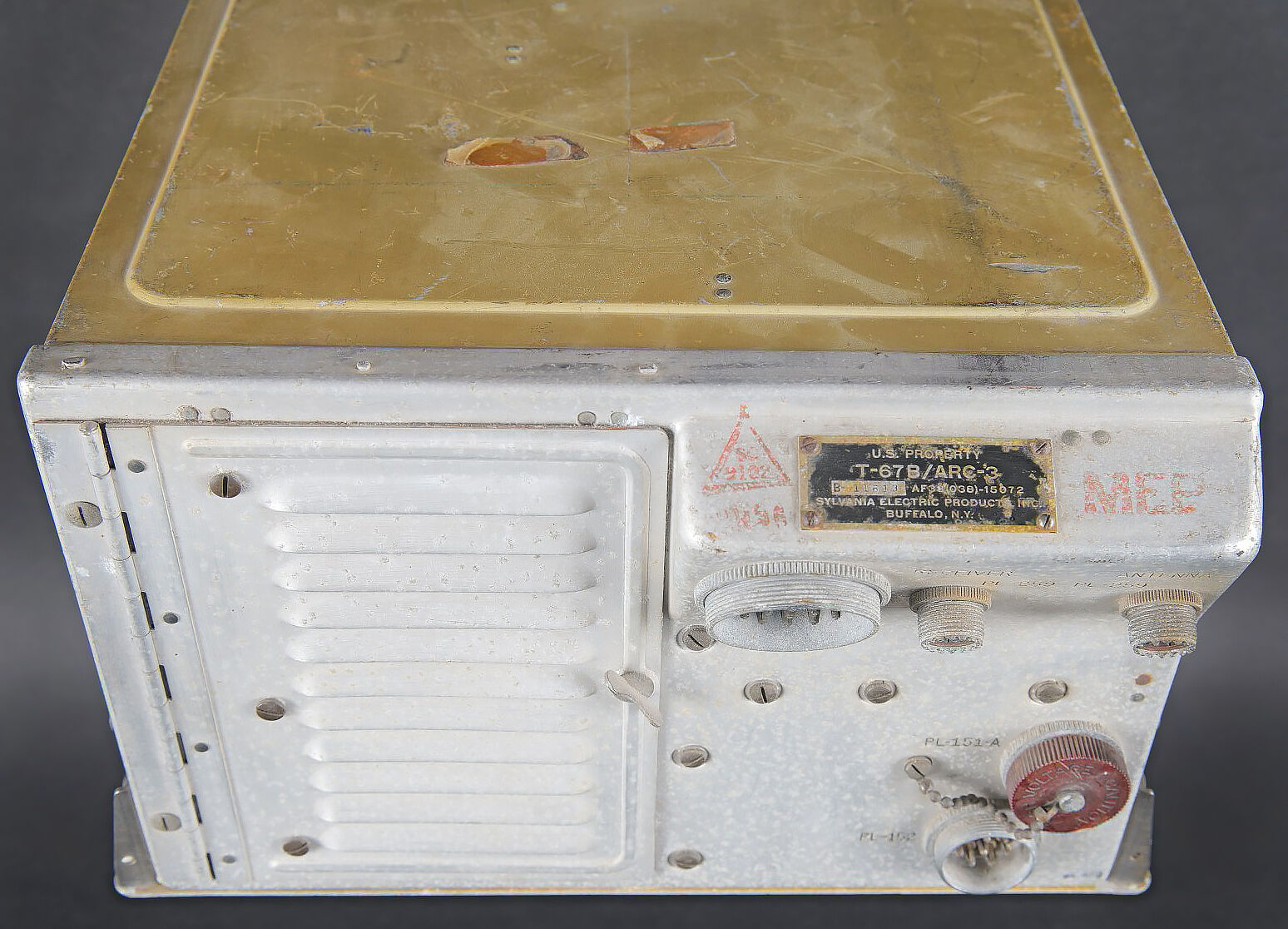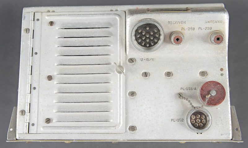 Radio T-67B/ARC-3. Cet émetteur radio d’avion du Corps de signal de l’armée américaine T-67B ARC-3 a été utilisé pendant la Seconde Guerre mondiale et la guerre de Corée.. En aluminium. Plaquette marquée US Property T-67B/ARC-3. Fabrication Sylvania Electric Product Inc Buffal NY. Toutes les pièces mobiles sont fonctionnelles. Numéro de série B-11613. A noter une certaine usure et patine de la pièce. Etat II+. Aircraft transmitter T-67B/ARC-3 Aluminium construction. Plate marked US Property T-67B/ARC-3. Manufactured by Sylvania Electric Products Inc., Buffalo NY. All moving parts functional. Serial number B-11613. Used by the US Army Air Forces during the Second World War and the Korean War. Note some wear and patina to the piece. Condition II+.