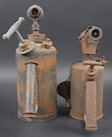 Réchauffes moteur WH. Deux grands modèles de réchauffe moteur. En métal. Les étiquettes d’instructions sont présentes mais partiellement illisibles. Divers état. Les accessoires sont manquants. A noter une certaine usure et patine des pièces. Etat II+. WH engine preheaters. Two large-size preheating units in steel. Instruction labels present but partially illegible. In various conditions. Accessories missing. Showing normal wear and patina. Condition II+.