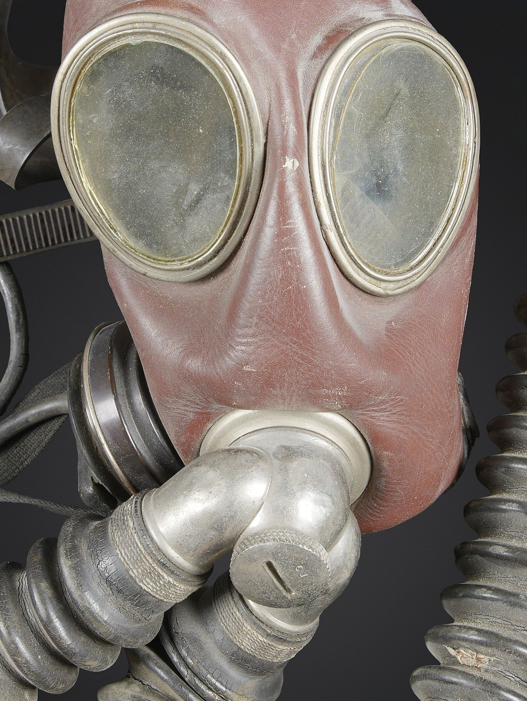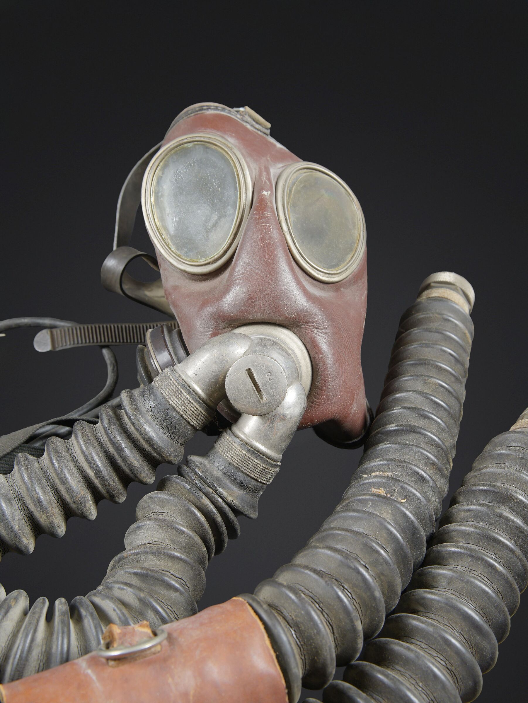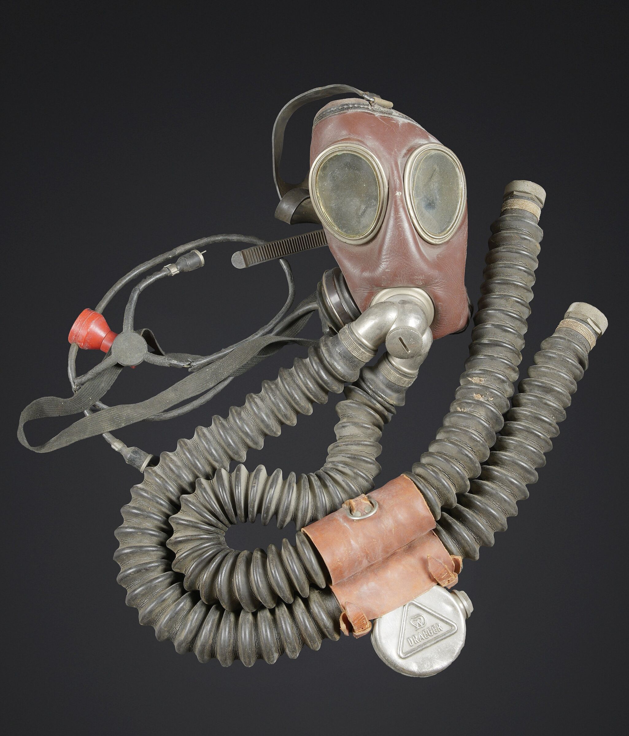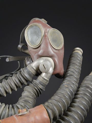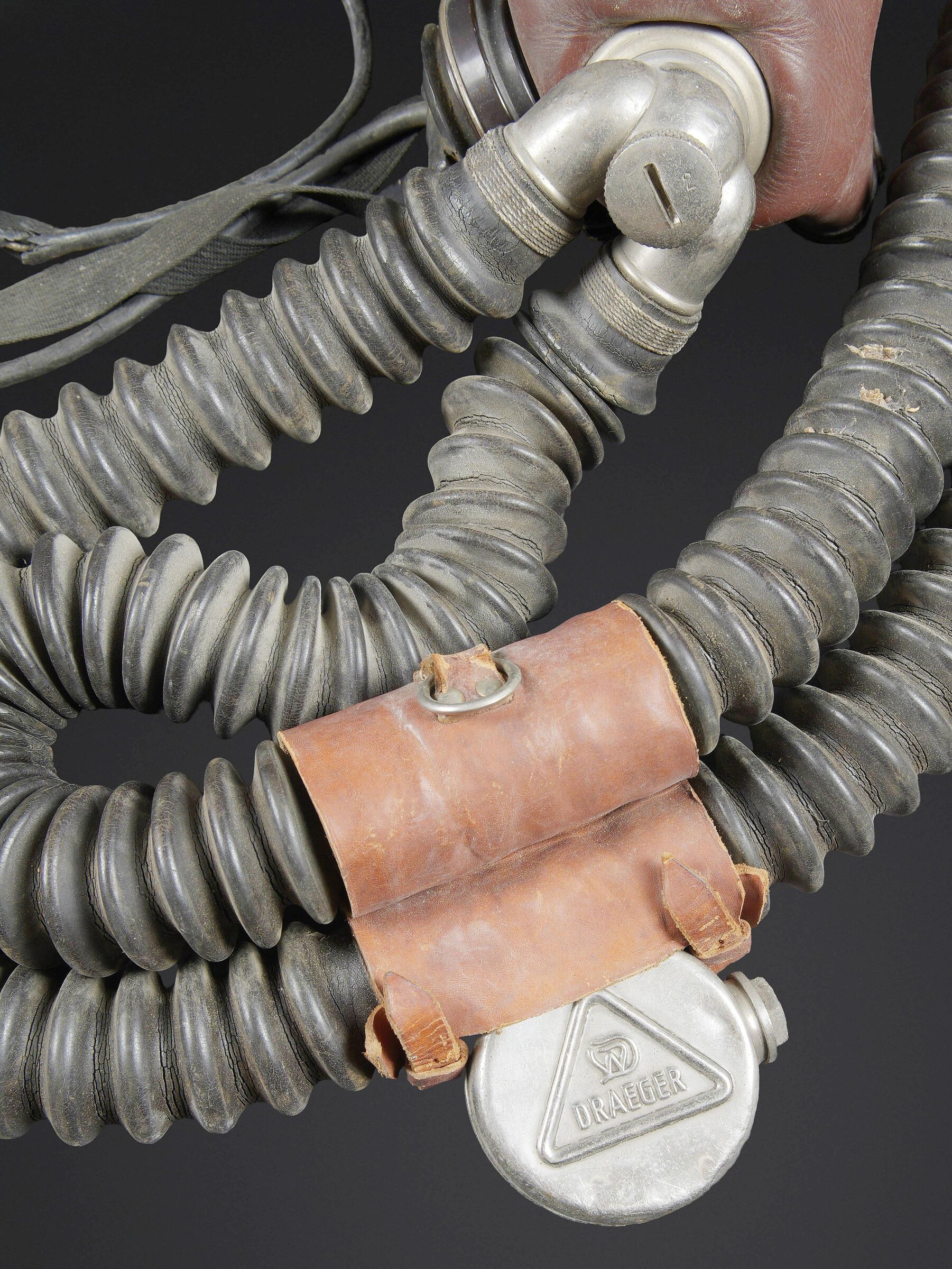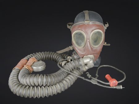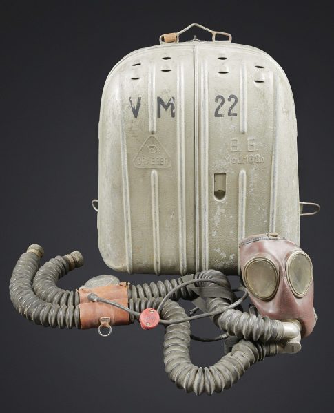Recycleur de plongée de la marine de guerre des forces de l’axe. Caisson dorsal en aluminium, fabrication Draeger BG MOD 160A. Marquages à la peinture noire et au pochoir VM 22. Le caisson s’ouvre et contient au niveau de la partie inférieure une bouteille d’oxygène de couleur bleue, vide, marquée BG160A Fülldruck 150 at. L’emplacement de la seconde bouteille de plongée est vide. La bouteille est manquante. Tous les systèmes d’alimentation en oxygène sont complets. La vessie centrale est très sèche. Au niveau de la partie arrière, le coussin de protection dorsale en toile grise et maintenu par des bretelles en cuir marron. Les bretelles de transport sont manquantes. Le flexible et le manomètre sont présents. Masque de plongée en caoutchouc marron, toutes les sangles sont présentes. Un microphone est fixé sur le côté du masque. Les câbles et les prises étanche sont présents. Les flexibles en caoutchouc sont complet, souples, mais présentant tout de même quelques craquelures. Les prises de fixation au pack dorsales sont présentes. Un câble radio est partiellement dénudé. Deux renforts en cuir sont fixés sur les flexibles de masque, et disposent d’un boitier en métal marqué Draeger. Très rare dispositif de plongé de la KM. A noter une certaine usure et patine de la pièce. Etat II+. Kriegsmarine diving rebreather. Aluminium back pack, maker marked Draeger BG Mod. 160A, black stencilled marking VM 22. Opening case containing in its lower section a blue oxygen cylinder, empty, marked BG160A Fülldruck 150 at. Second cylinder missing. Complete oxygen feed system. Central breathing bag very dry. Rear grey canvas back pad held by brown leather straps, carrying straps missing. Hose and pressure gauge present. Brown rubber diving mask with all straps intact, fitted with a side microphone. Watertight cables and connectors present. Rubber hoses complete and still supple with minor cracking. Mounting fittings for the back pack present. One radio cable partially stripped. Two leather reinforcements fixed to the mask hoses with metal Draeger junction boxes. Very rare KM diving apparatus. Showing wear and patina. Condition II+.