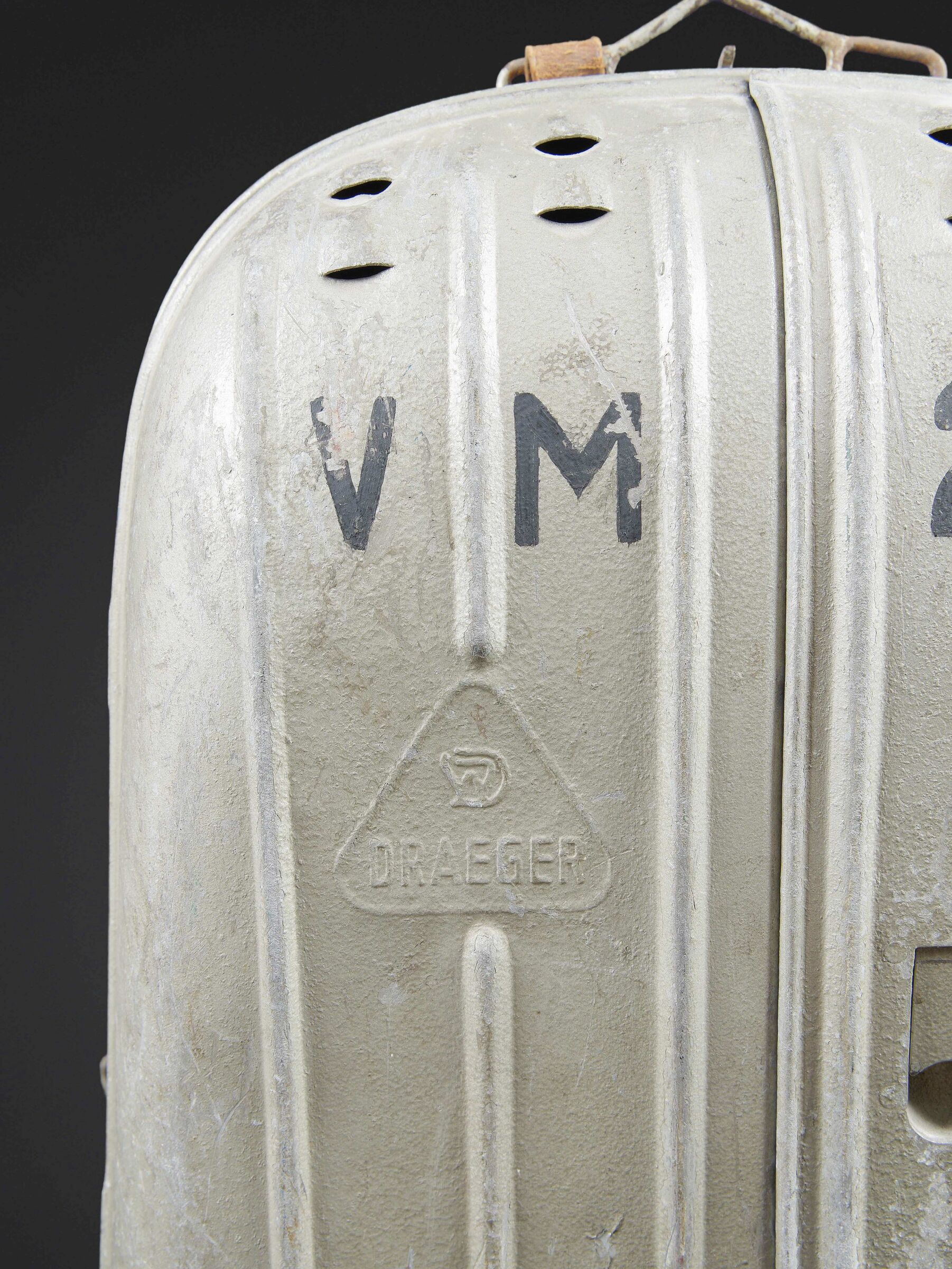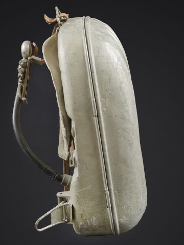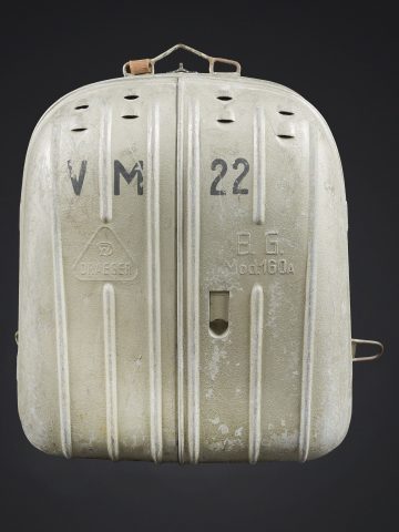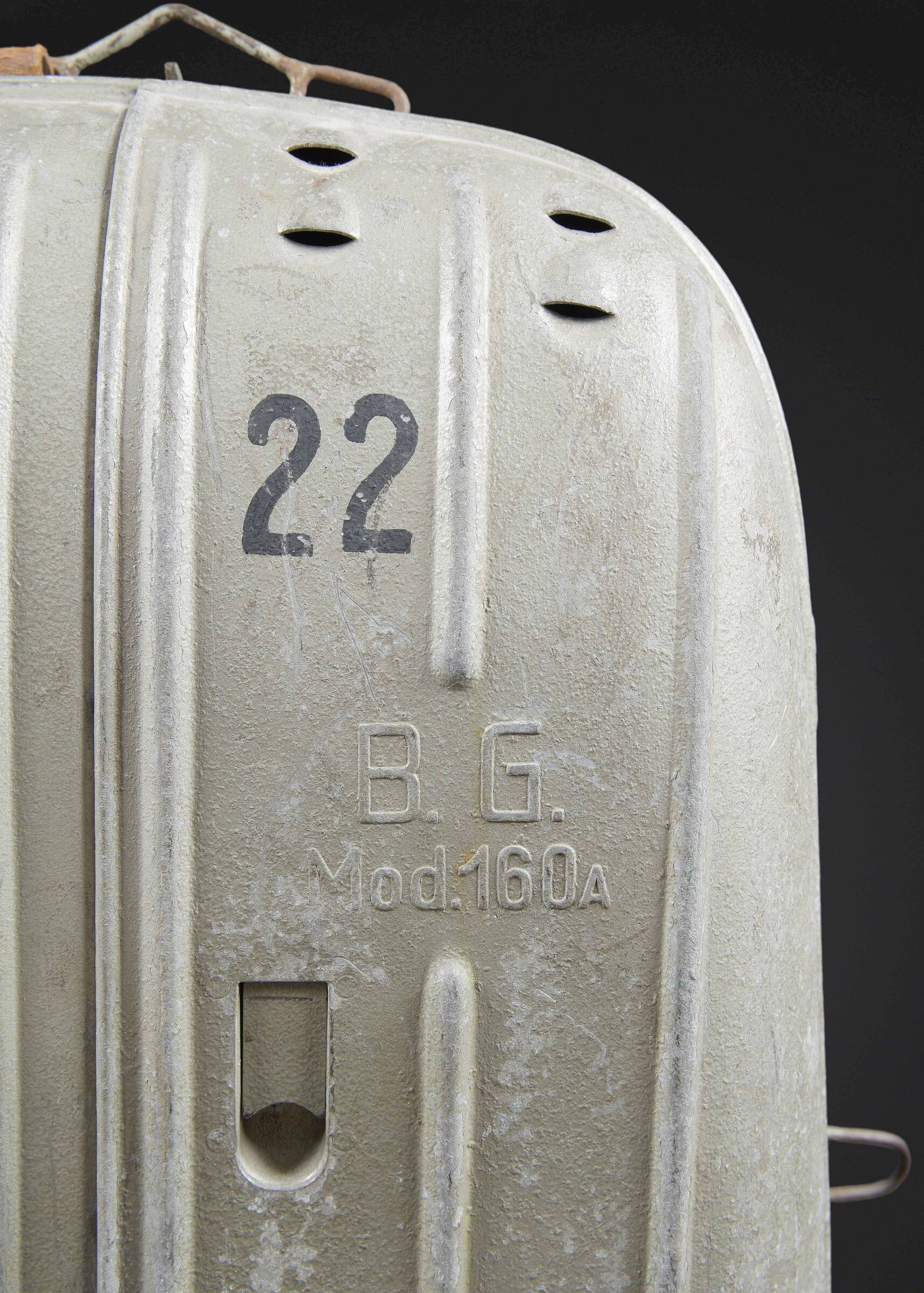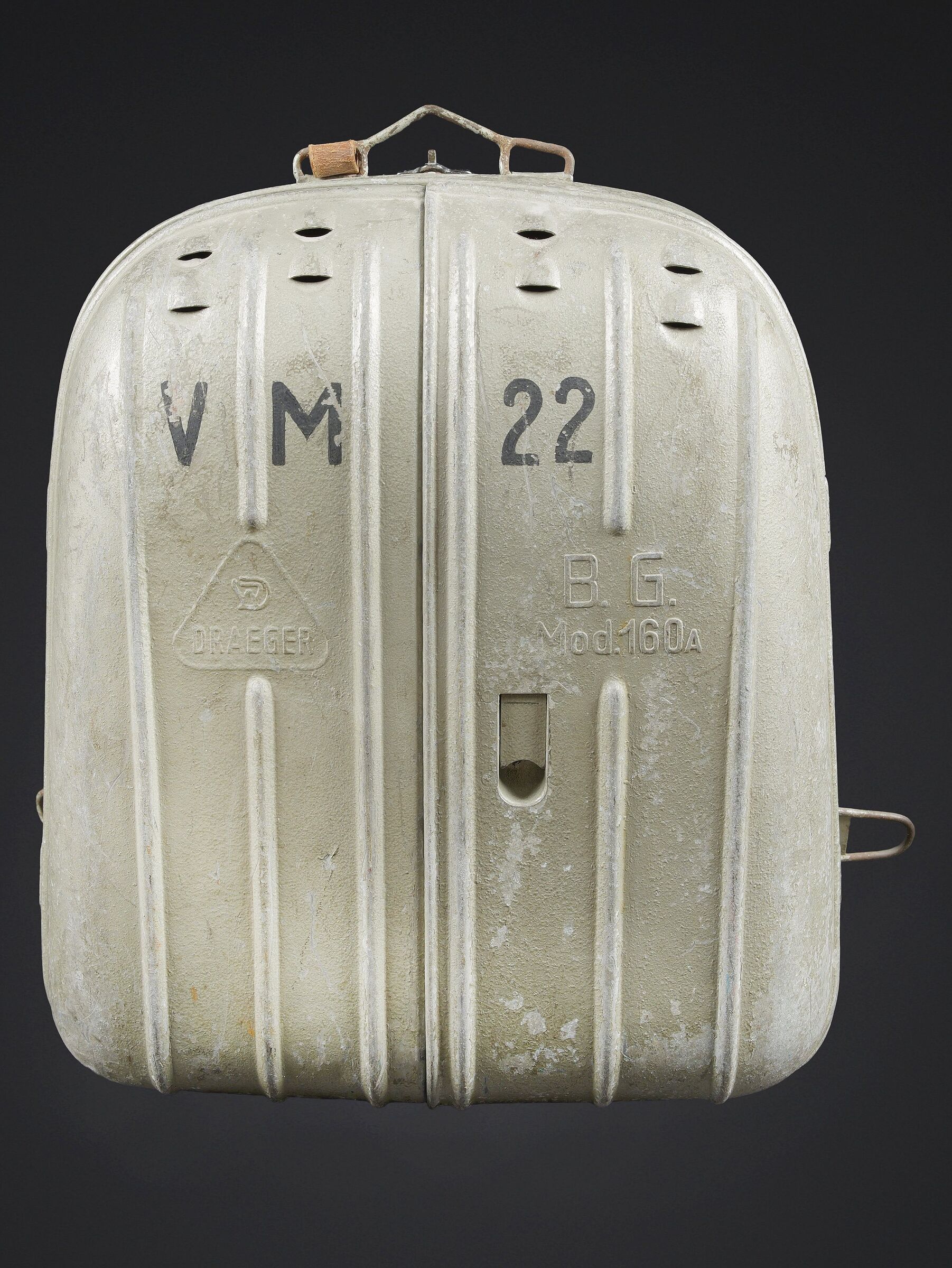 Recycleur de plongée de la marine de guerre des forces de l’axe. Caisson dorsal en aluminium, fabrication Draeger BG MOD 160A. Marquages à la peinture noire et au pochoir VM 22. Le caisson... en savoir plus