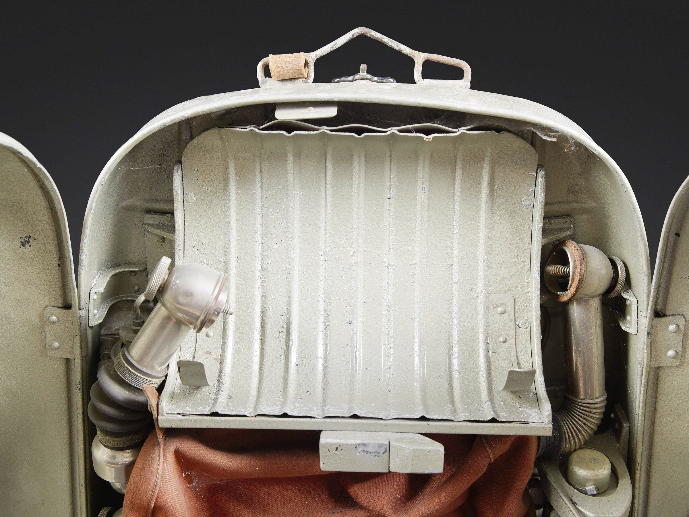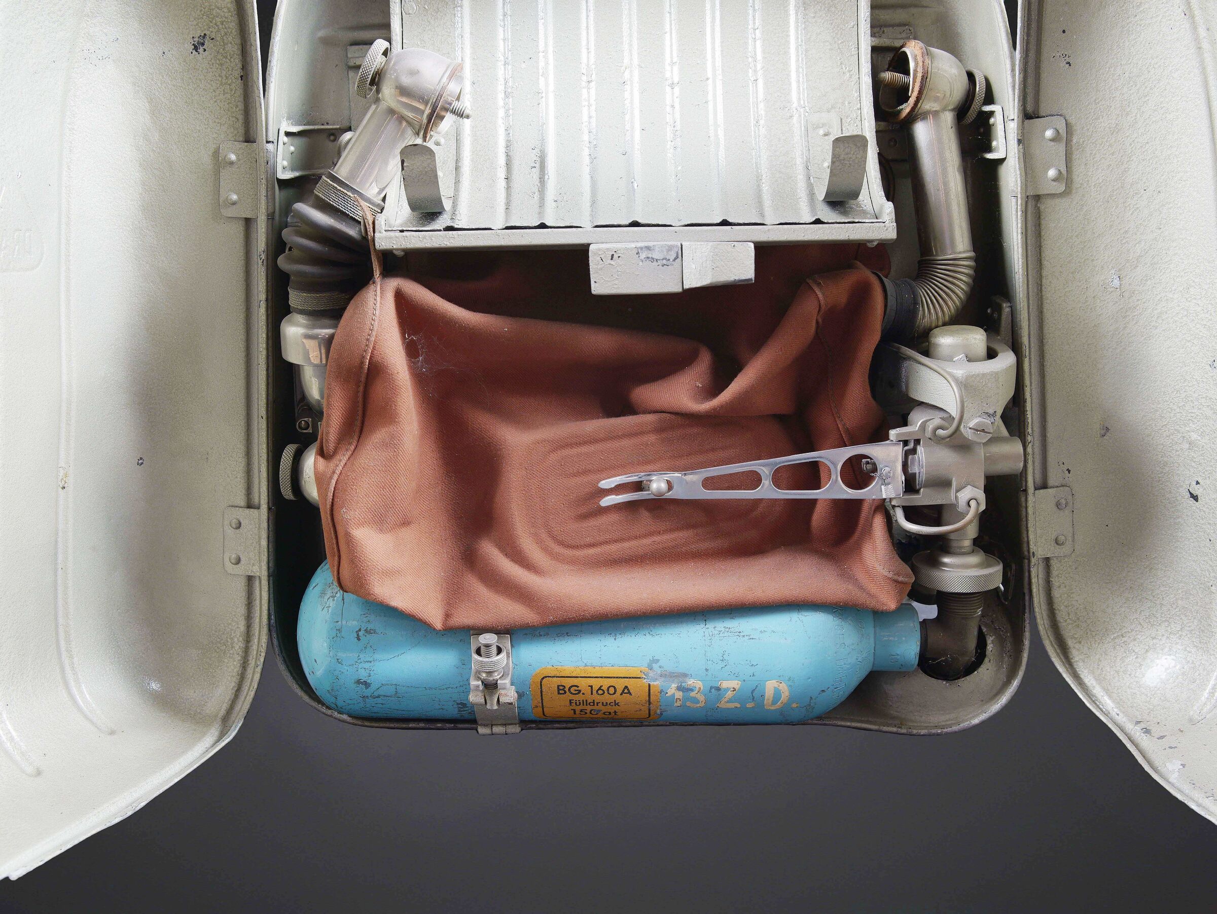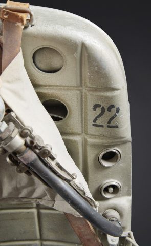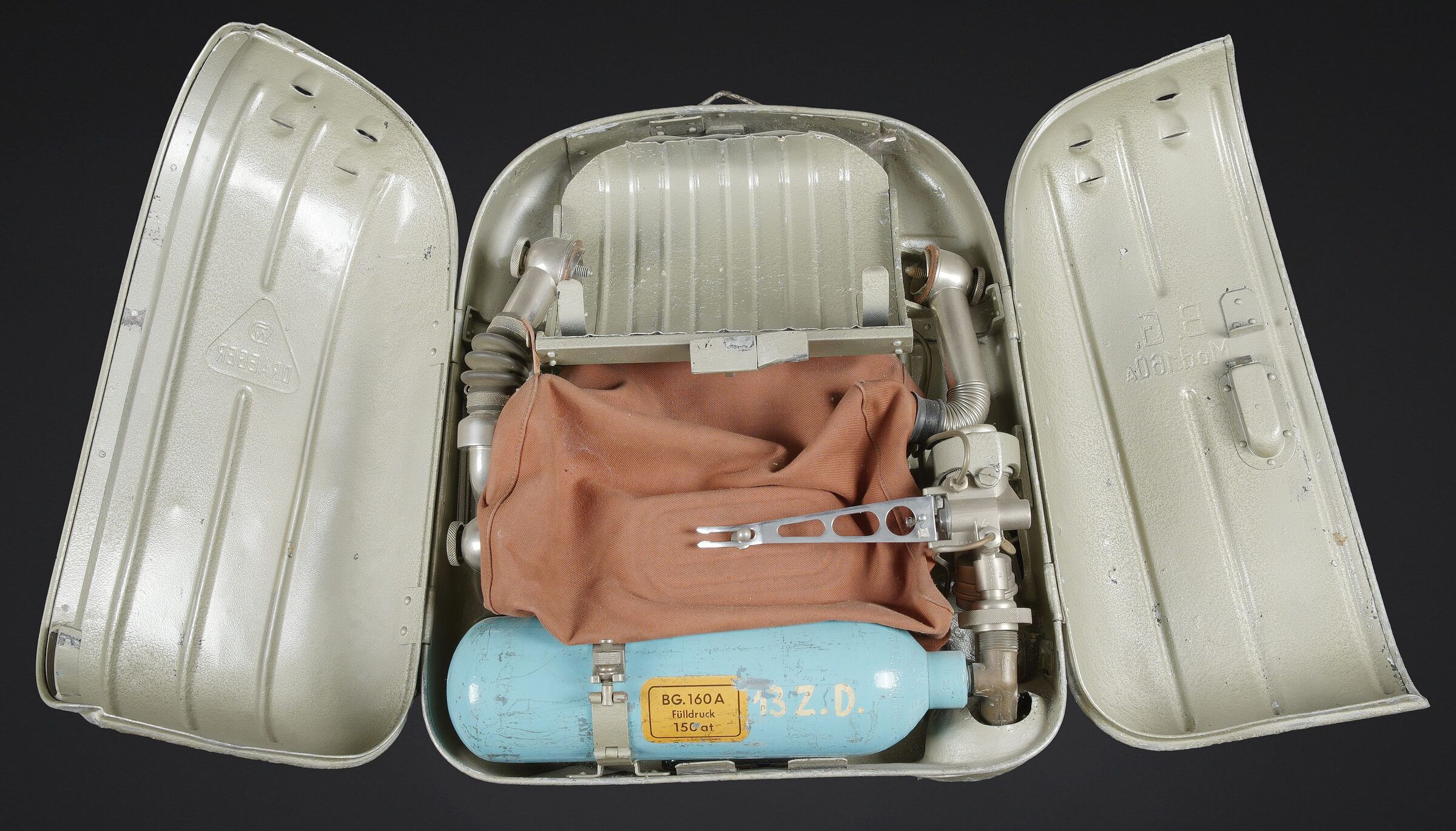 Recycleur de plongée de la marine de guerre des forces de l’axe. Caisson dorsal en aluminium, fabrication Draeger BG MOD 160A. Marquages à la peinture noire et au pochoir VM 22. Le caisson... en savoir plus