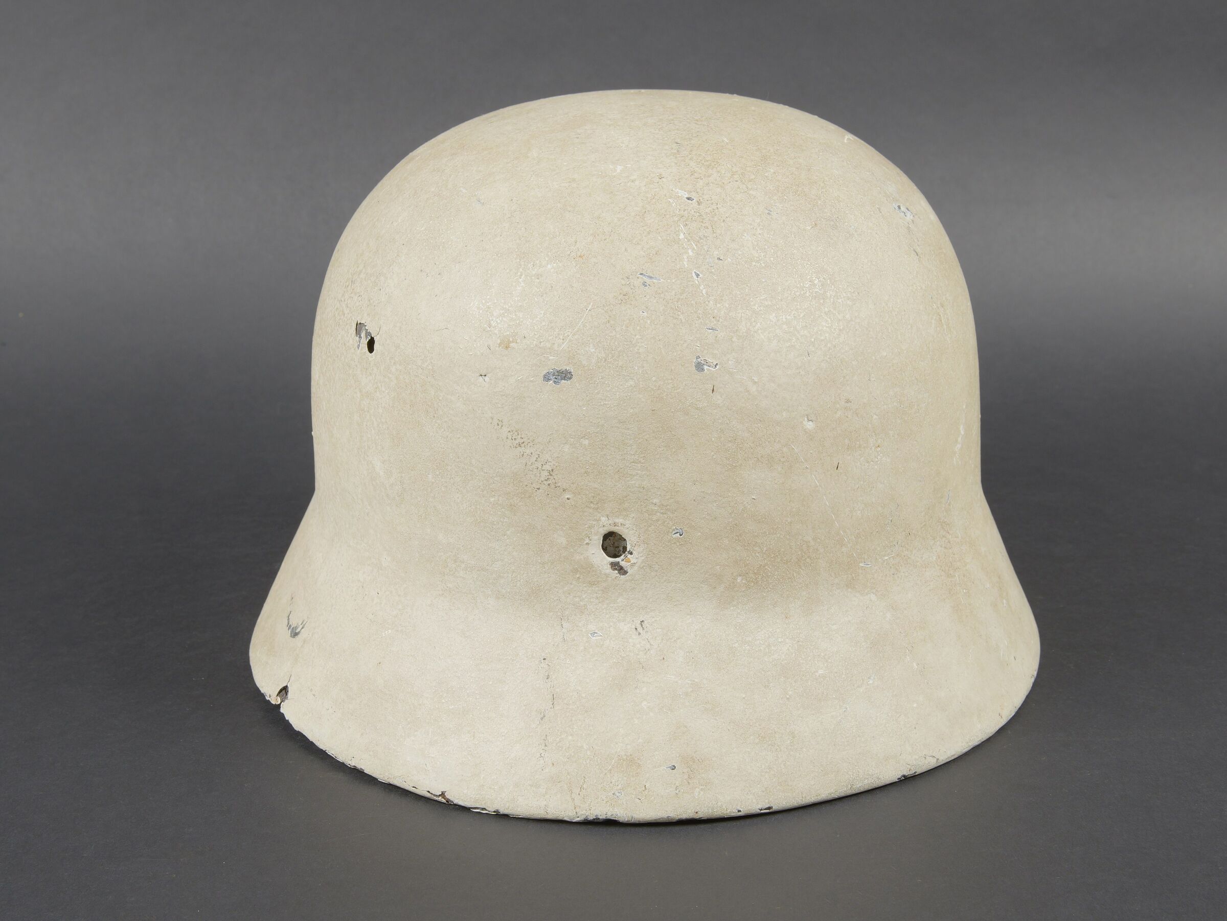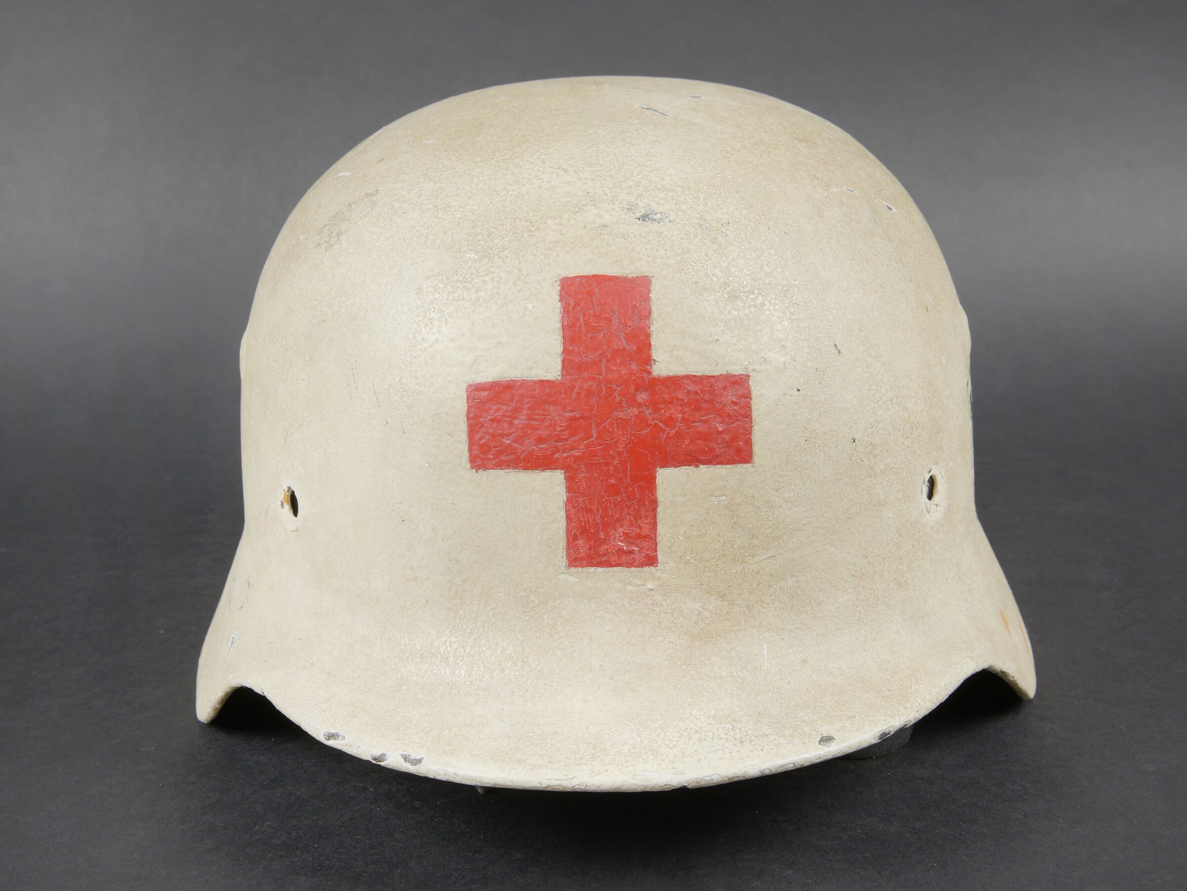 Reproduction d’un casque d’infirmier WH. Coque de casque complètement mastiquée et repeinte. Les insignes et l’intérieur sont des reproductions. A noter une certaine usure et patine de la pièce. Etat II. Reproduction WH medical orderly helmet. Helmet shell fully filled and repainted. Insignia and liner are reproductions. Showing wear and patina. Condition II.