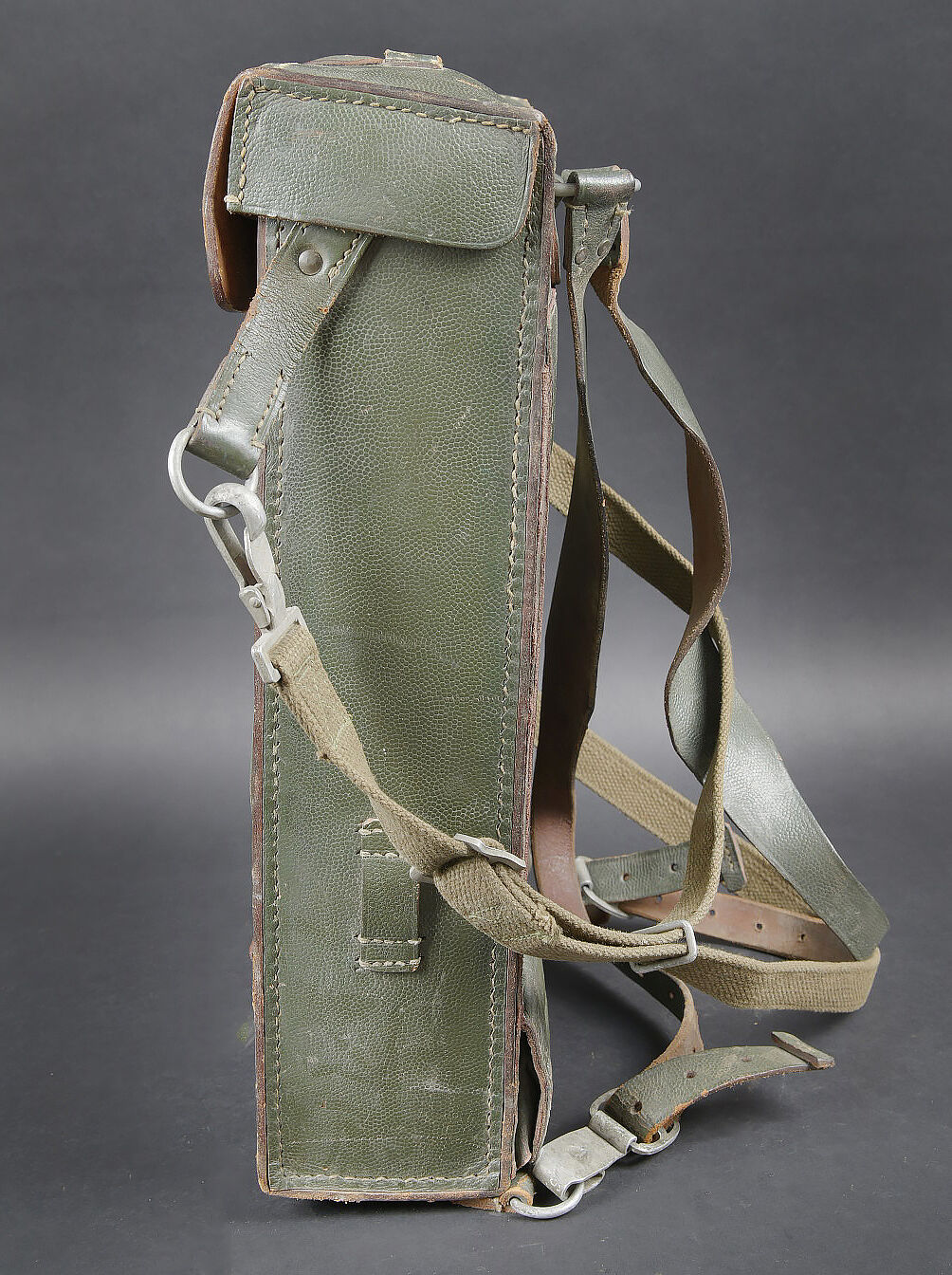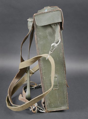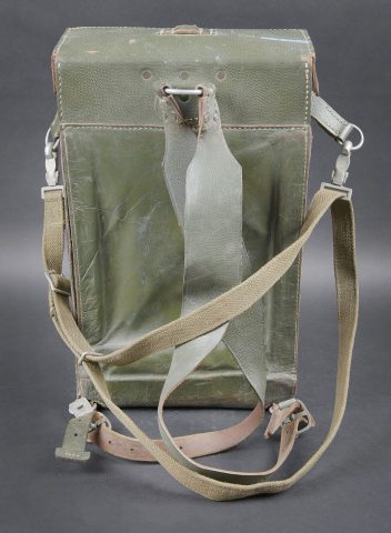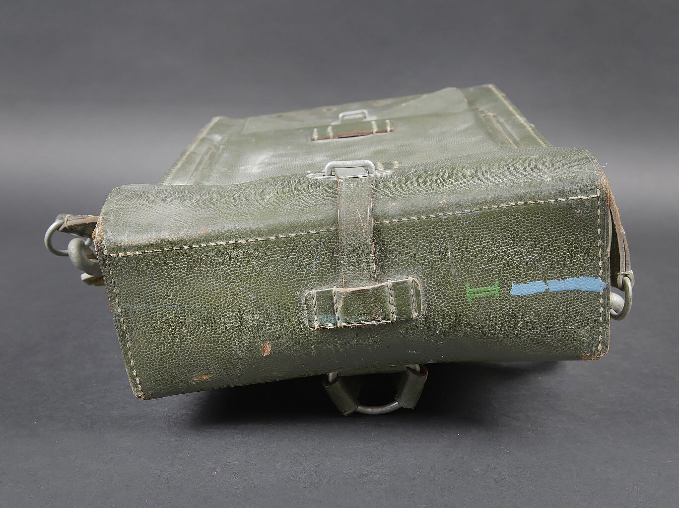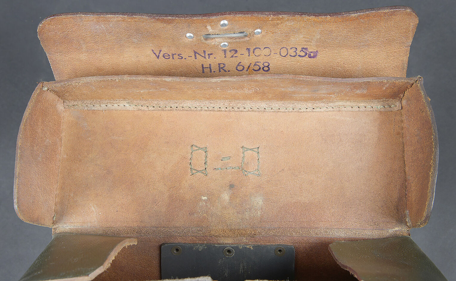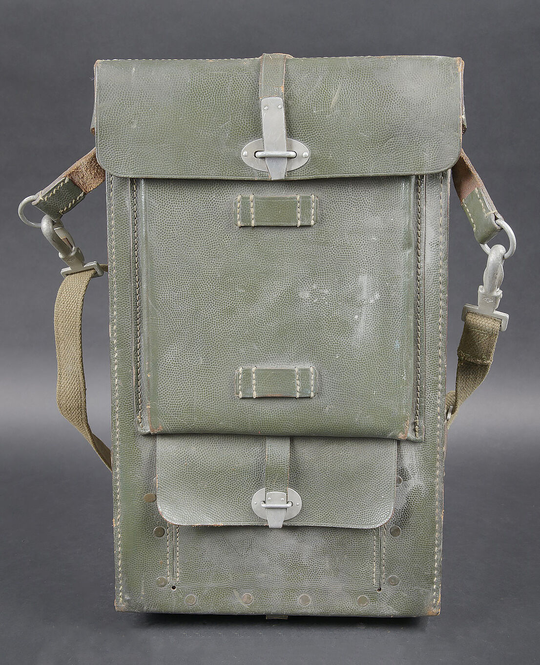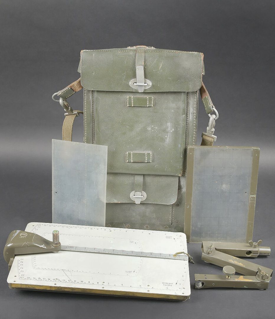 Sacoche d’artilleur. En épais cuir vert. La majorité des sangles sont présentes. Les bretelles en cuir sont complètes. Marquage II à la peinture verte sur le rabat. Marquages sous le rabat Vers Nr 12-100-035 a HR 6/58. Modèle de sacoche datée du mois de juin 1958. Plaquette en mica complète, sur son support en métal. Une seconde plaquette en mica est présente. Table de calcul d’artillerie en aluminium, peinture kaki à 70%. Toutes les pièces mobiles sont fonctionnelles. Fabrication Lumo Print 1957. Texte en allemand. A noter une certaine usure et patine de la pièce. Etat II+. Gunner’s satchel. Heavy green leather construction with most straps present and complete shoulder braces. Green painted II on the flap. Under-flap markings Vers Nr 12-100-035 a HR 6/58, dated June 1958. Complete mica plotting board on metal support with a second spare plate. Aluminium artillery firing calculator with 70% khaki paint, fully functional, maker Lumo Print 1957, German text. Showing wear and patina. Condition II+.
