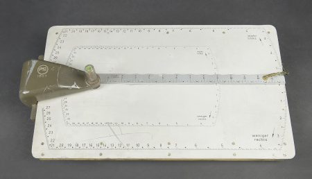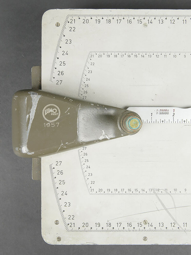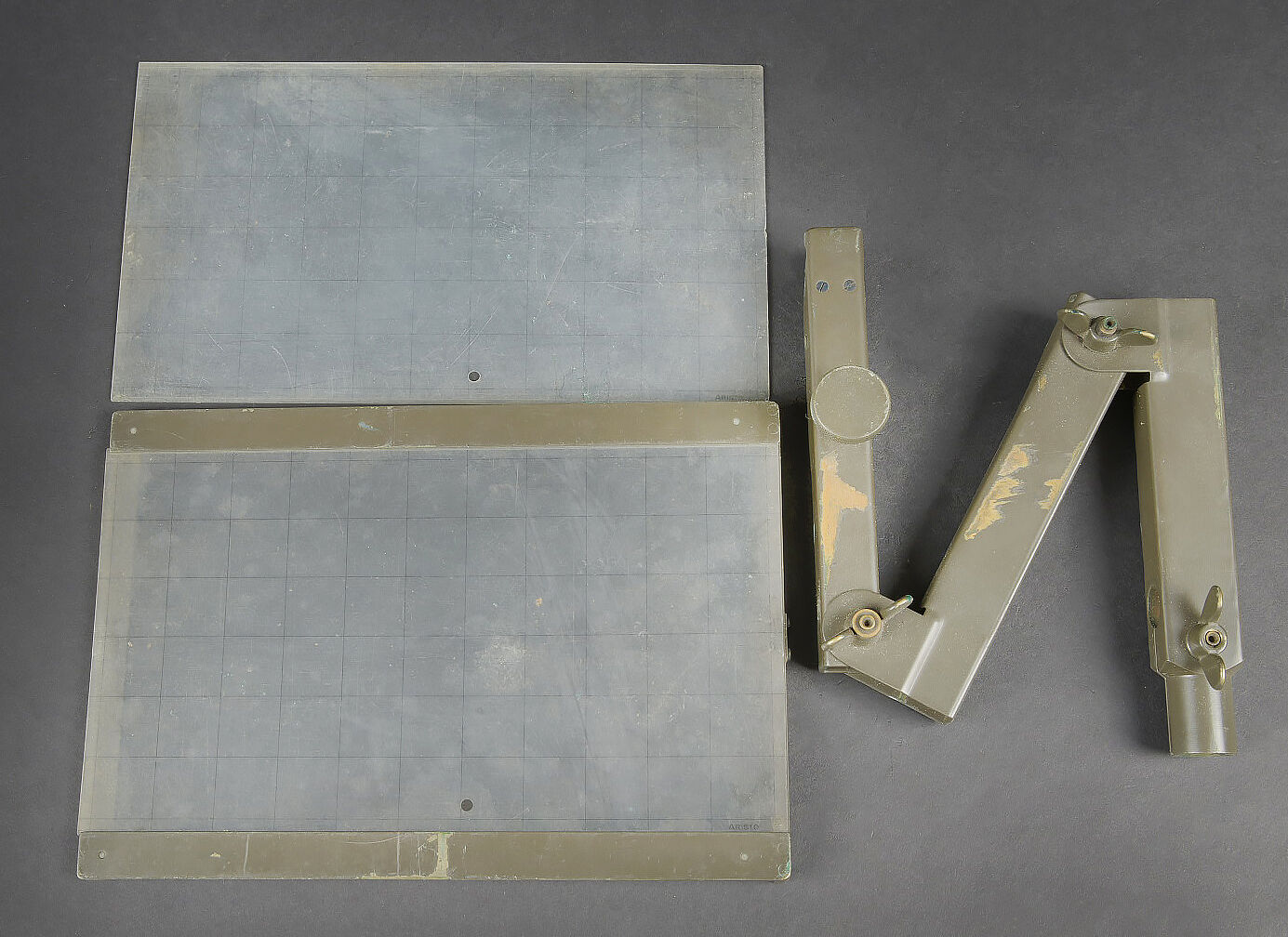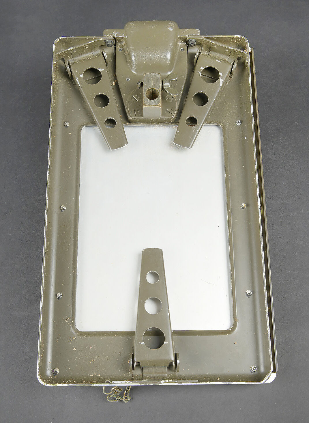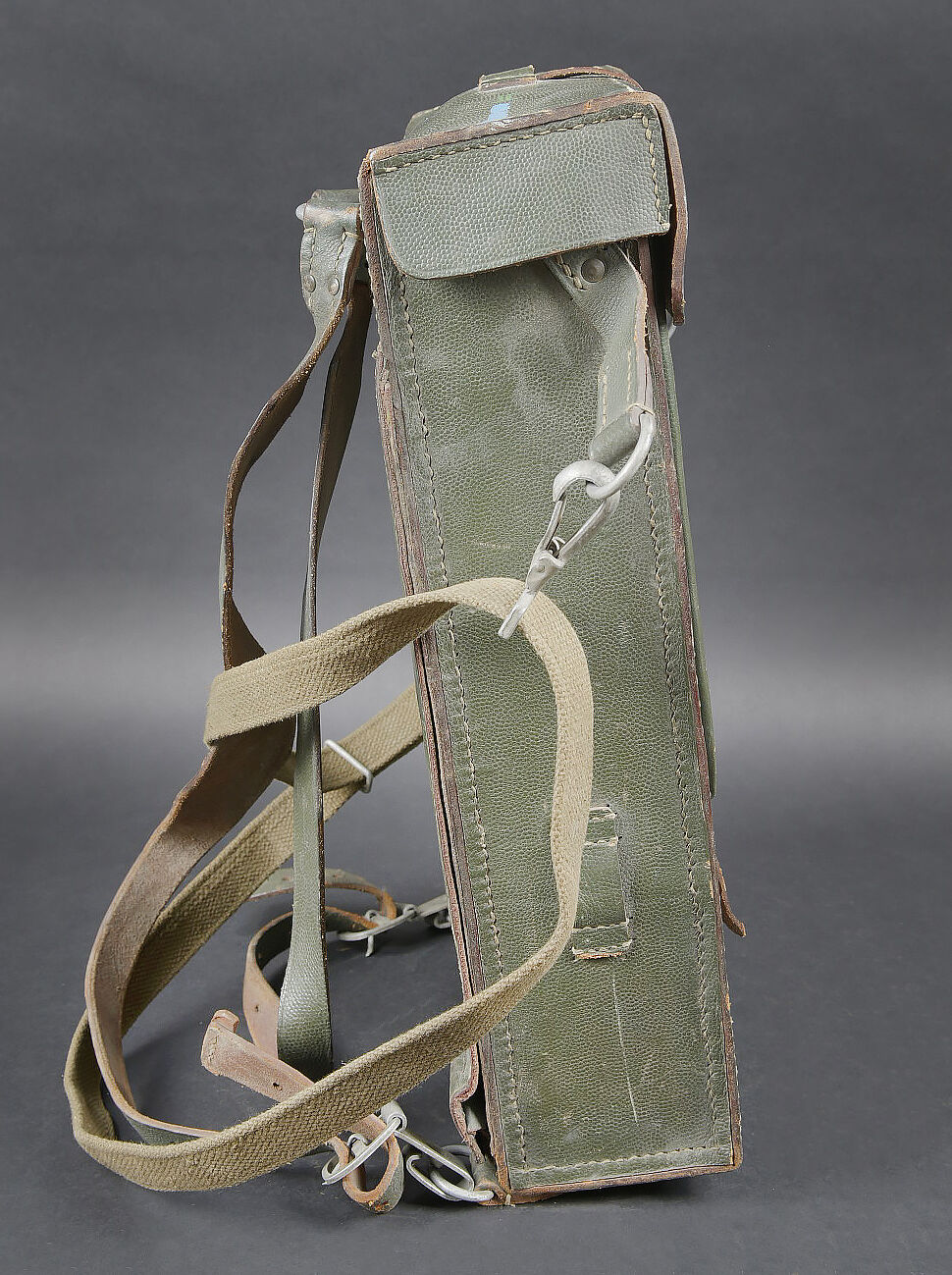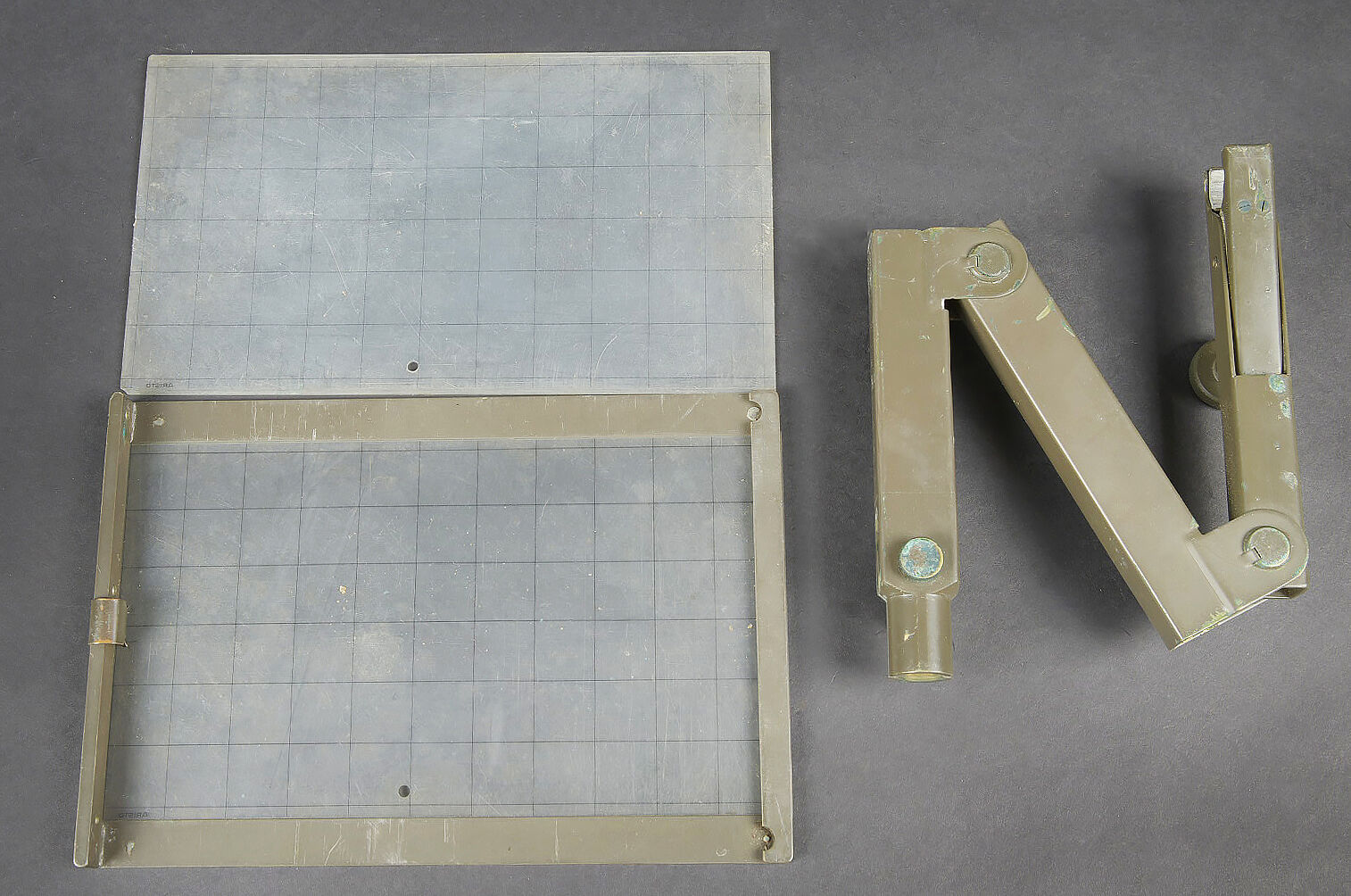 Sacoche d’artilleur. En épais cuir vert. La majorité des sangles sont présentes. Les bretelles en cuir sont complètes. Marquage II à la peinture verte sur le rabat. Marquages sous le rabat Vers Nr 12-100-035 a HR 6/58. Modèle de sacoche datée du mois de juin 1958. Plaquette en mica complète, sur son support en métal. Une seconde plaquette en mica est présente. Table de calcul d’artillerie en aluminium, peinture kaki à 70%. Toutes les pièces mobiles sont fonctionnelles. Fabrication Lumo Print 1957. Texte en allemand. A noter une certaine usure et patine de la pièce. Etat II+. Gunner’s satchel. Heavy green leather construction with most straps present and complete shoulder braces. Green painted II on the flap. Under-flap markings Vers Nr 12-100-035 a HR 6/58, dated June 1958. Complete mica plotting board on metal support with a second spare plate. Aluminium artillery firing calculator with 70% khaki paint, fully functional, maker Lumo Print 1957, German text. Showing wear and patina. Condition II+.