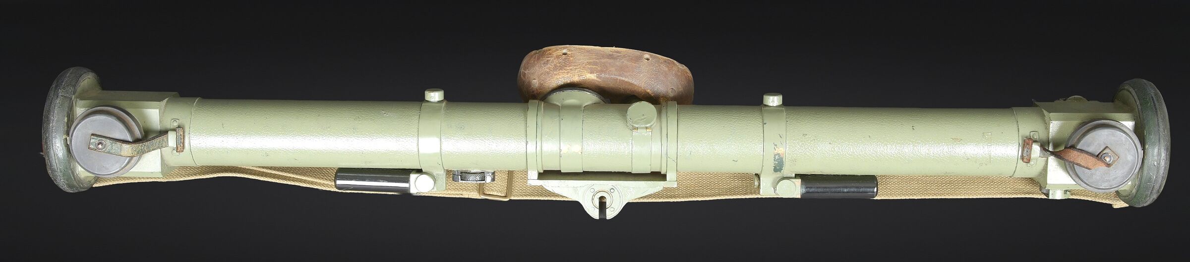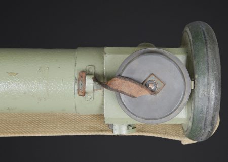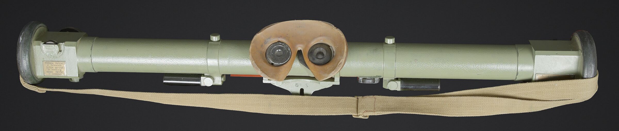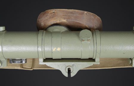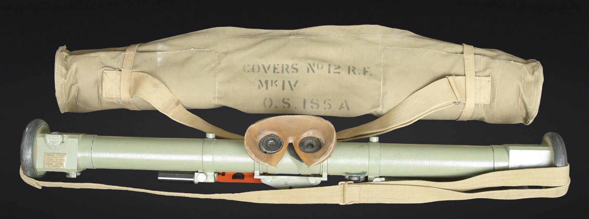 Télémètre britannique export. En métal. Complètement repeint. Les bonnettes en bakélite sont présentes, ainsi que la sangle de transport. Protège front en caoutchouc marron présentant quelques marques d’usures. Les poignées en bakélites sont complètes et mobiles. Les protèges optique en caoutchouc sont présentes. Plaquette en laiton marquée French 1932, Dutch 1935, Indian 1944 export. Housse en épaisse toile kaki. Nombreux renforts matelassés à l ‘intérieur de la housse. Marquages M&Co 1944 avec broad arrow. Marquages Covers N12 RF MK IV OS 185A. La sangle de transport est présente. Les optiques sont très abîmées. A noter une certaine usure et patine de la pièce. Etat II+. British export rangefinder. Metal body, completely repainted. The bakelite end caps are present, as is the carrying strap. Brown rubber forehead rest showing some wear. The bakelite handles are complete and movable. Rubber optical protectors are present. Brass plate marked French 1932, Dutch 1935, Indian 1944 Export. Cover in heavy khaki canvas with numerous padded reinforcements to the interior. Marked M&Co 1944 with Broad Arrow and Covers N°12 RF Mk IV OS 185A. The carrying strap is present. The optics are heavily damaged. Noteworthy overall wear and an attractive period patina. Condition II+.