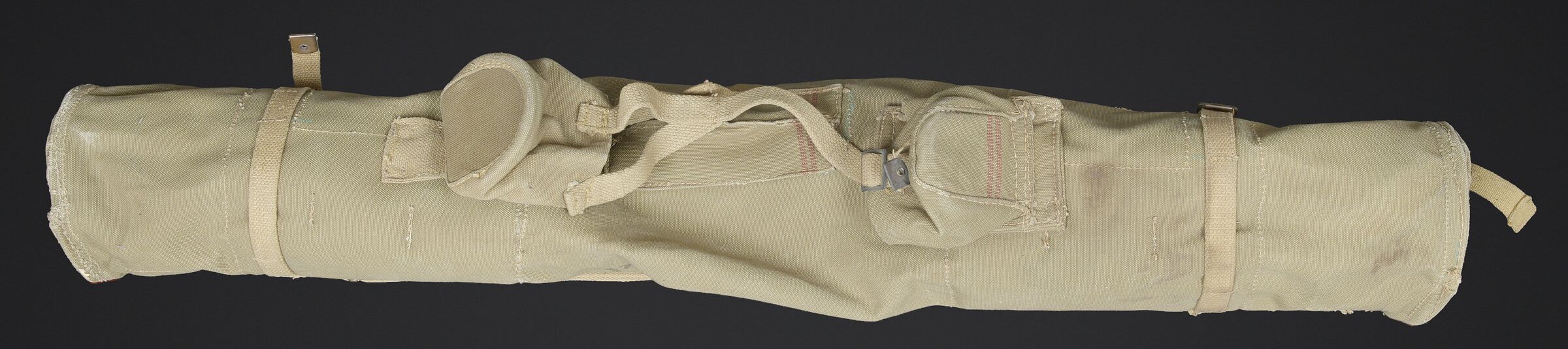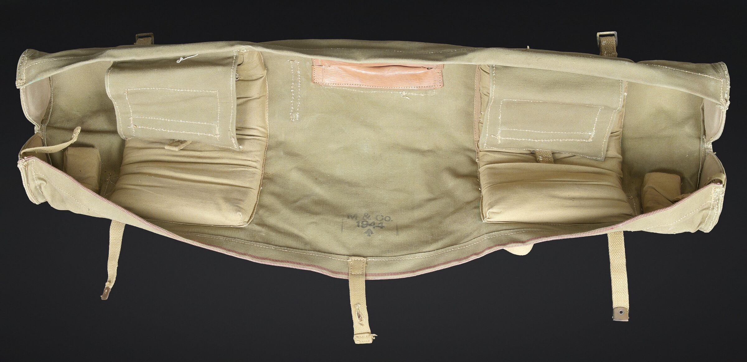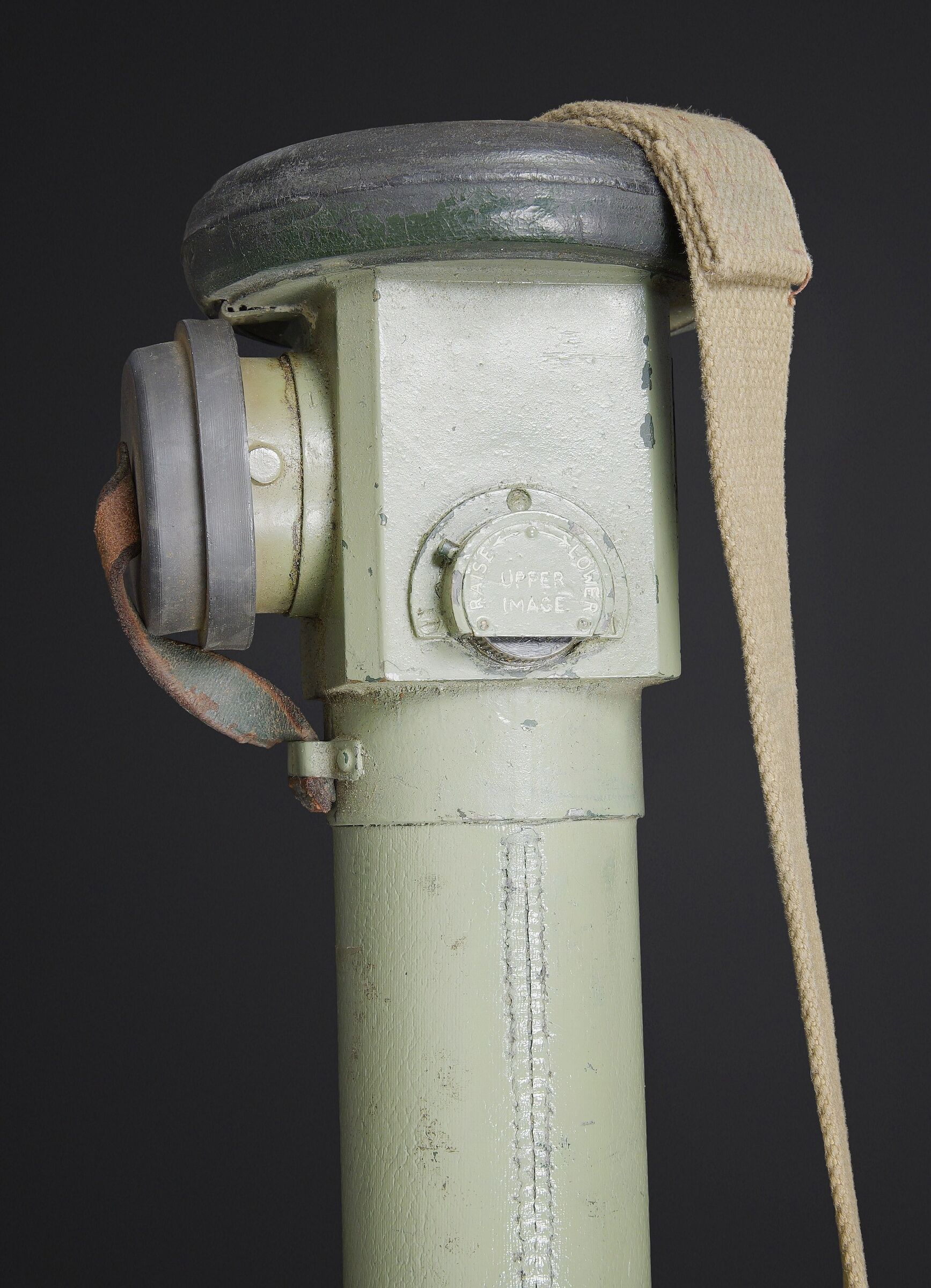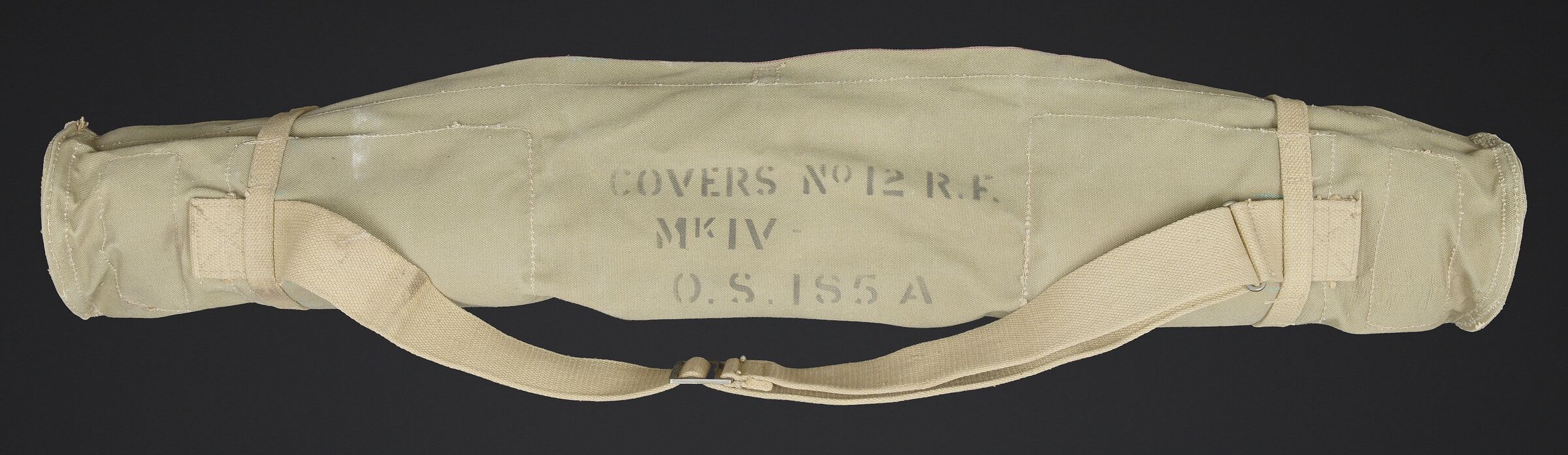 Télémètre britannique export. En métal. Complètement repeint. Les bonnettes en bakélite sont présentes, ainsi que la sangle de transport. Protège front en caoutchouc marron présentant quelques marques d’usures. Les poignées en bakélites sont complètes et mobiles. Les protèges optique en caoutchouc sont présentes. Plaquette en laiton marquée French 1932, Dutch 1935, Indian 1944 export. Housse en épaisse toile kaki. Nombreux renforts matelassés à l ‘intérieur de la housse. Marquages M&Co 1944 avec broad arrow. Marquages Covers N12 RF MK IV OS 185A. La sangle de transport est présente. Les optiques sont très abîmées. A noter une certaine usure et patine de la pièce. Etat II+. British export rangefinder. Metal body, completely repainted. The bakelite end caps are present, as is the carrying strap. Brown rubber forehead rest showing some wear. The bakelite handles are complete and movable. Rubber optical protectors are present. Brass plate marked French 1932, Dutch 1935, Indian 1944 Export. Cover in heavy khaki canvas with numerous padded reinforcements to the interior. Marked M&Co 1944 with Broad Arrow and Covers N°12 RF Mk IV OS 185A. The carrying strap is present. The optics are heavily damaged. Noteworthy overall wear and an attractive period patina. Condition II+.