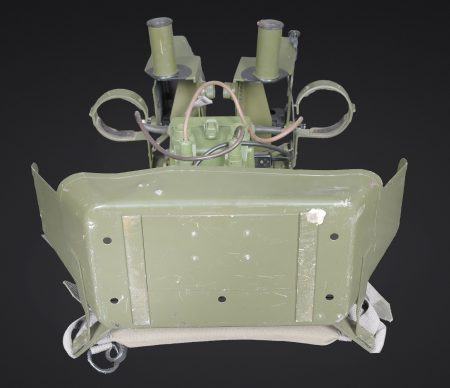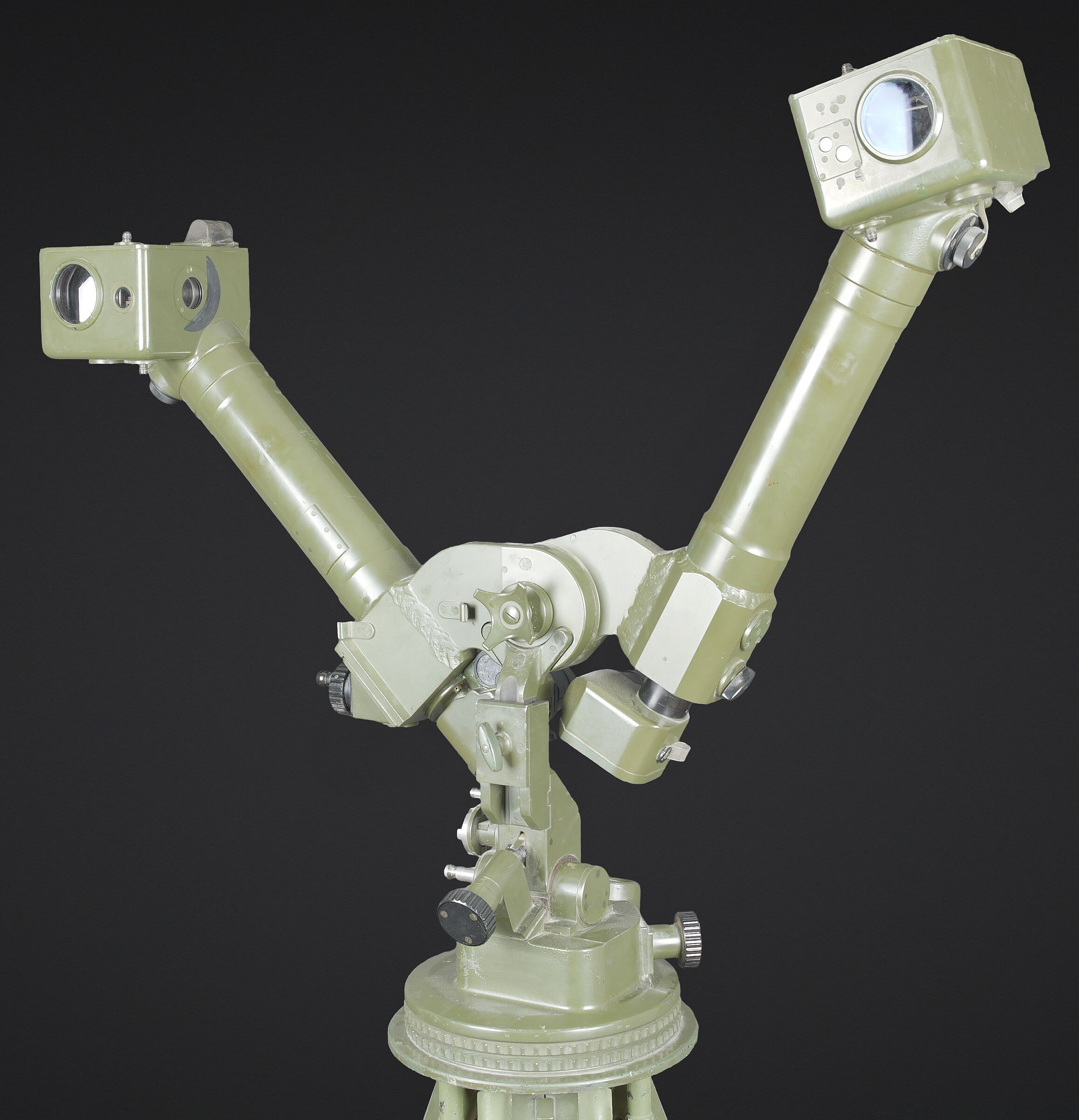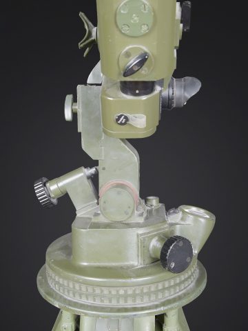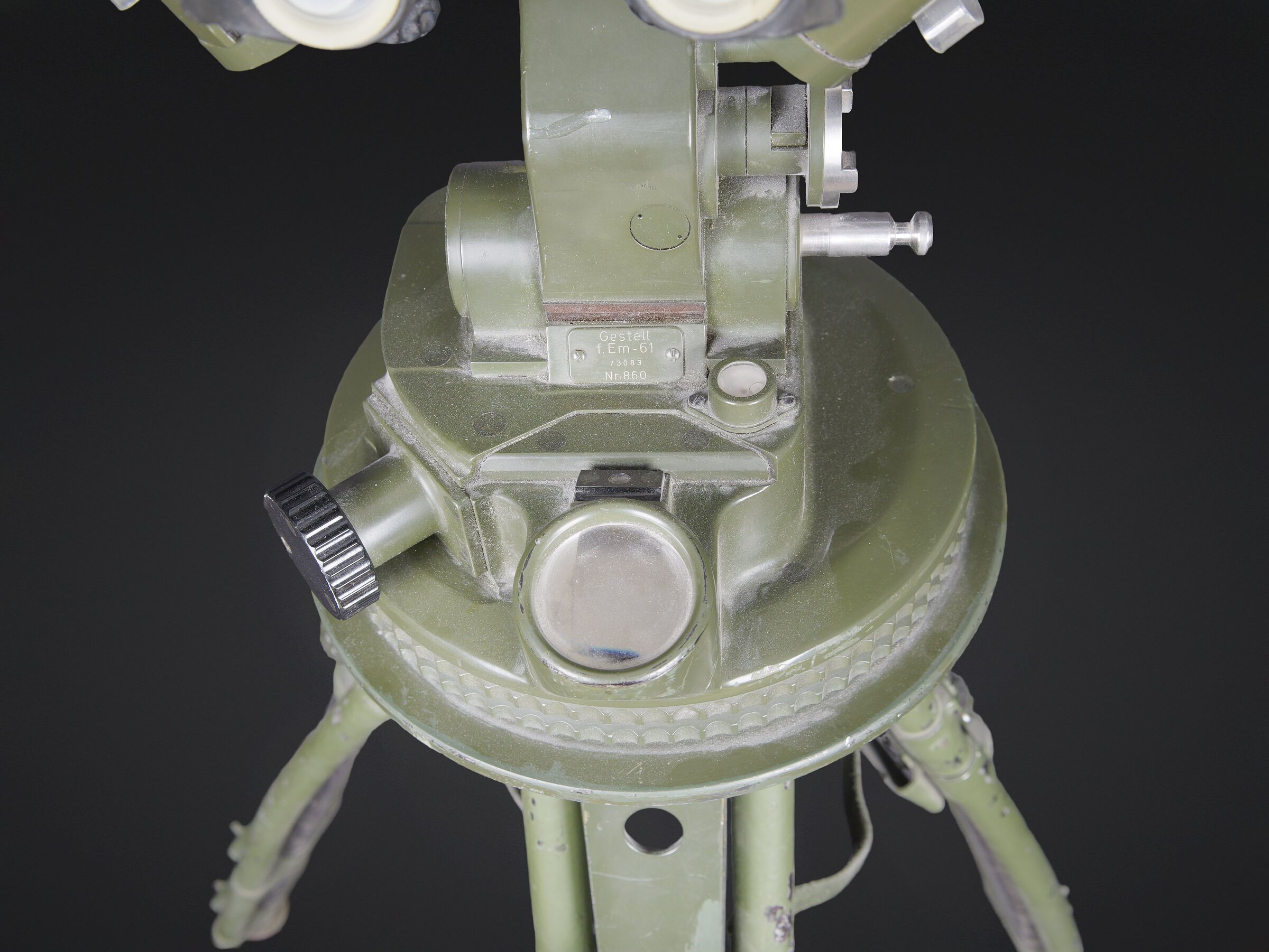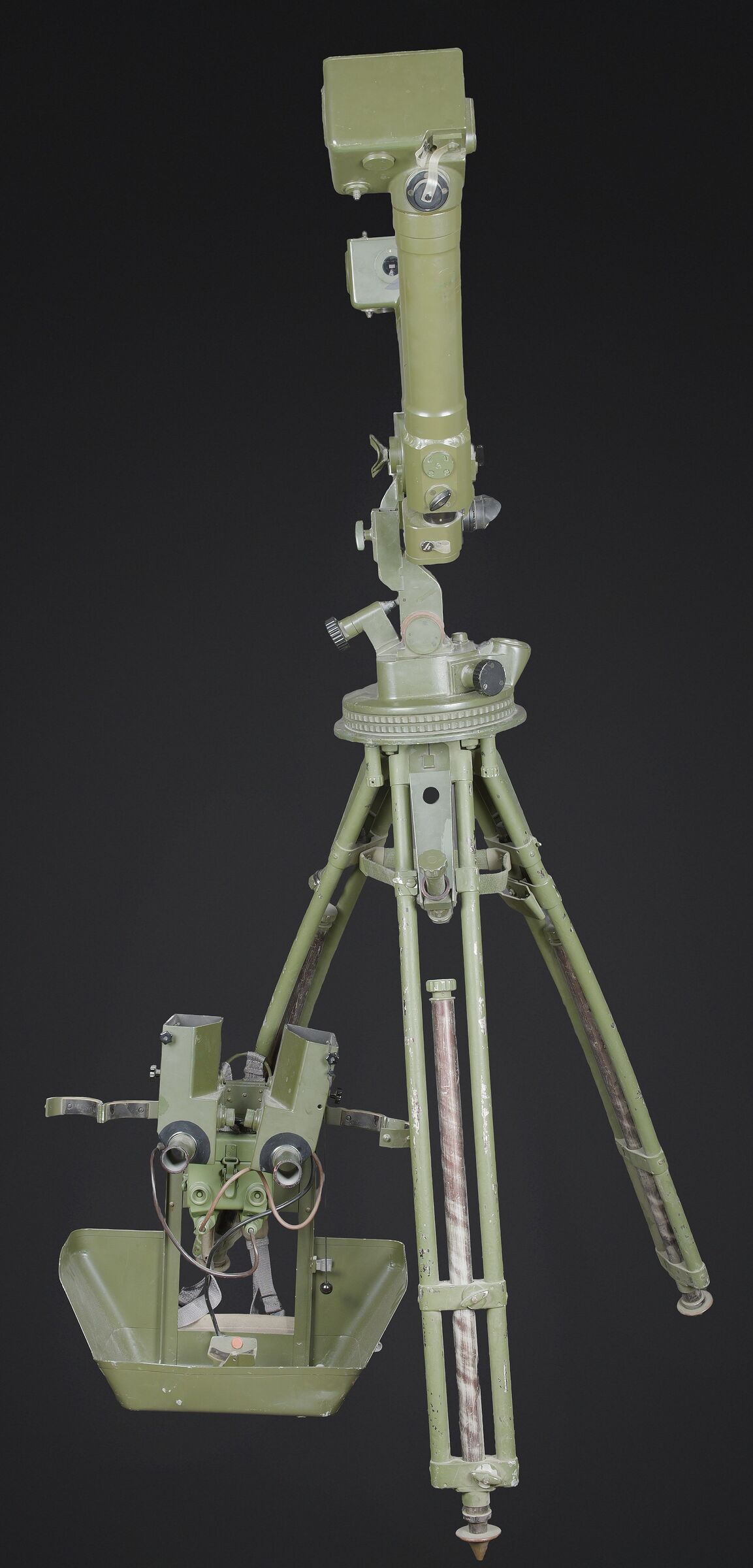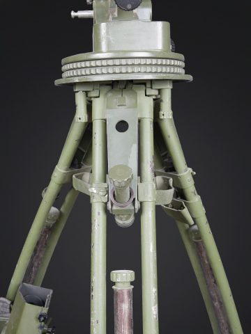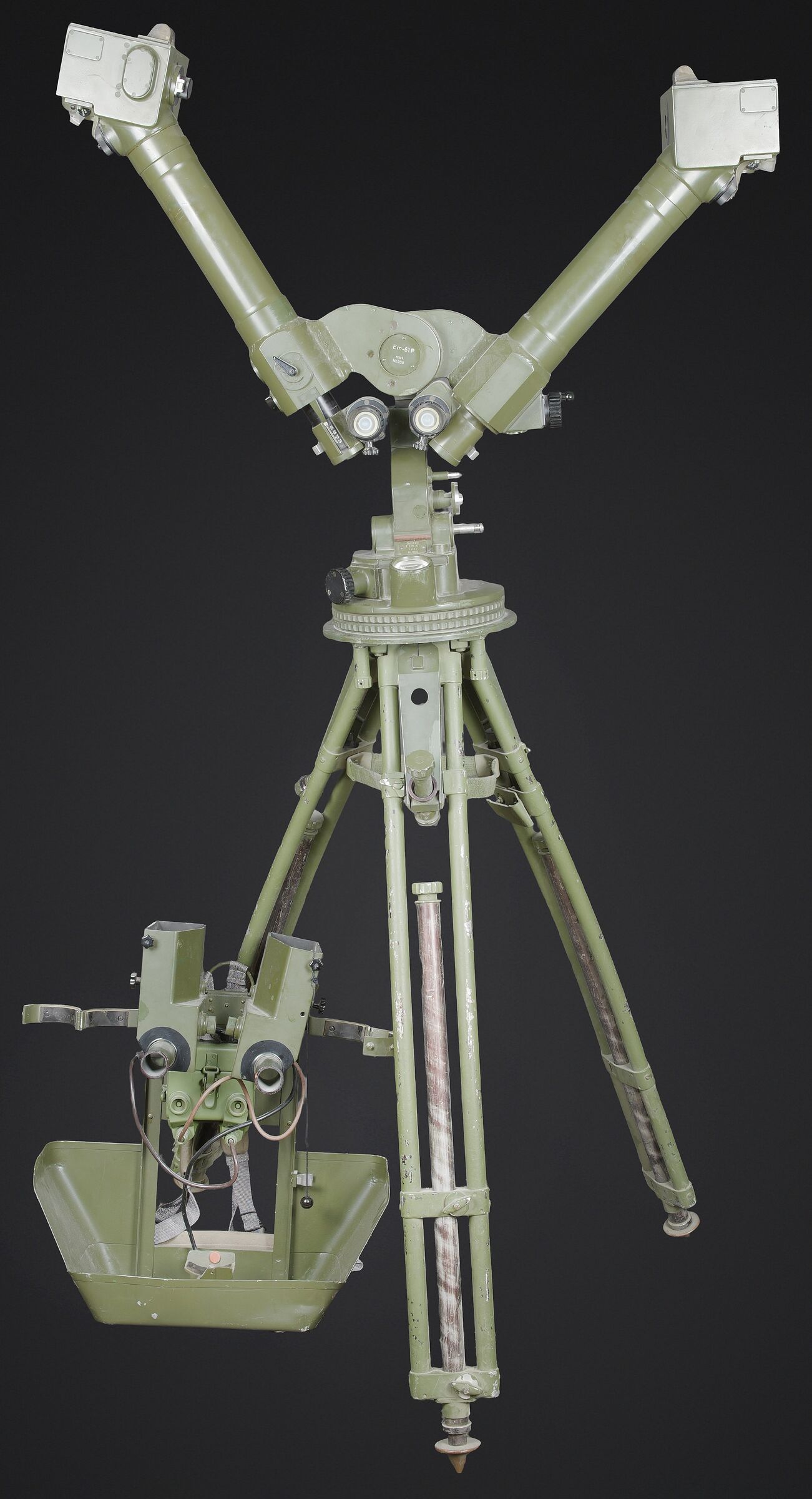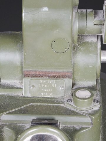 Télémètre EM-61. Premier télémètre stéréoscopique de la NVA. Système d’éclairage présent. Binoculaire en métal, support dorsal complet permettant de transporter l’optique. Les bretelles et les renforts dorsaux sont complets. Peinture kaki à 80%. Fabrication Carl Zeiss. Optique claire. Trépied en métal télescopique. Modèle dissociable en un trépied de plain pied et un trépied bas de campagne. Support d’optique présent. Marquages GESTELL EM 61 730 83 Nr860. Toutes les pièces mobiles sont fonctionnelles. A noter une certaine usure et patine de la pièce. Etat II+. EM-61 rangefinder First stereoscopic rangefinder of the NVA. Illumination system present. Metal binocular unit with complete back carrying frame, shoulder straps and padded back supports. Khaki paint 80% preserved. Manufactured by Carl Zeiss. Clear optics. Telescopic metal tripod convertible into a full-height tripod and a low field tripod. Optical mount present. Marked GESTELL EM 61 730 83 Nr 860. All moving parts functional. Note some wear and patina to the piece. Condition II+.