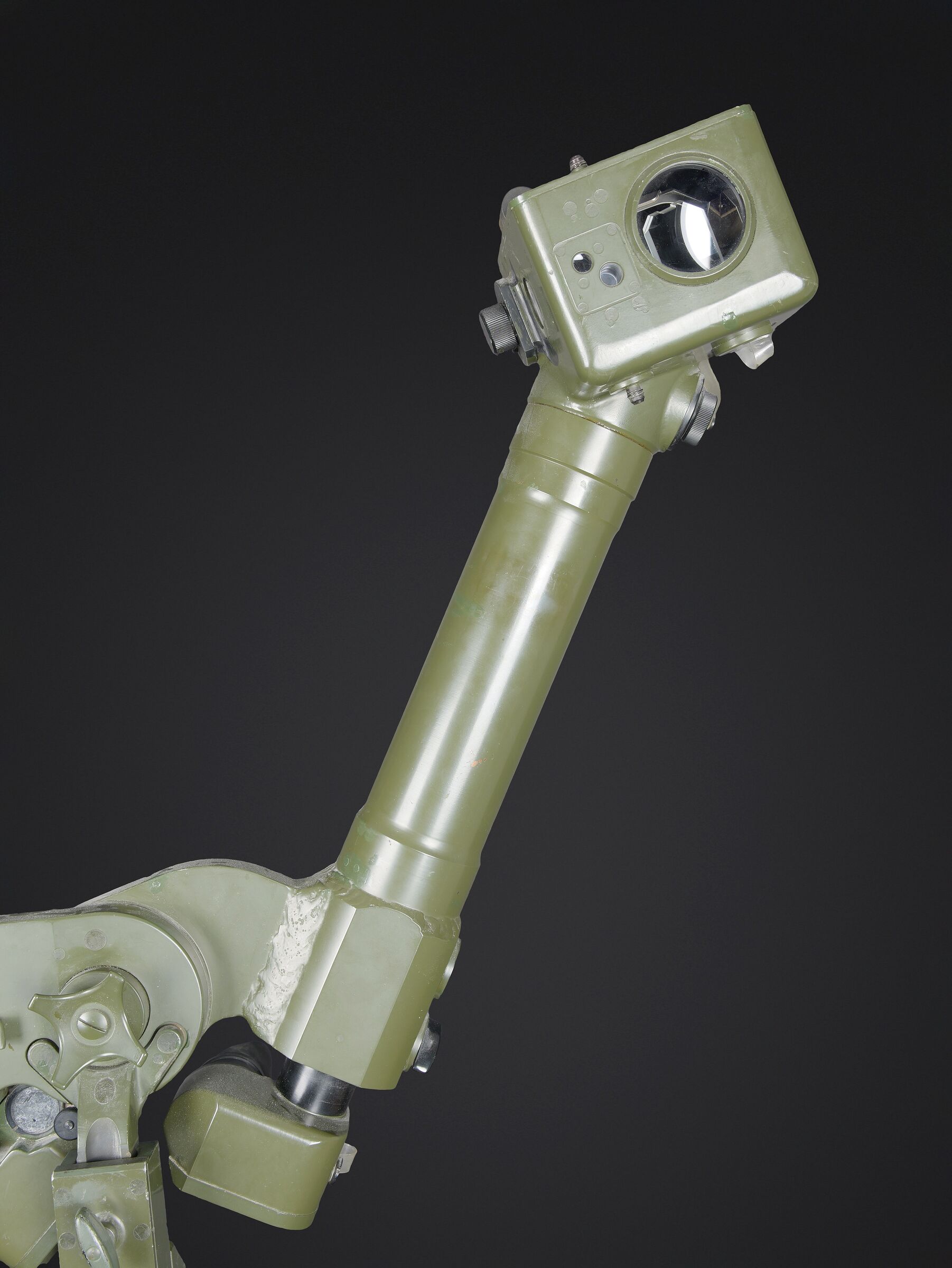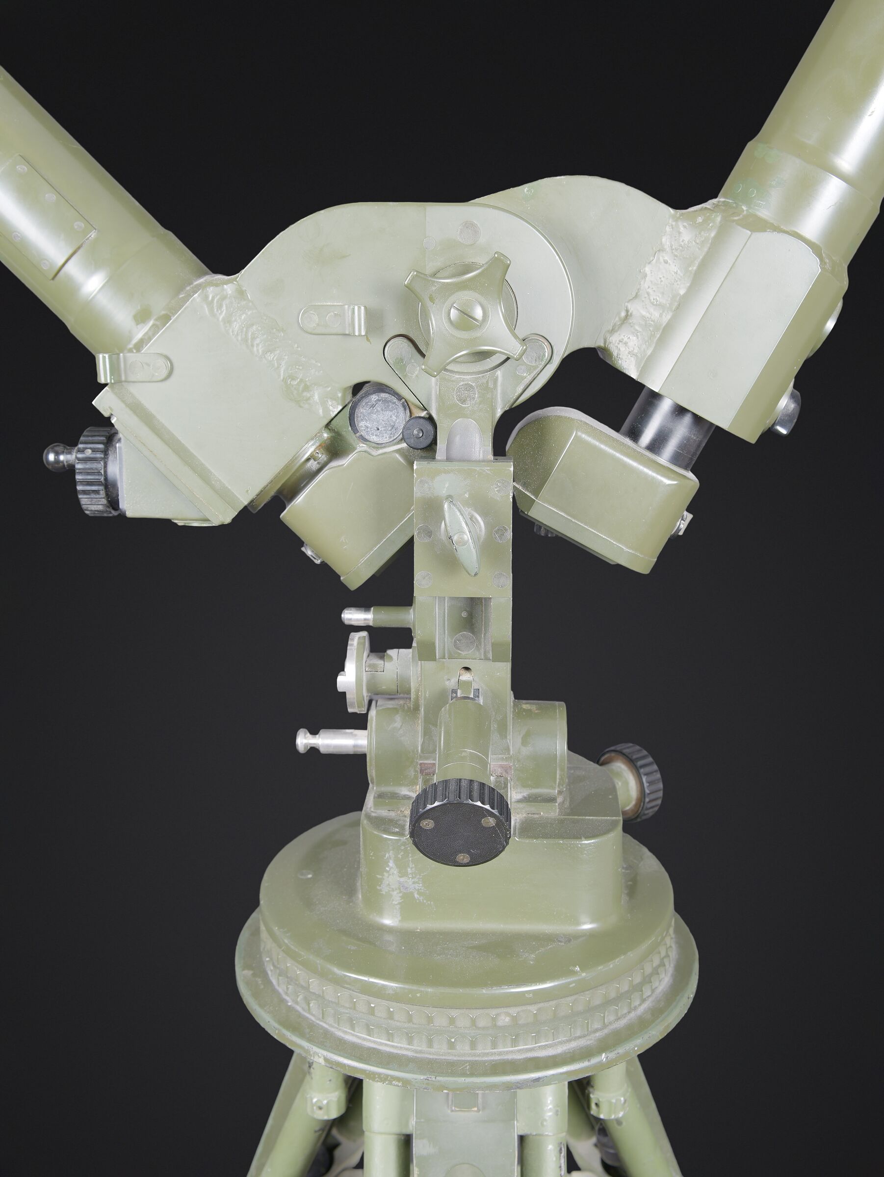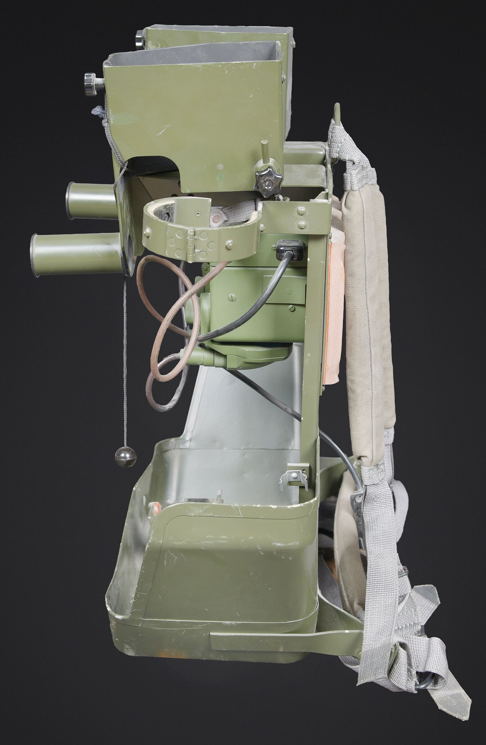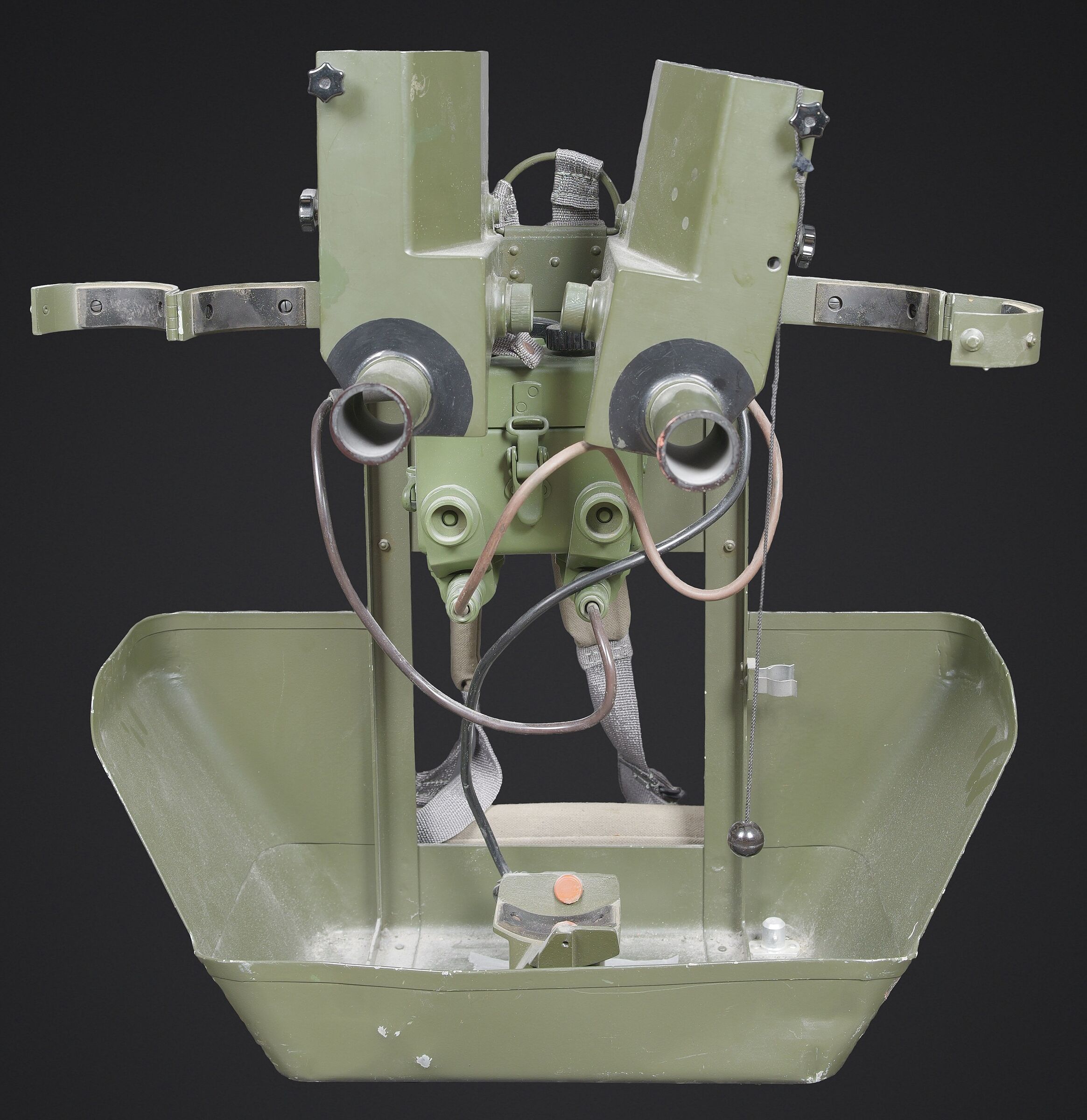 Télémètre EM-61. Premier télémètre stéréoscopique de la NVA. Système d’éclairage présent. Binoculaire en métal, support dorsal complet permettant de transporter l’optique. Les bretelles et les renforts dorsaux sont complets. Peinture kaki à 80%. Fabrication Carl Zeiss. Optique claire. Trépied en métal télescopique. Modèle dissociable en un trépied de plain pied et un trépied bas de campagne. Support d’optique présent. Marquages GESTELL EM 61 730 83 Nr860. Toutes les pièces mobiles sont fonctionnelles. A noter une certaine usure et patine de la pièce. Etat II+. EM-61 rangefinder First stereoscopic rangefinder of the NVA. Illumination system present. Metal binocular unit with complete back carrying frame, shoulder straps and padded back supports. Khaki paint 80% preserved. Manufactured by Carl Zeiss. Clear optics. Telescopic metal tripod convertible into a full-height tripod and a low field tripod. Optical mount present. Marked GESTELL EM 61 730 83 Nr 860. All moving parts functional. Note some wear and patina to the piece. Condition II+.