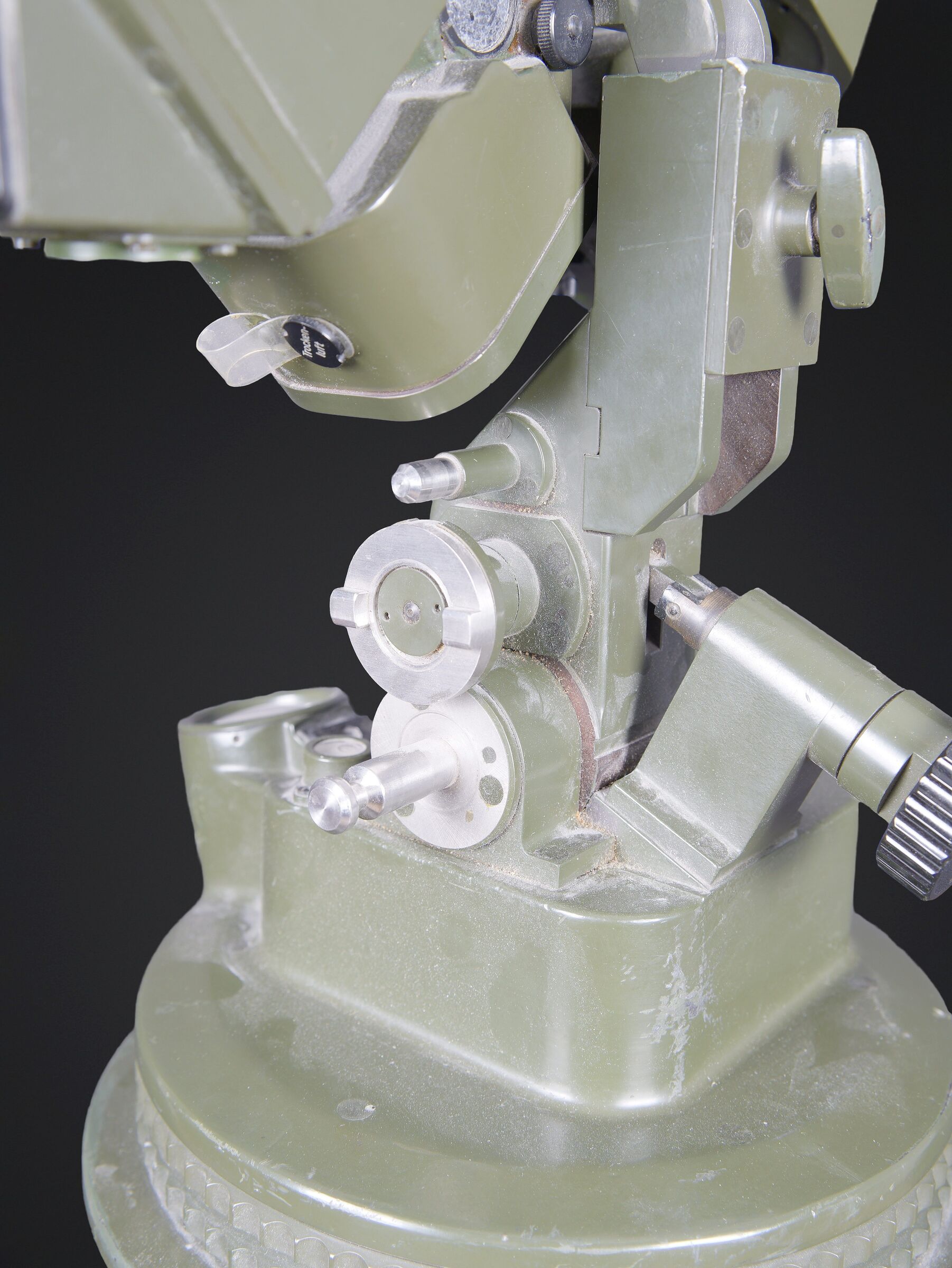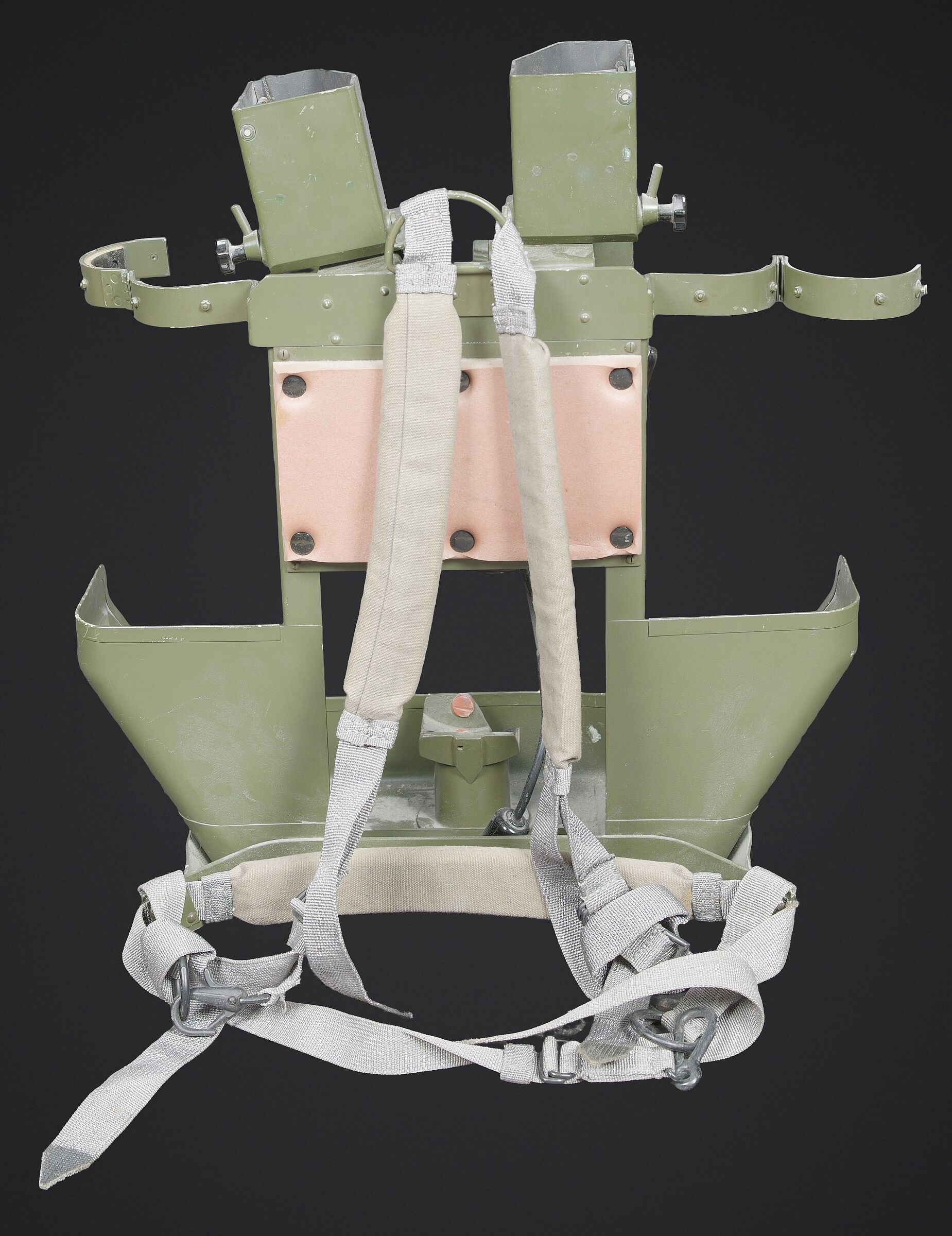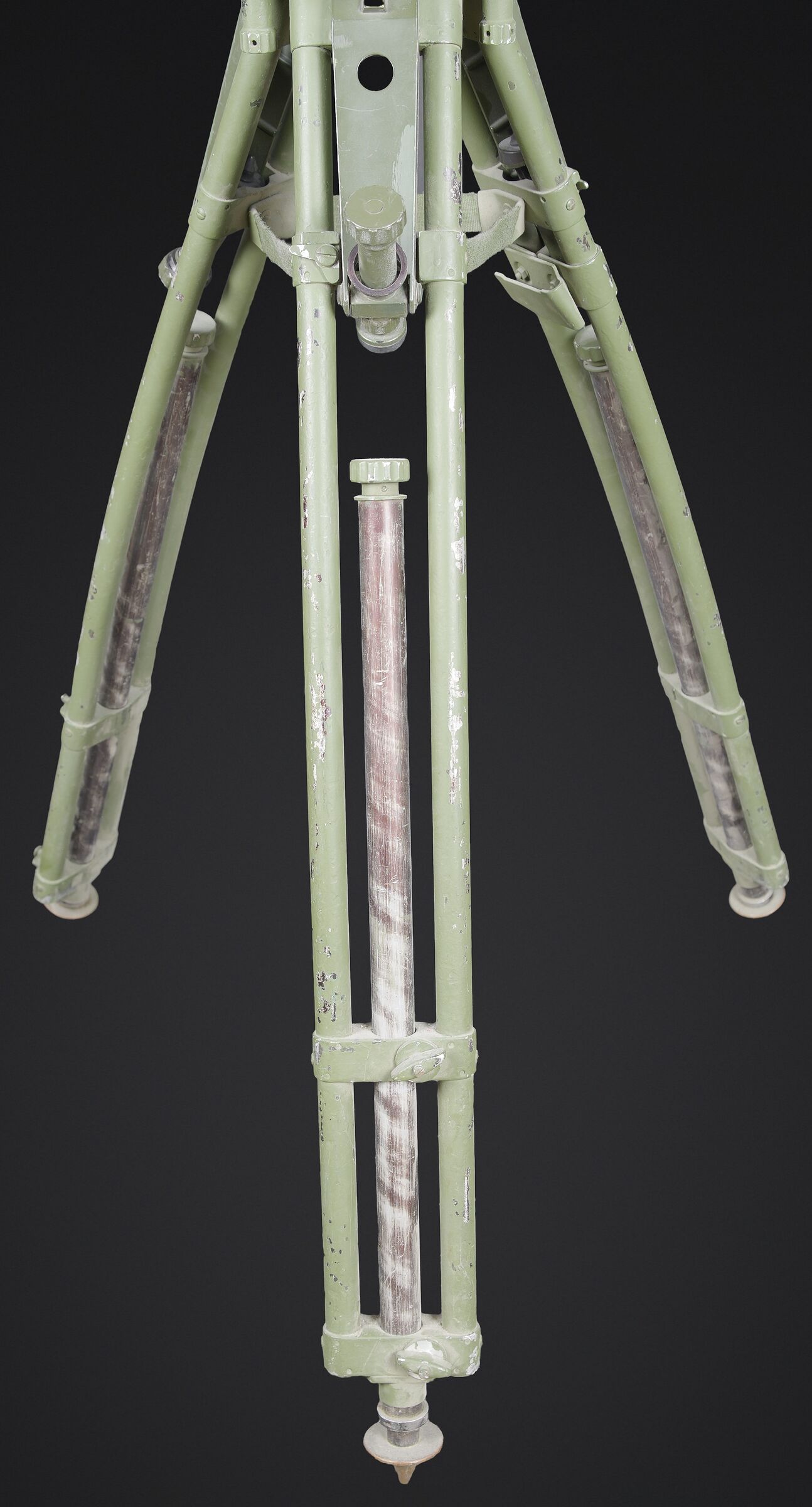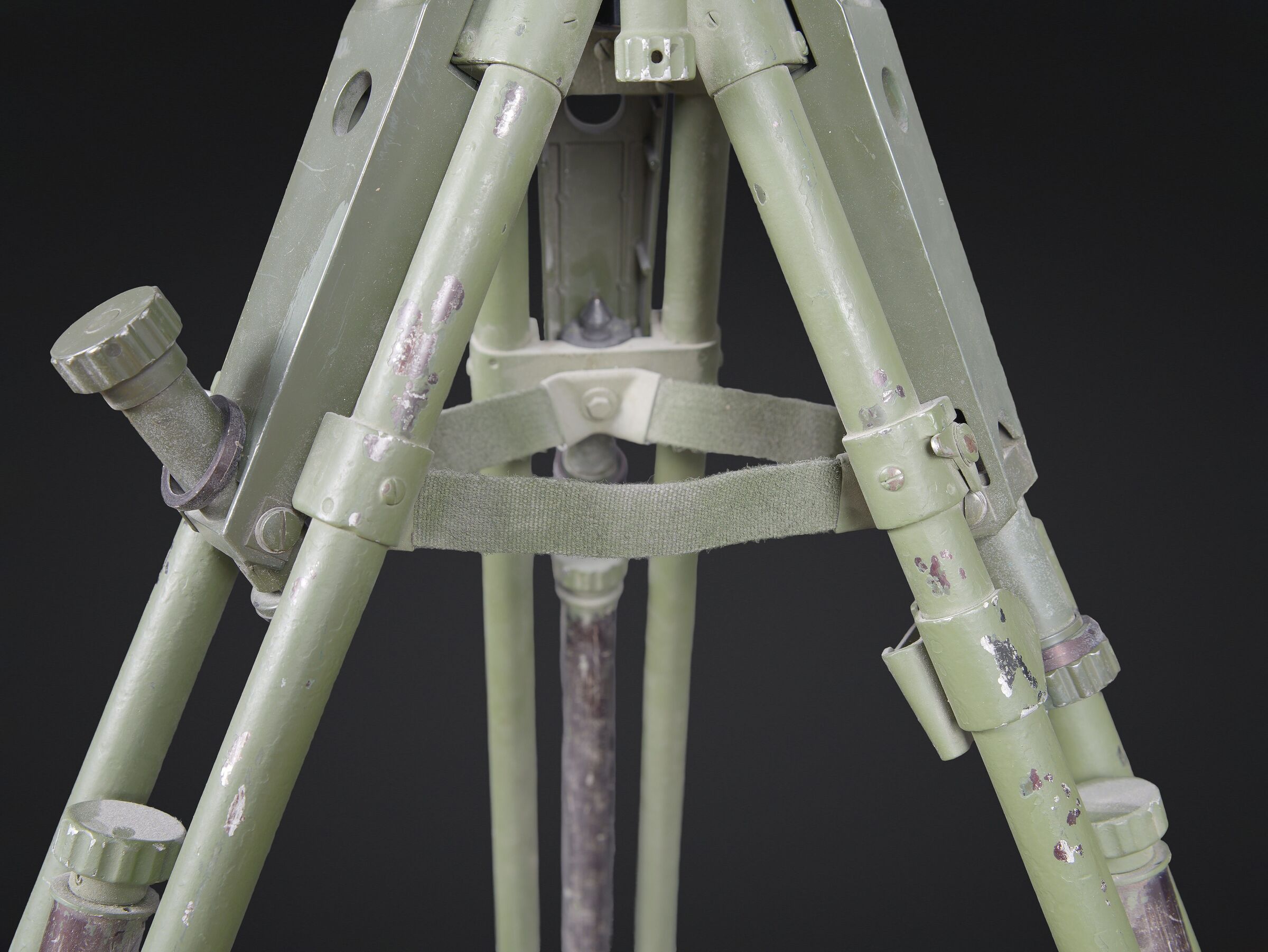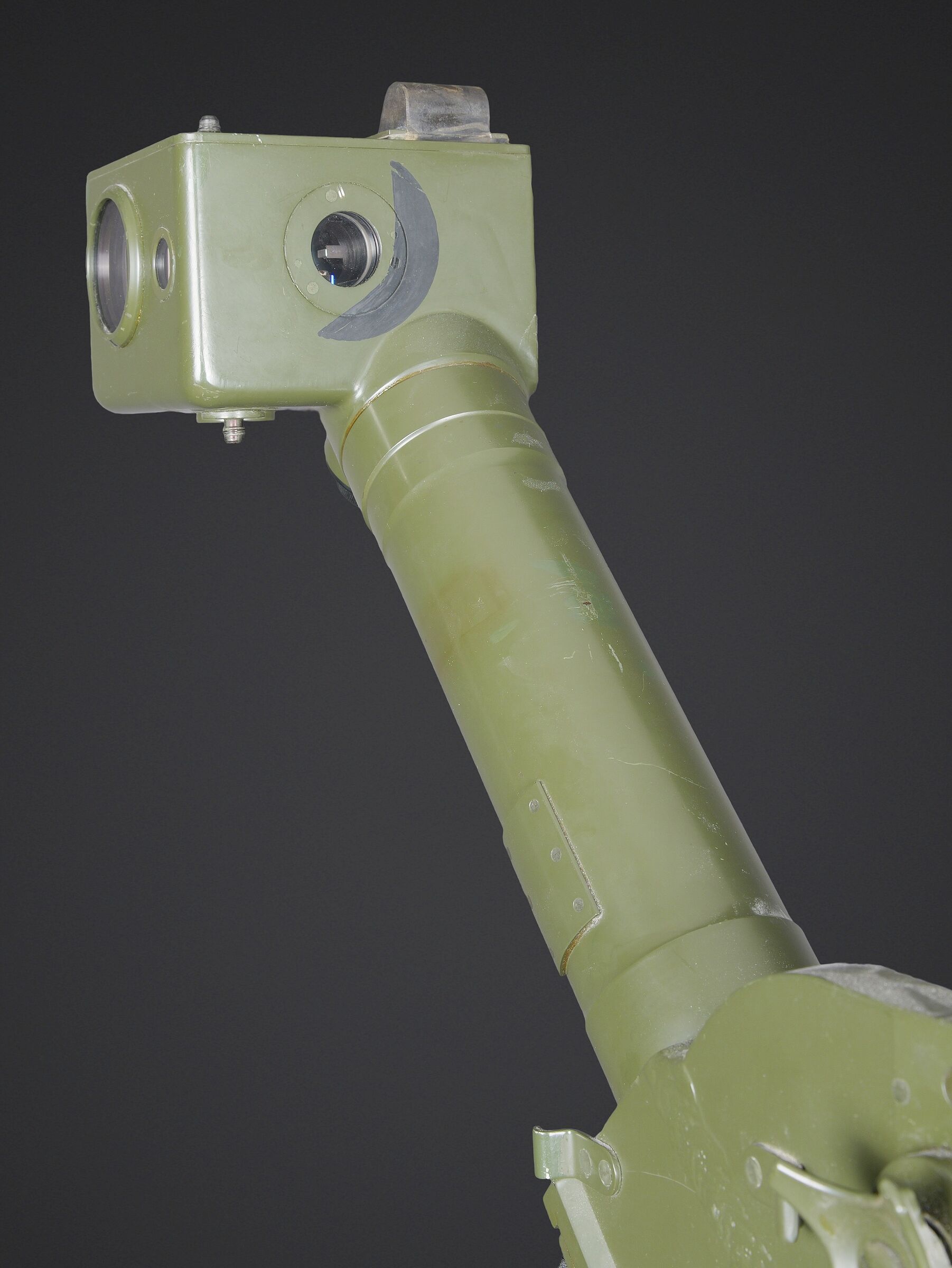 Télémètre EM-61. Premier télémètre stéréoscopique de la NVA. Système d’éclairage présent. Binoculaire en métal, support dorsal complet permettant de transporter l’optique. Les bretelles et les renforts dorsaux sont complets. Peinture kaki à 80%. Fabrication Carl Zeiss. Optique claire. Trépied en métal télescopique. Modèle dissociable en un trépied de plain pied et un trépied bas de campagne. Support d’optique présent. Marquages GESTELL EM 61 730 83 Nr860. Toutes les pièces mobiles sont fonctionnelles. A noter une certaine usure et patine de la pièce. Etat II+. EM-61 rangefinder First stereoscopic rangefinder of the NVA. Illumination system present. Metal binocular unit with complete back carrying frame, shoulder straps and padded back supports. Khaki paint 80% preserved. Manufactured by Carl Zeiss. Clear optics. Telescopic metal tripod convertible into a full-height tripod and a low field tripod. Optical mount present. Marked GESTELL EM 61 730 83 Nr 860. All moving parts functional. Note some wear and patina to the piece. Condition II+.