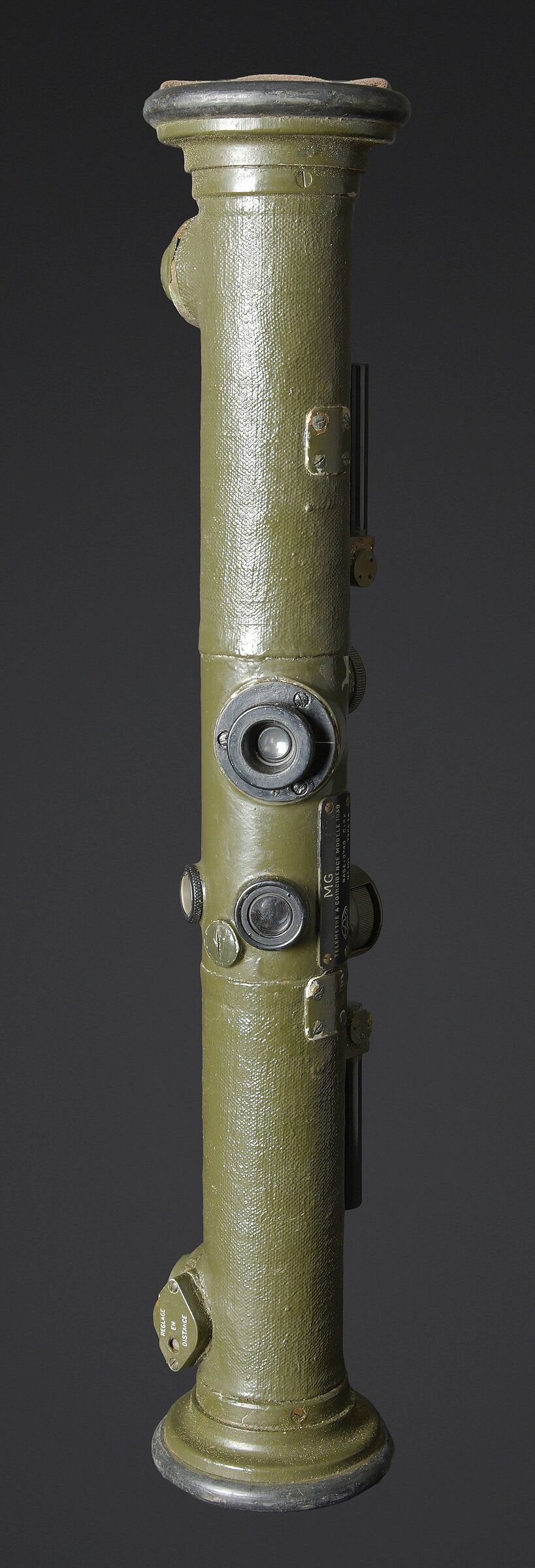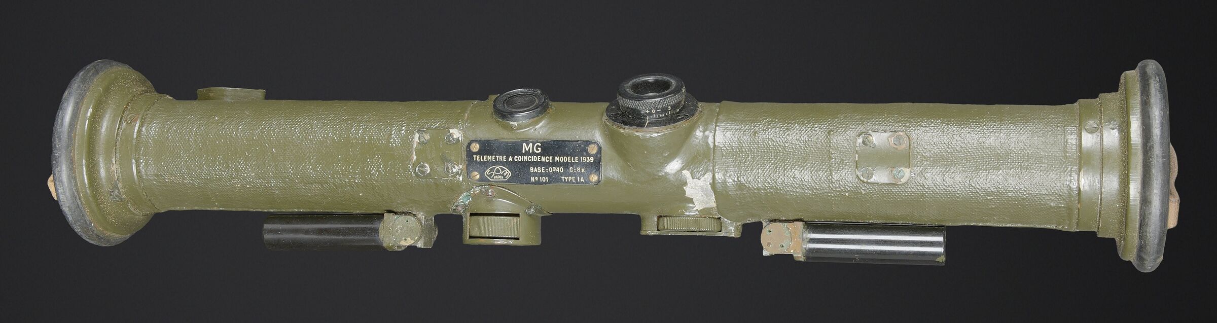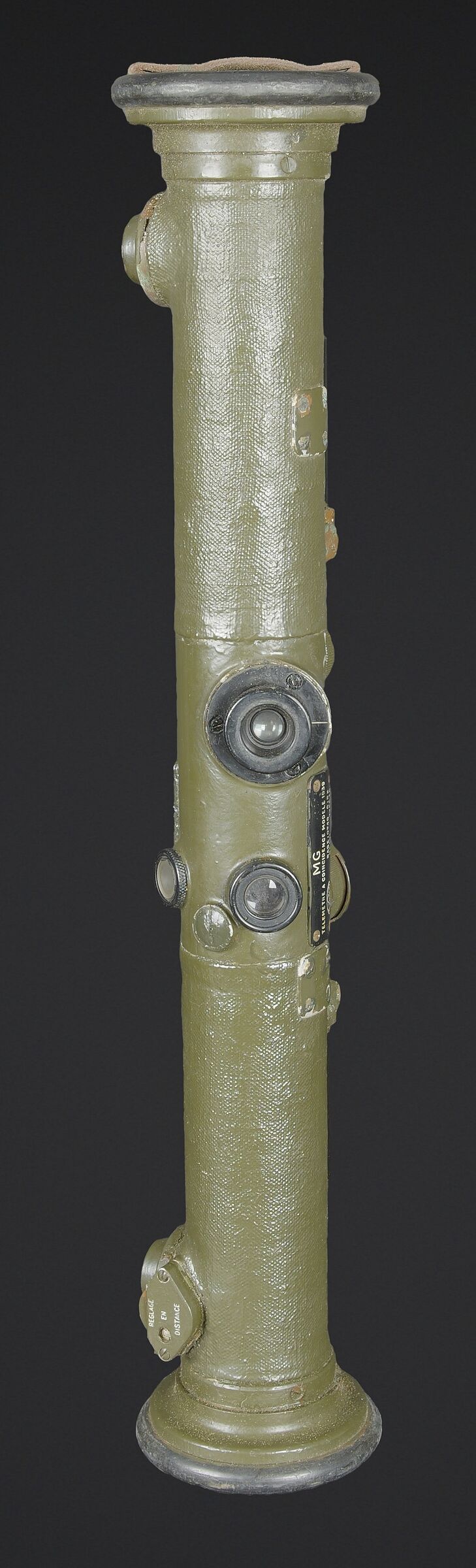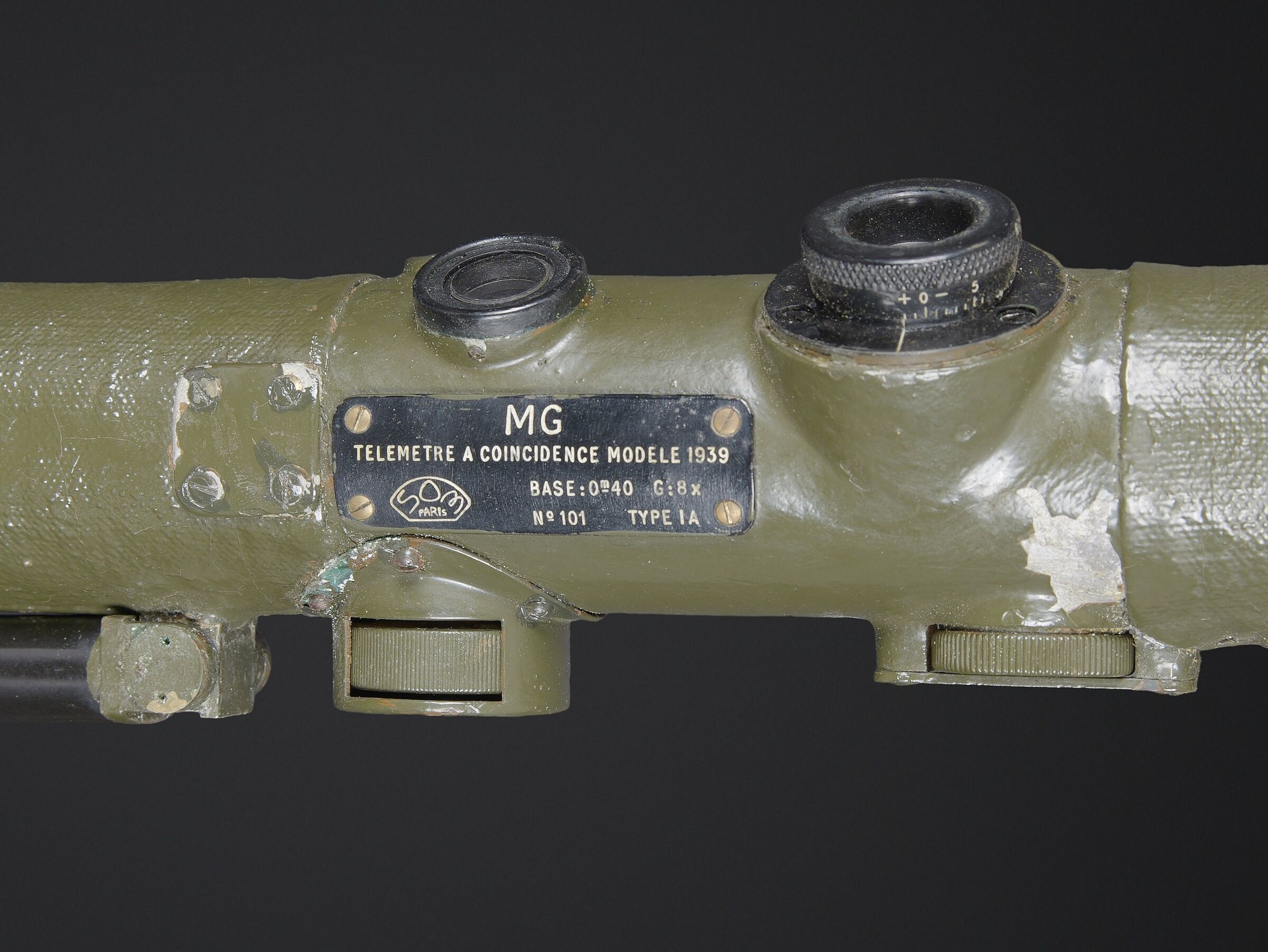 Télémètre français SOM. Belle housse en forme de tube, toutes les sangles sont présentes. Quelques manques au niveau de la couleur. Couverture marquée SOM PARIS 51. Petit télémètre en métal, peinture kaki à 70%. Les deux poignées en bakélite sont rabattables. Optique claire avec quelques tâches. Plaque marquée MG Télémètre a coïncidence MD 1939 N 101 Type IA. A noter une certaine usure et patine de la pièce. Etat II+. La SOM (Société d’Optique et de Mécanique de haute précision), située à Paris, est un fabricant historique français renommé, souvent associé à SOM Berthiot. Dans le domaine des télémètres, cette entreprise a produit du matériel optique de précision, notamment des télémètres stéréoscopiques ou à coïncidence, utilisés principalement par l’armée ou la marine avant l’ère laser. French SOM rangefinder. Fine tubular cover with all straps present and minor losses to the colour. Cover marked SOM Paris 51. Small metal rangefinder retaining approximately 70% of its khaki paint, with both folding bakelite handles. Clear optics with a few spots. Plate marked MG Télémètre à coïncidence Mle 1939 No. 101 Type IA. Noteworthy overall wear and an attractive period patina. Condition II+. The SOM (Société d’Optique et de Mécanique de haute précision) of Paris was a renowned historic manufacturer of precision optical equipment, particularly coincidence and stereoscopic rangefinders used by the armed forces and navy before the laser era.